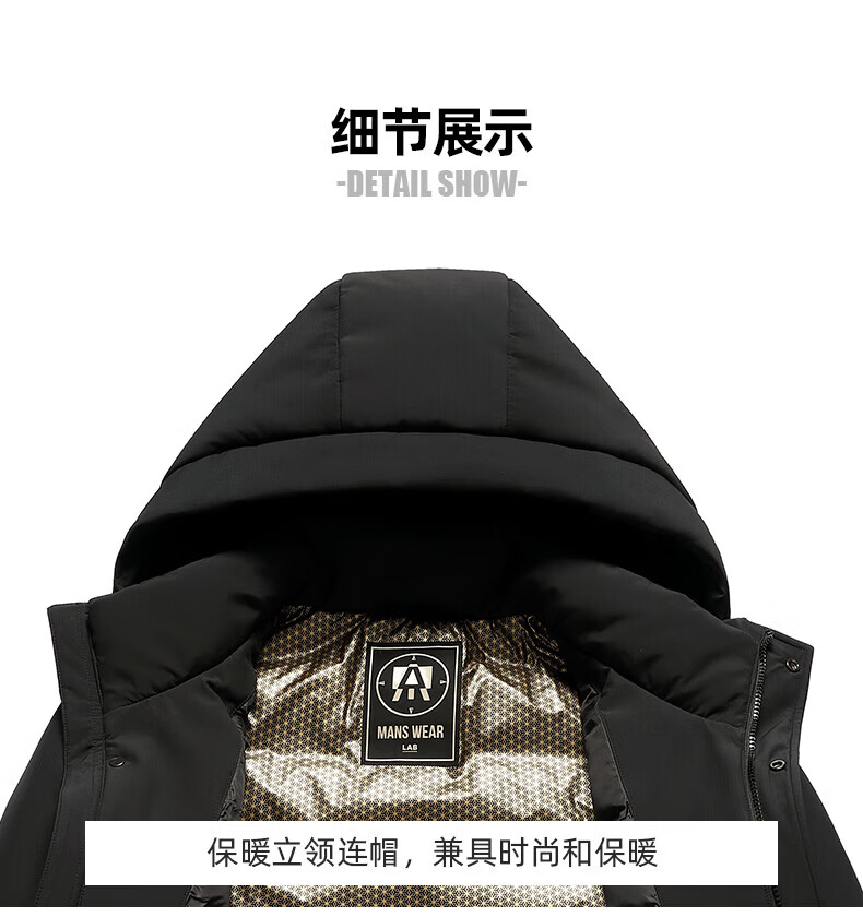 罗蒙(ROMON)可卸连帽男士棉服中长款2025冬季新款加绒保暖棉衣外套爸爸装棉袄 黑色 2XL (建议体重130-145斤)