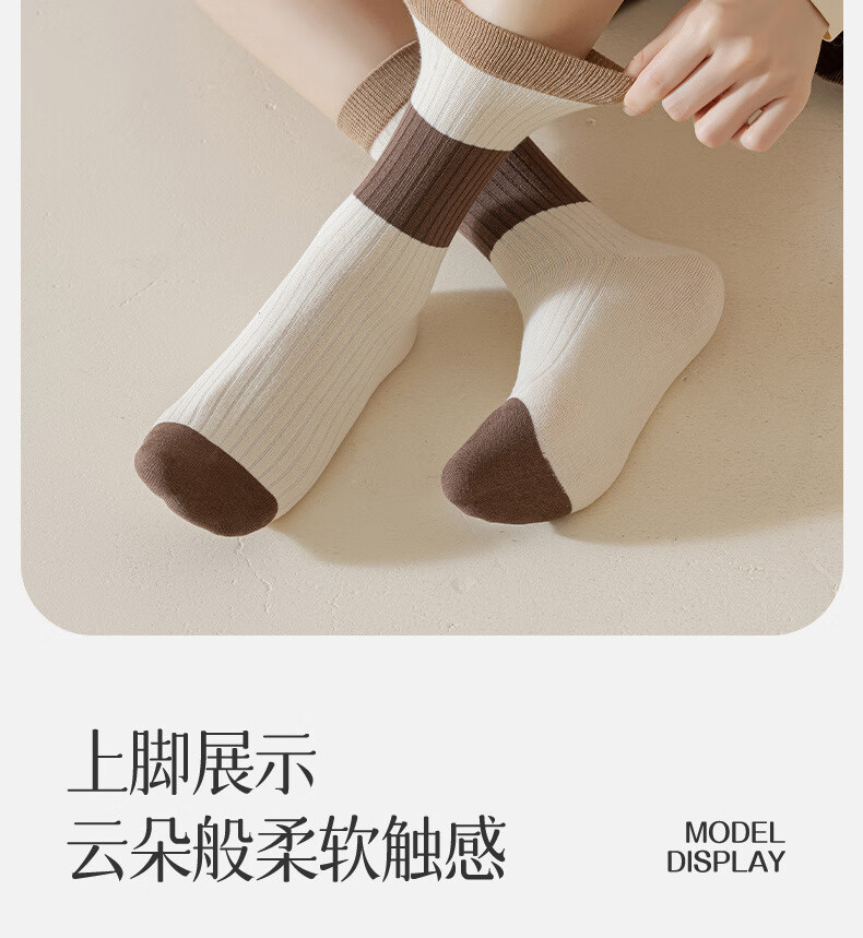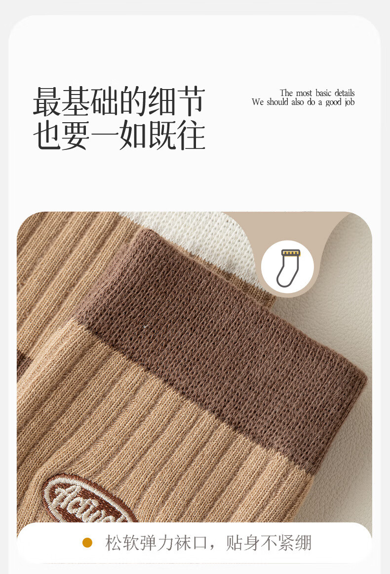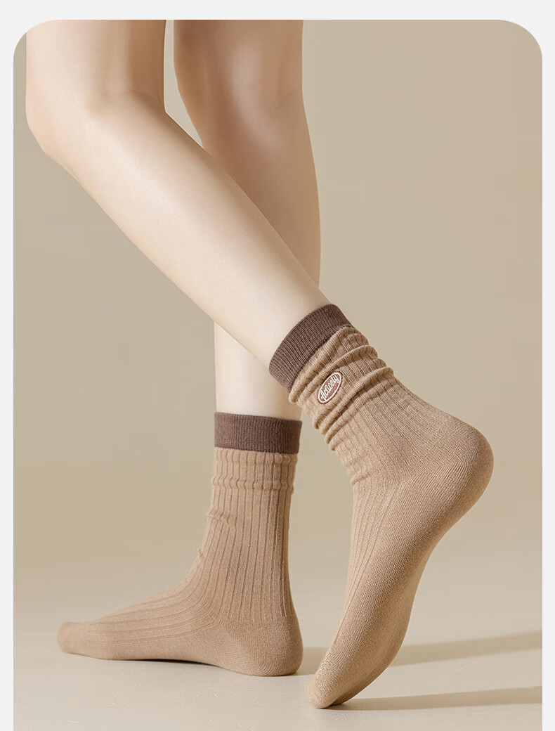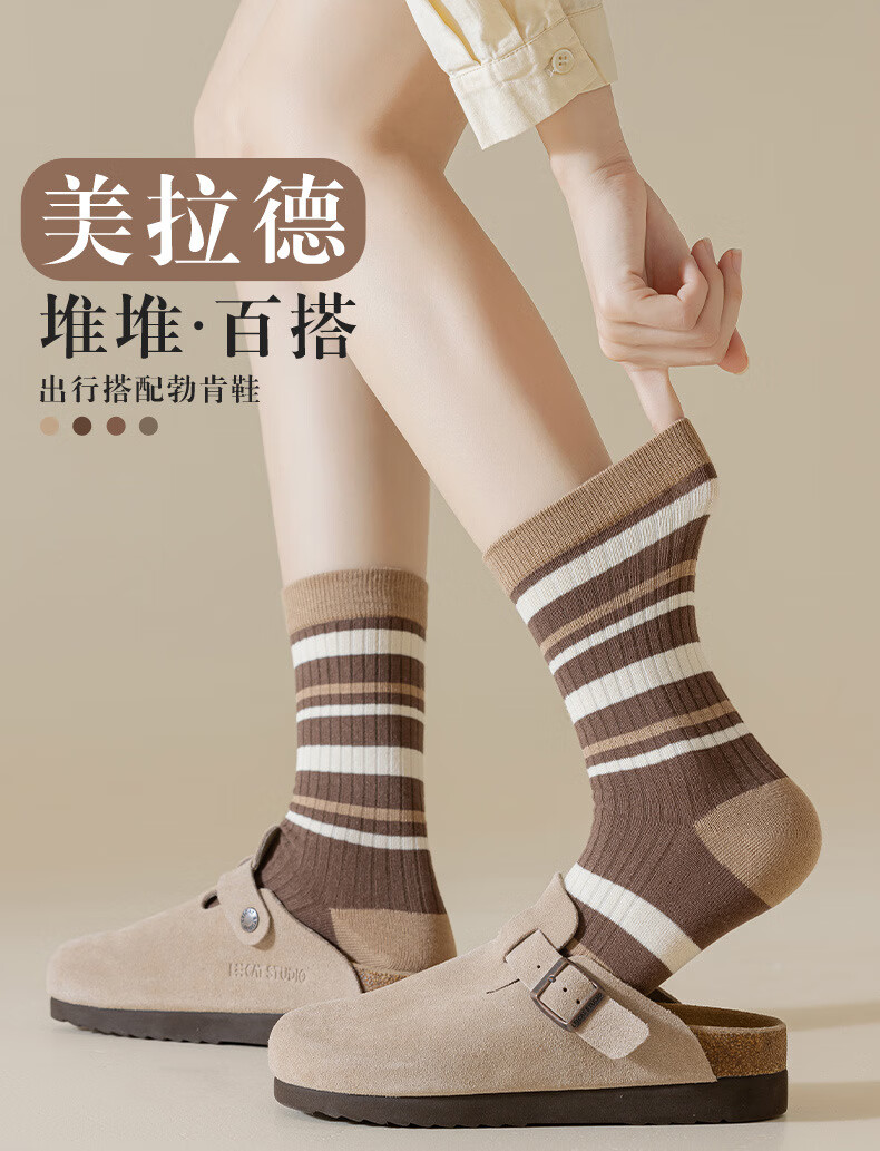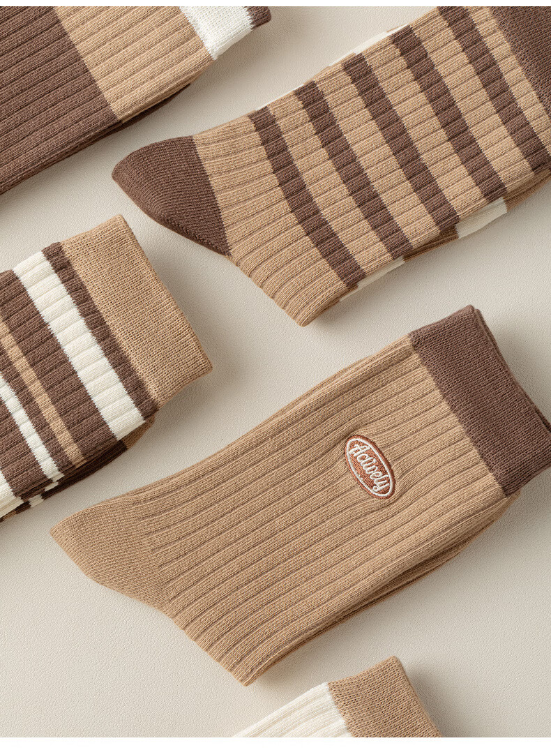 雅鹿女袜美拉德色系秋冬季撞色复古条纹堆堆袜中筒袜美式潮流百搭袜子 白条纹2双+卡其2双+卡棕拼 【5双】 均码