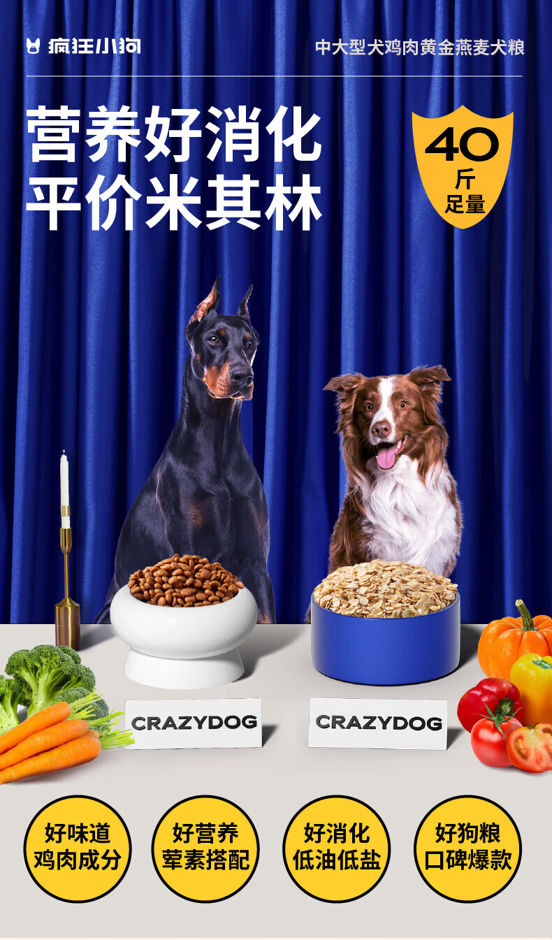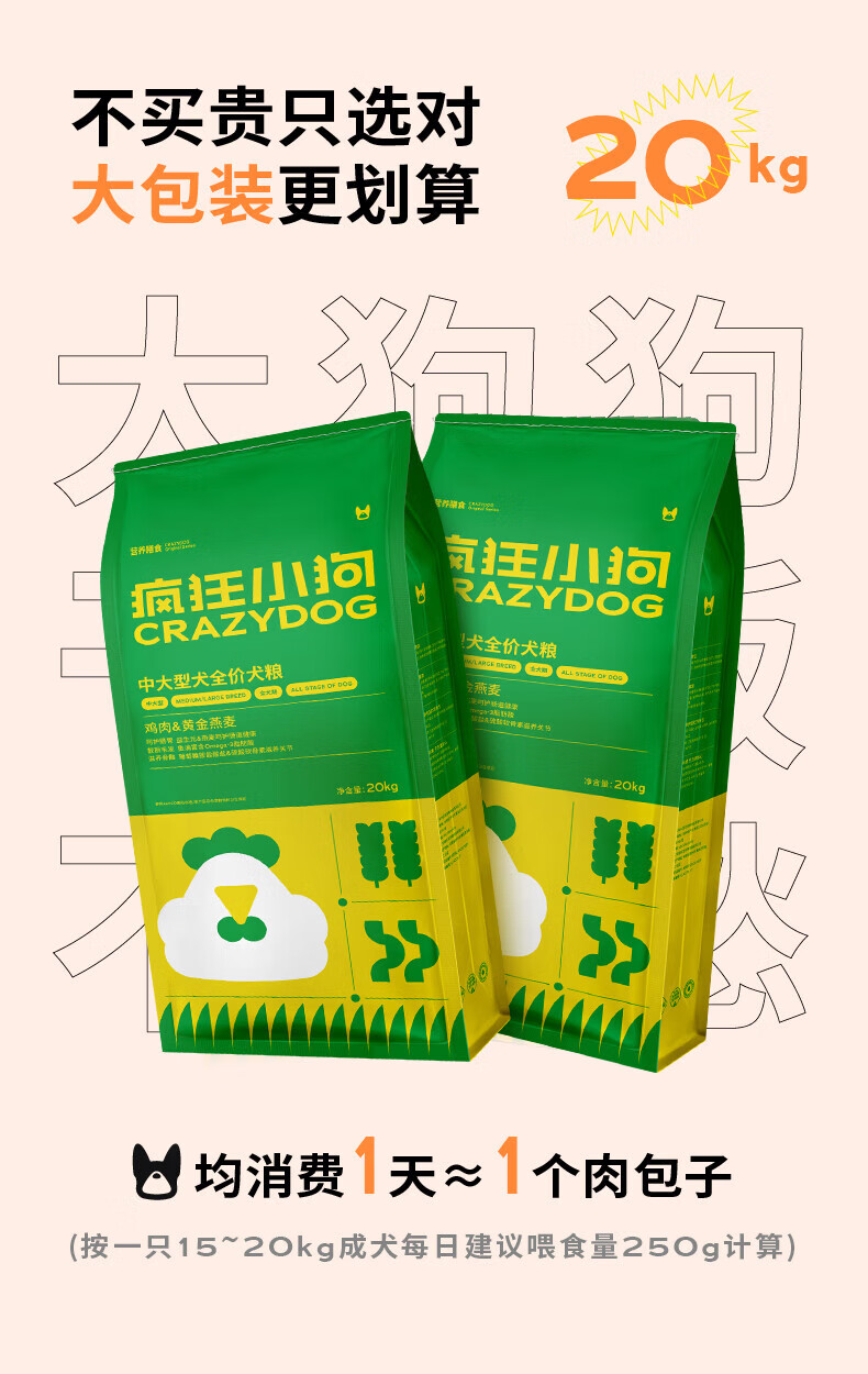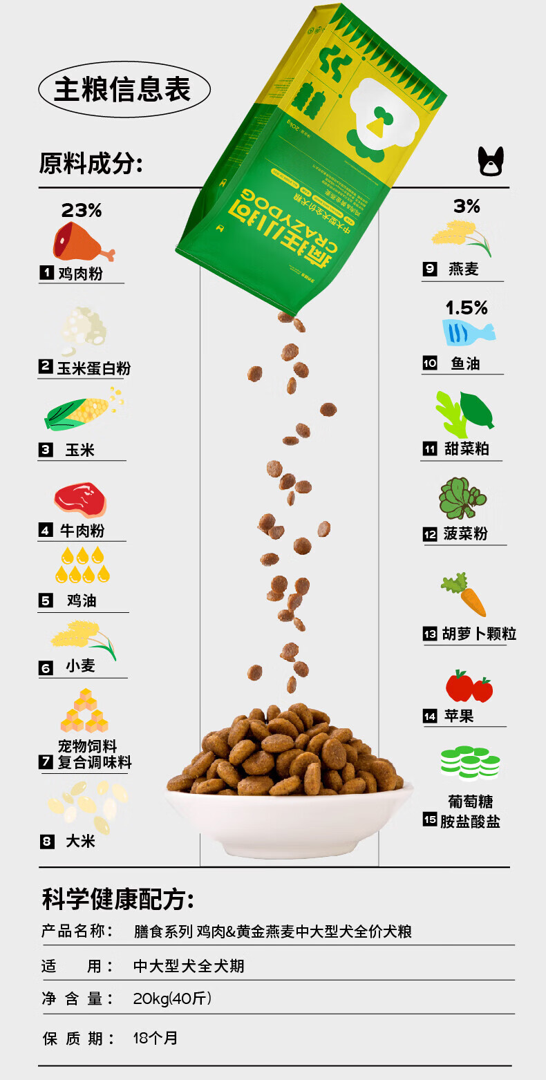 疯狂小狗狗粮金毛边牧拉布拉多哈士奇中大型犬幼犬成犬狗粮鸡肉燕麦低脂 添加燕麦|通用20kg