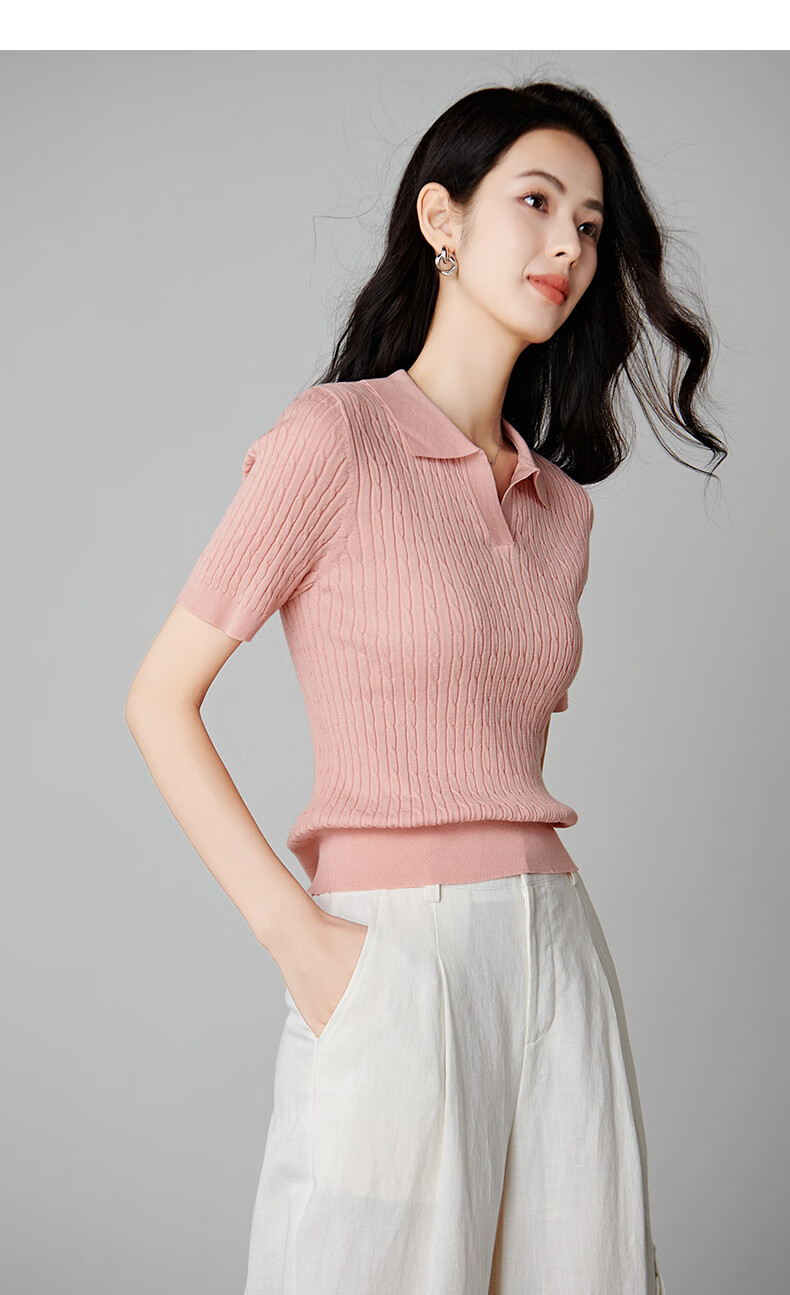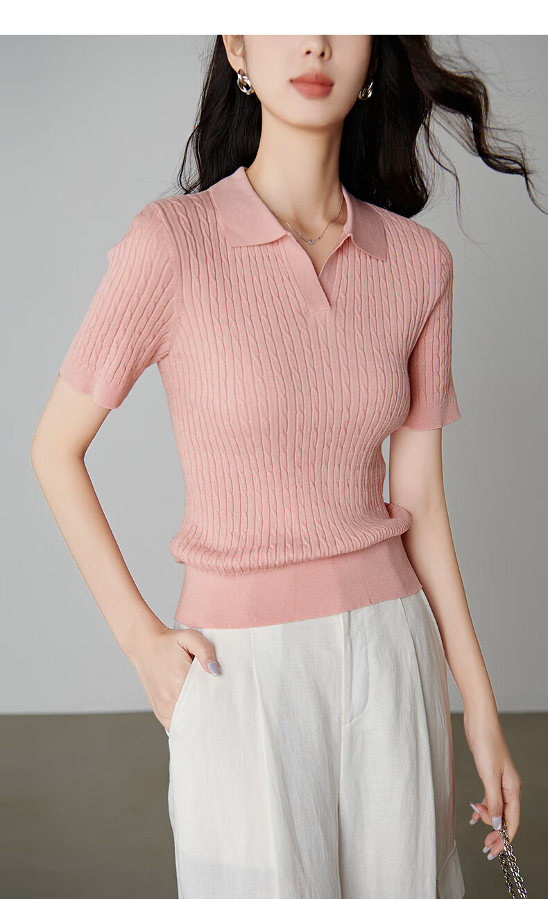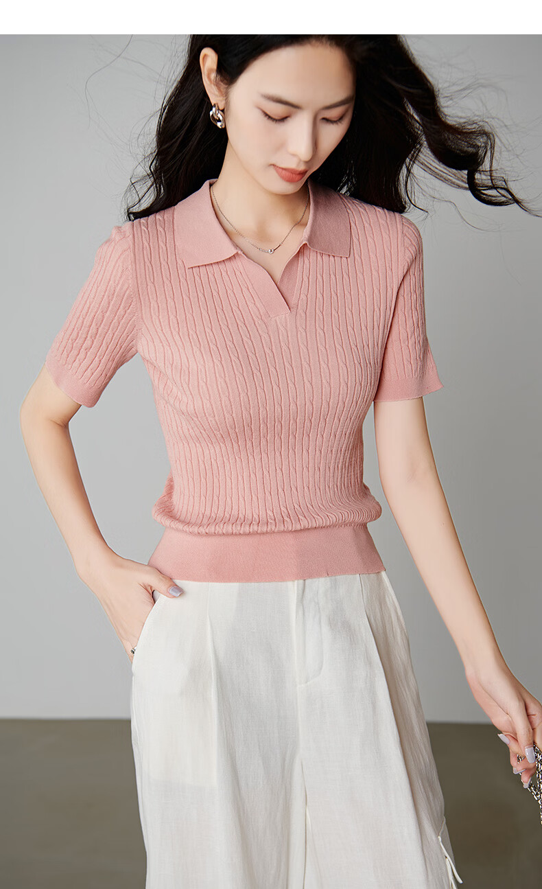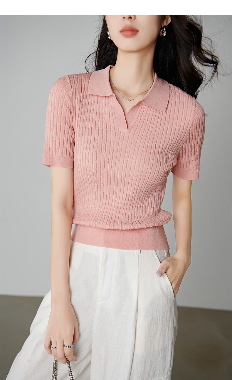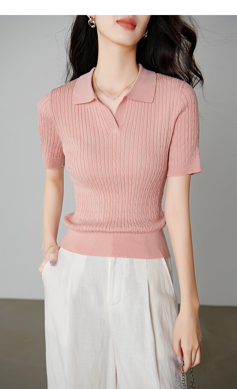 晚白【新品】2026年春款时尚温柔翻领POLO衫弹力修身短袖针织衫女 粉色 S