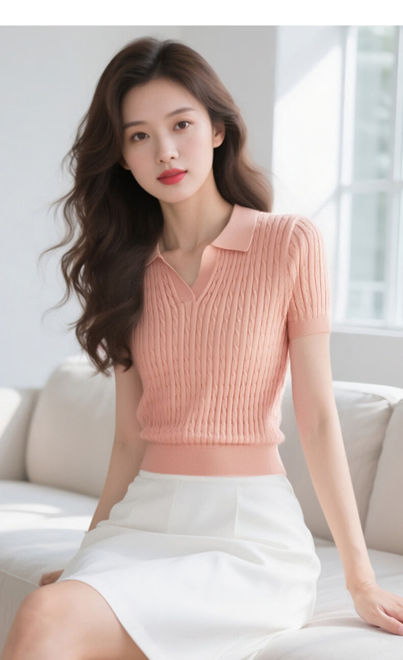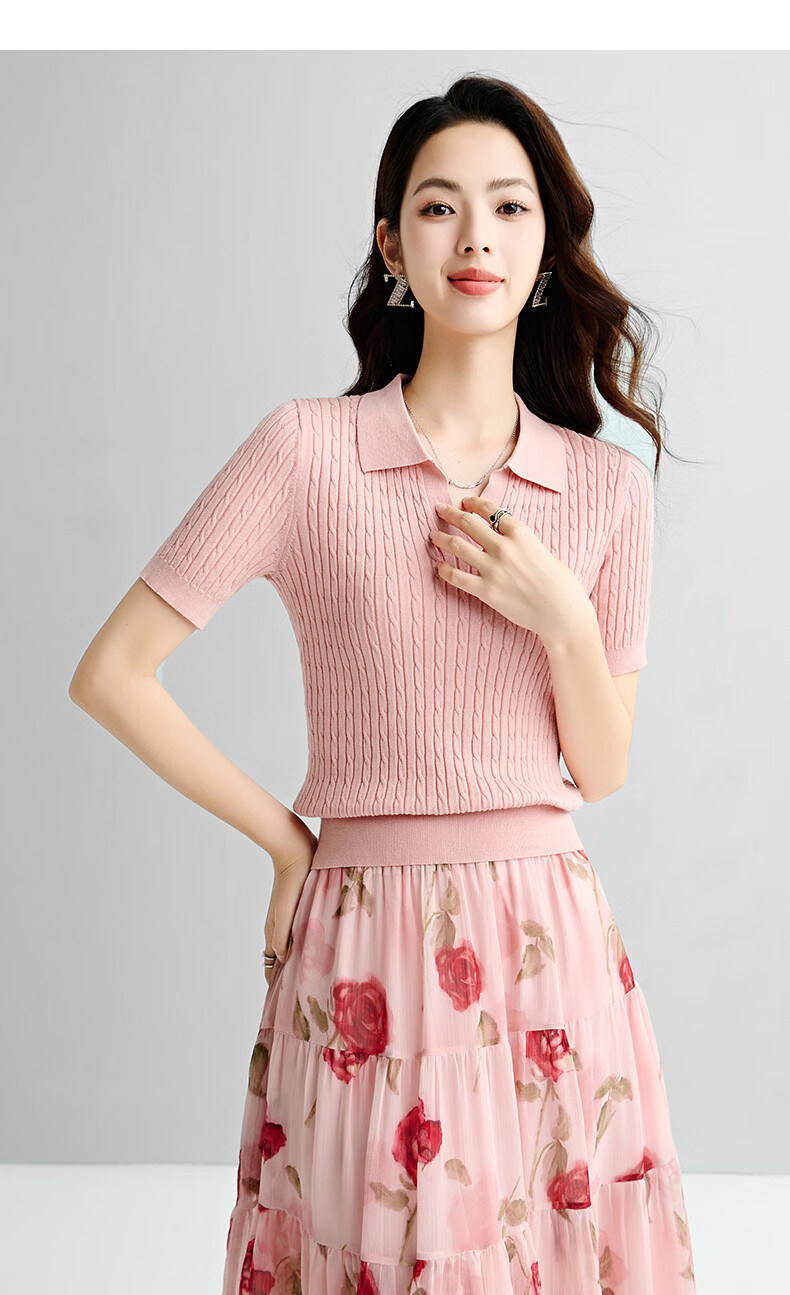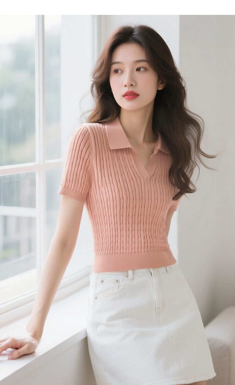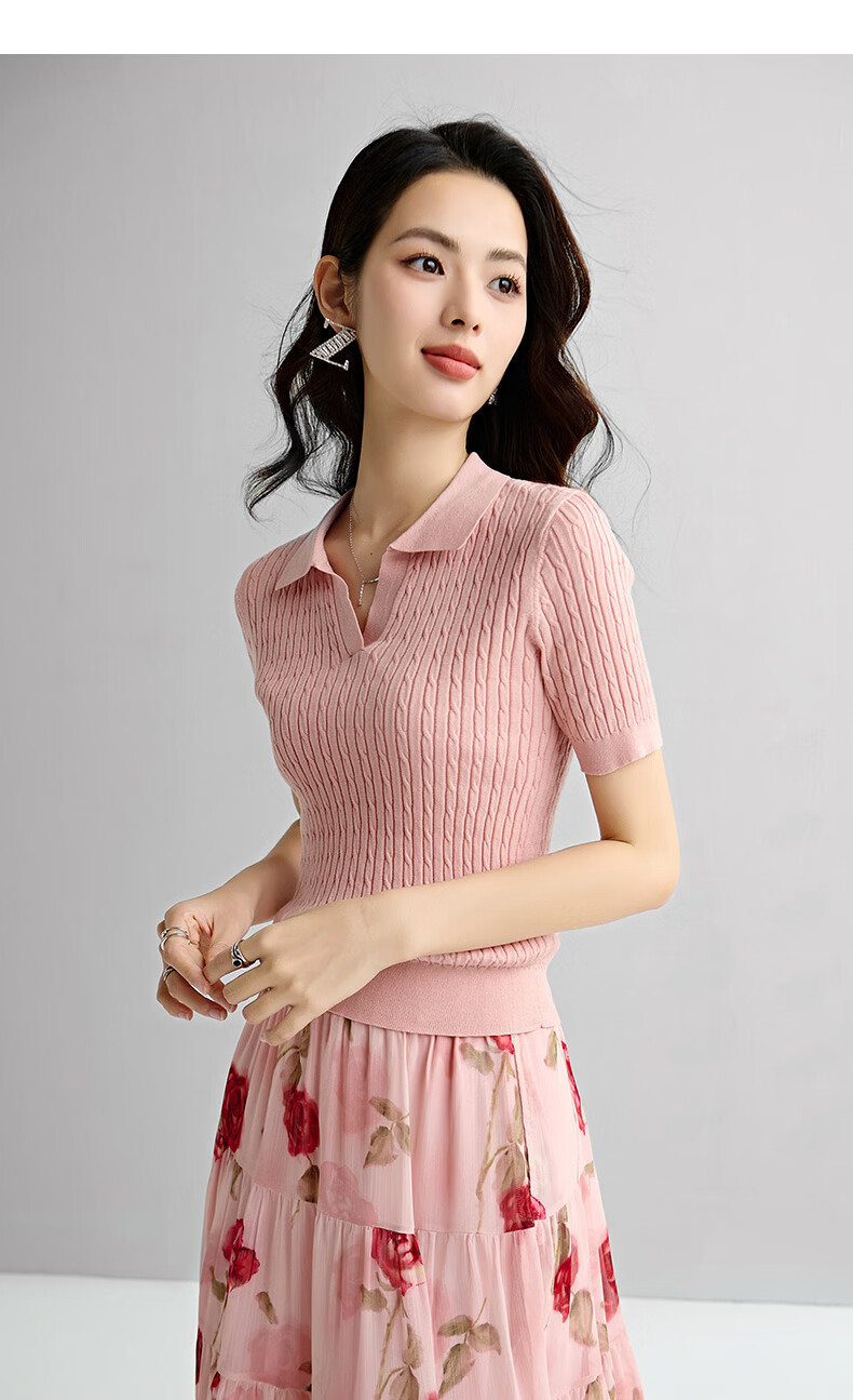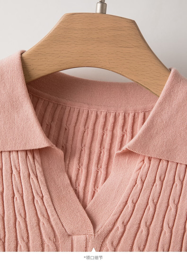 晚白【新品】2026年春款时尚温柔翻领POLO衫弹力修身短袖针织衫女 粉色 S