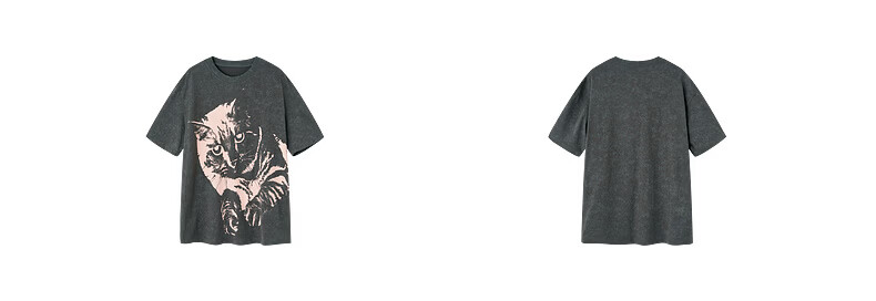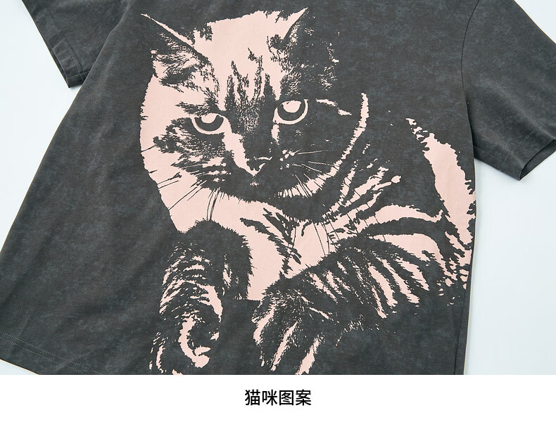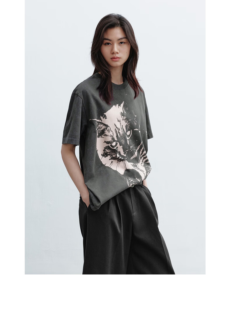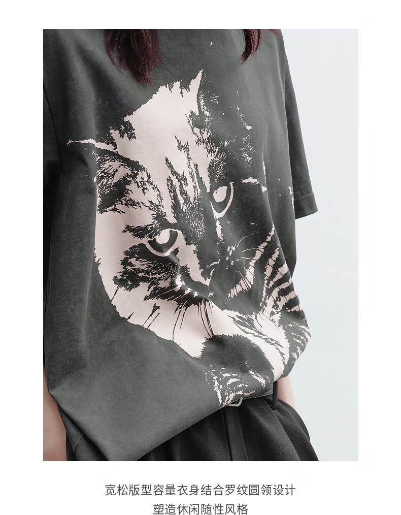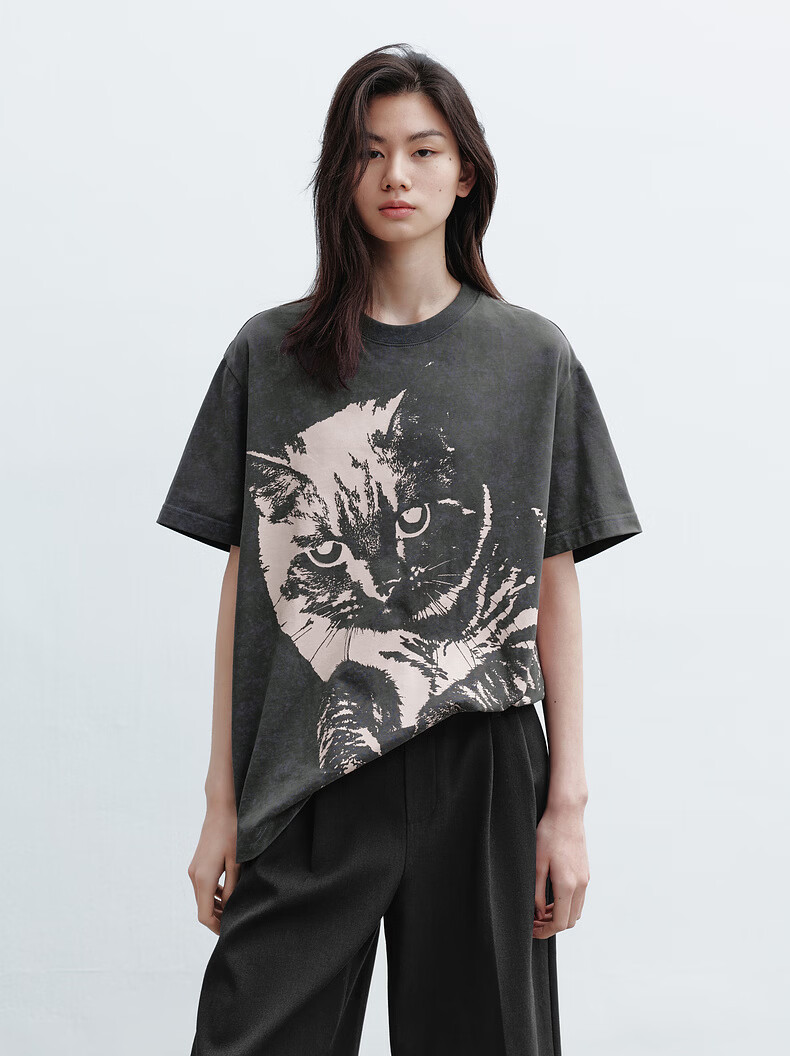 H's烟灰色短袖T恤女26年春季新款高级设计感100棉猫咪印花宽松上衣 烟灰色 M