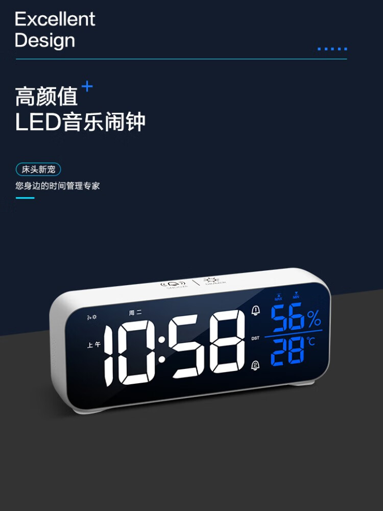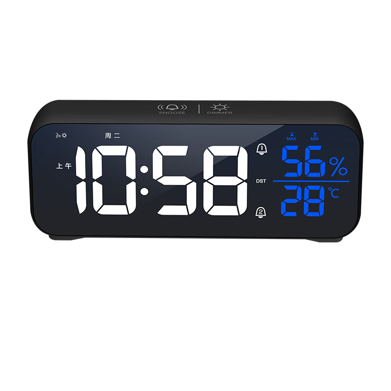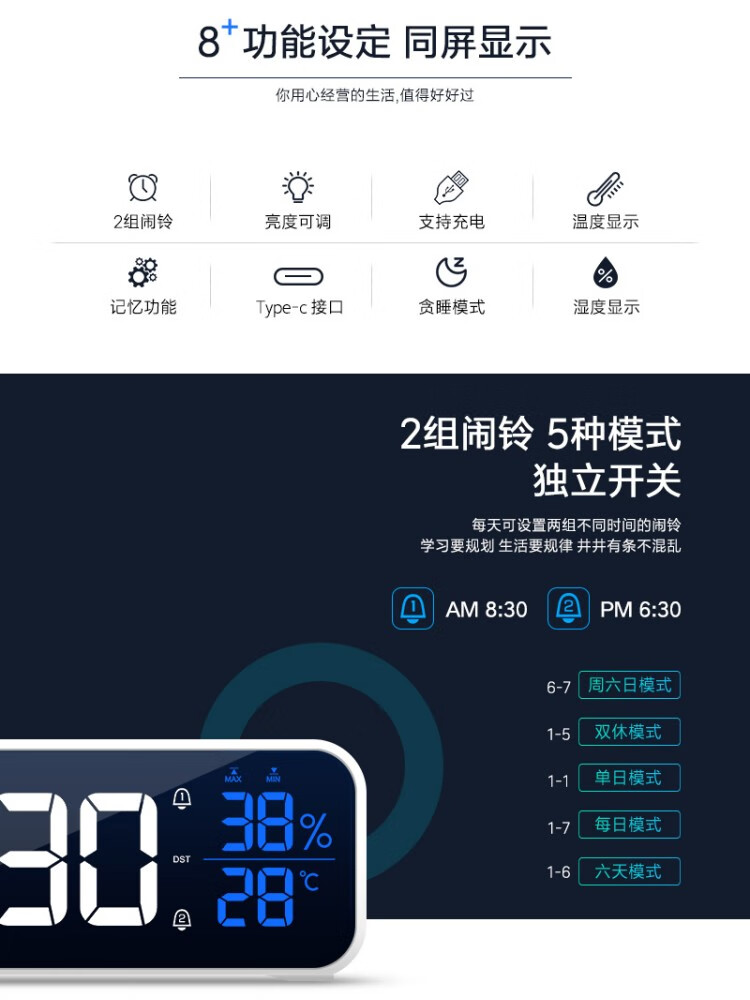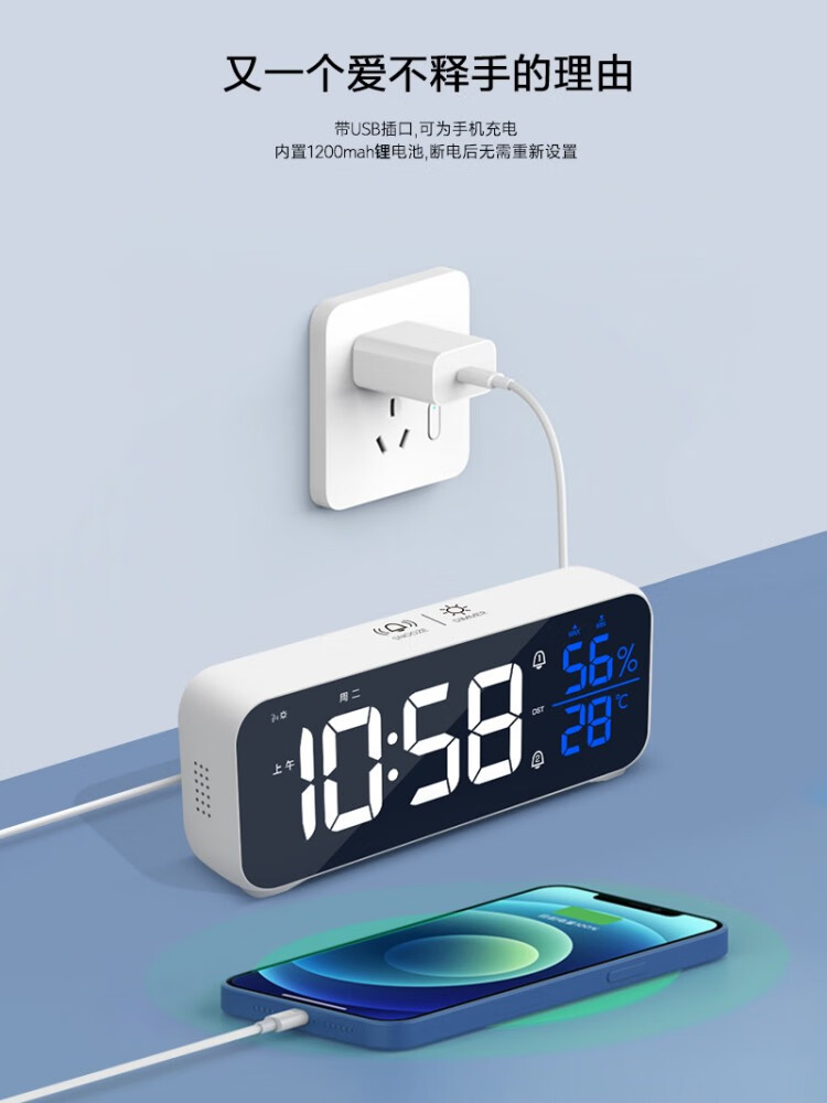 电子闹钟学生起床神器 大数字时钟 LED贪睡闹钟台钟座钟温锂电池 白色