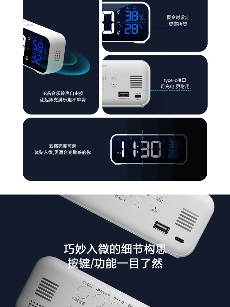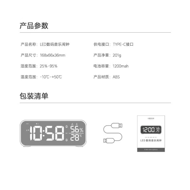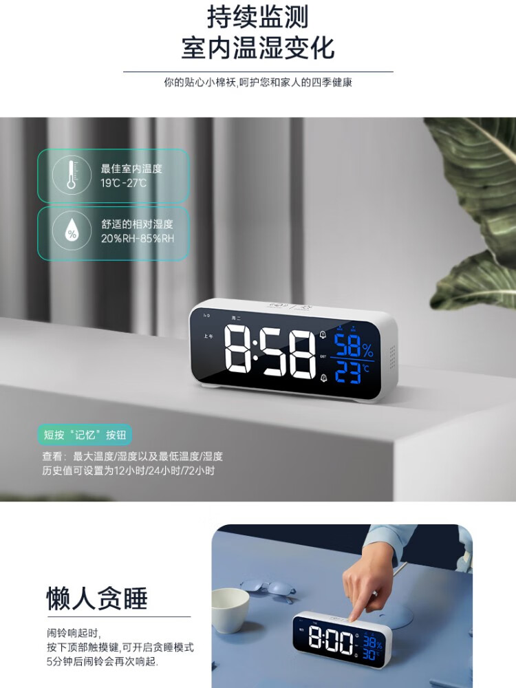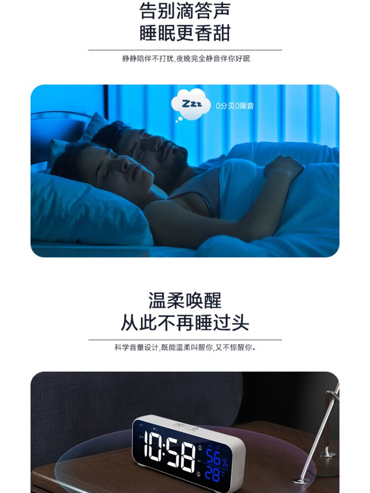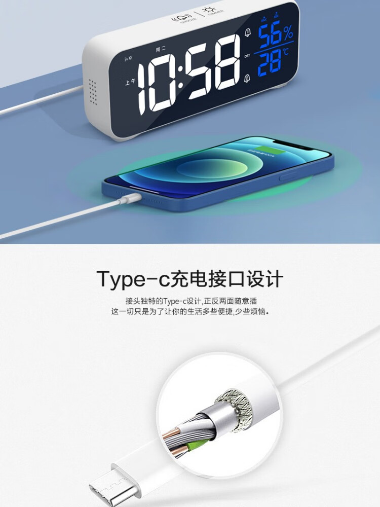电子闹钟学生起床神器 大数字时钟 LED贪睡闹钟台钟座钟温锂电池 白色