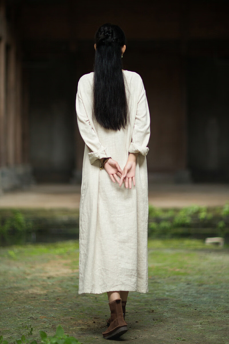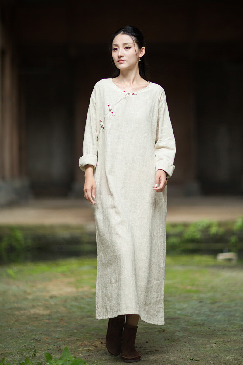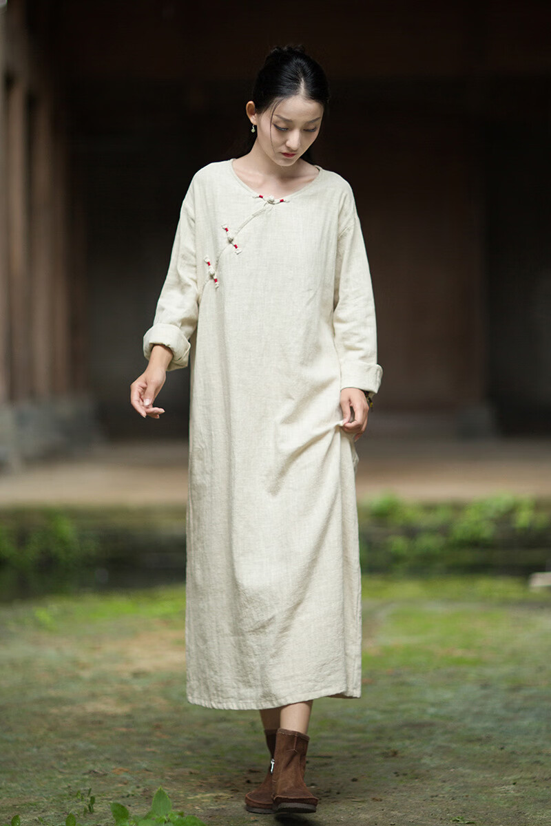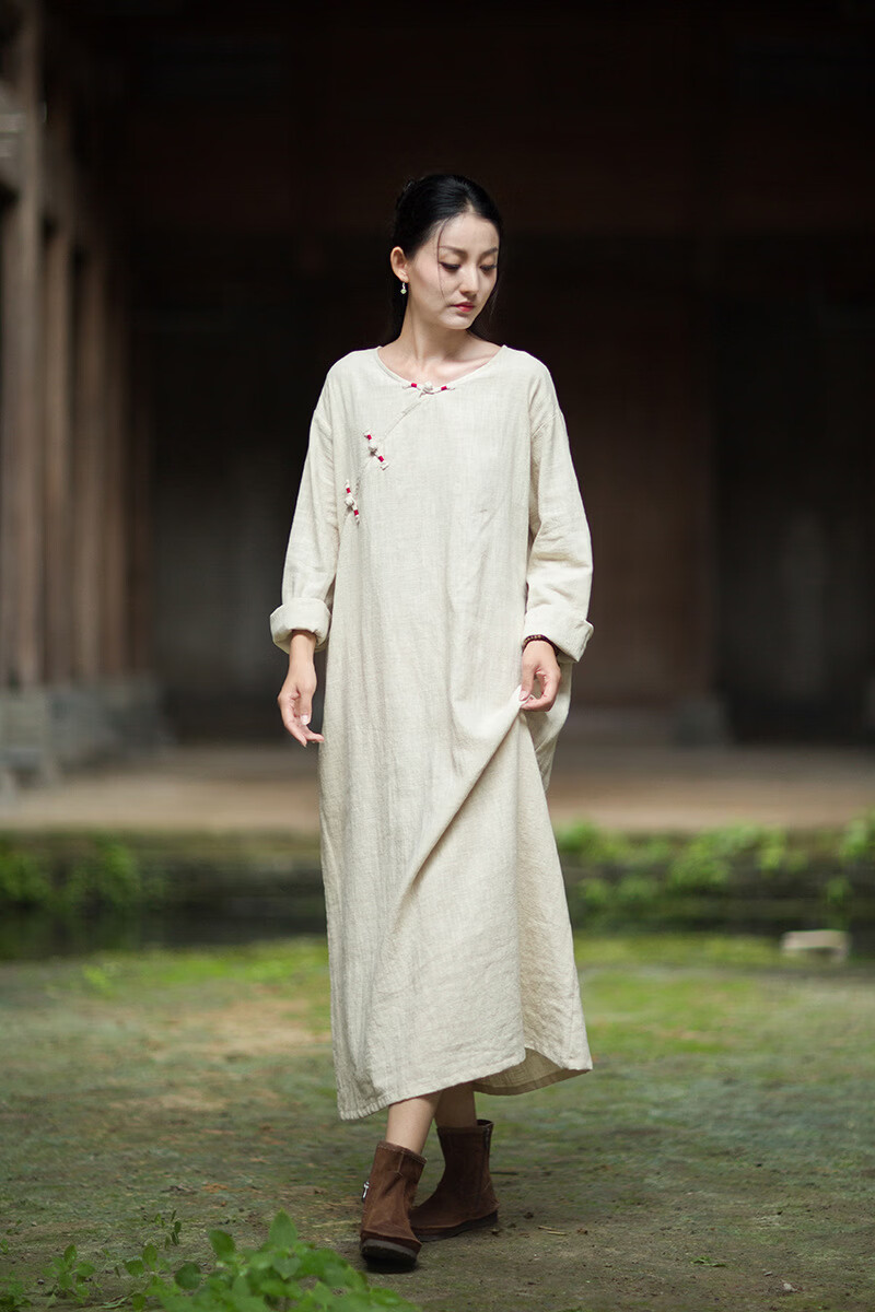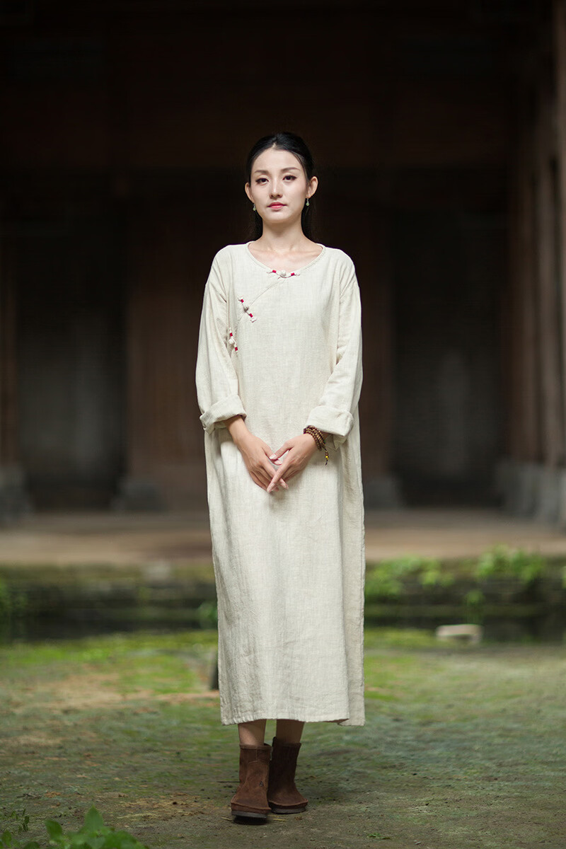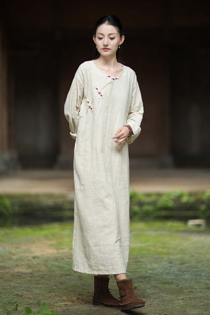 怡豆豆26春新中式苎麻禅意连衣裙斜襟盘扣 原麻色 均码