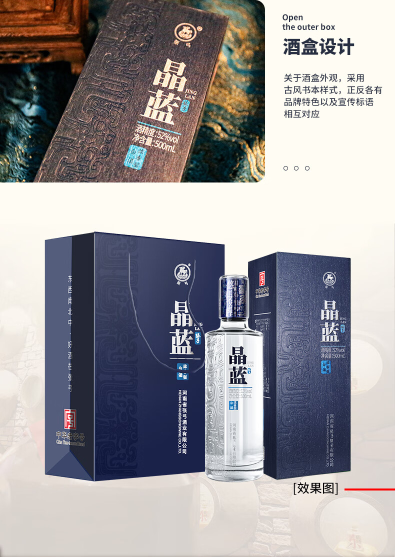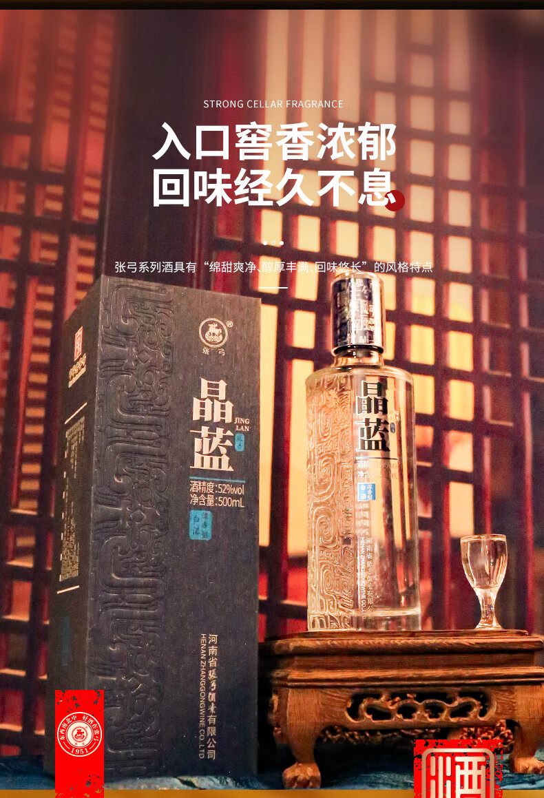 张弓酒【纯粮优级】晶蓝 浓香型白酒 纯粮固态发酵 52度 500mL 6瓶 整箱装