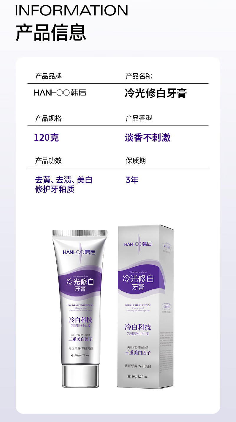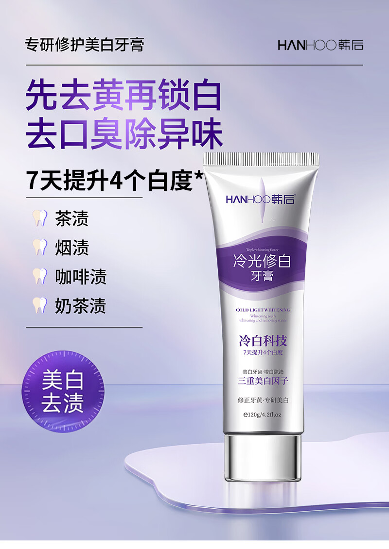 Hanhoo冷光美白牙膏去黄去渍清新口气 冷光修白120g*2支(去黄+去渍+美白)