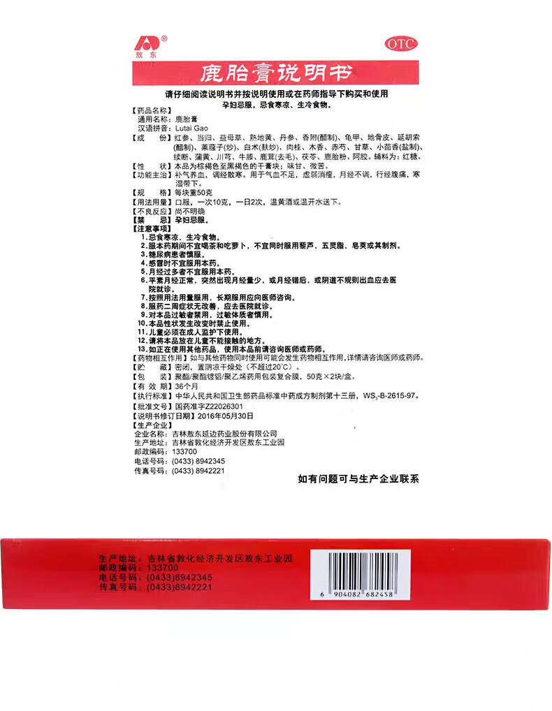 敖东鹿胎膏 50g*2块/盒补气养血调经散寒气血不足虚弱消瘦月经不调行经腹痛寒湿带下药房直发 1盒装 50g*2块/盒