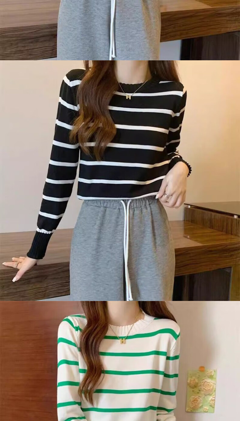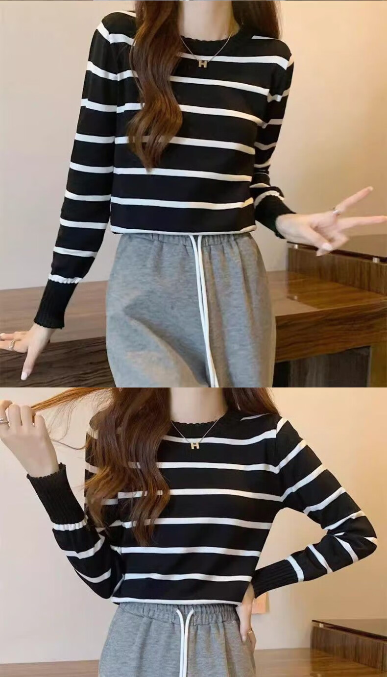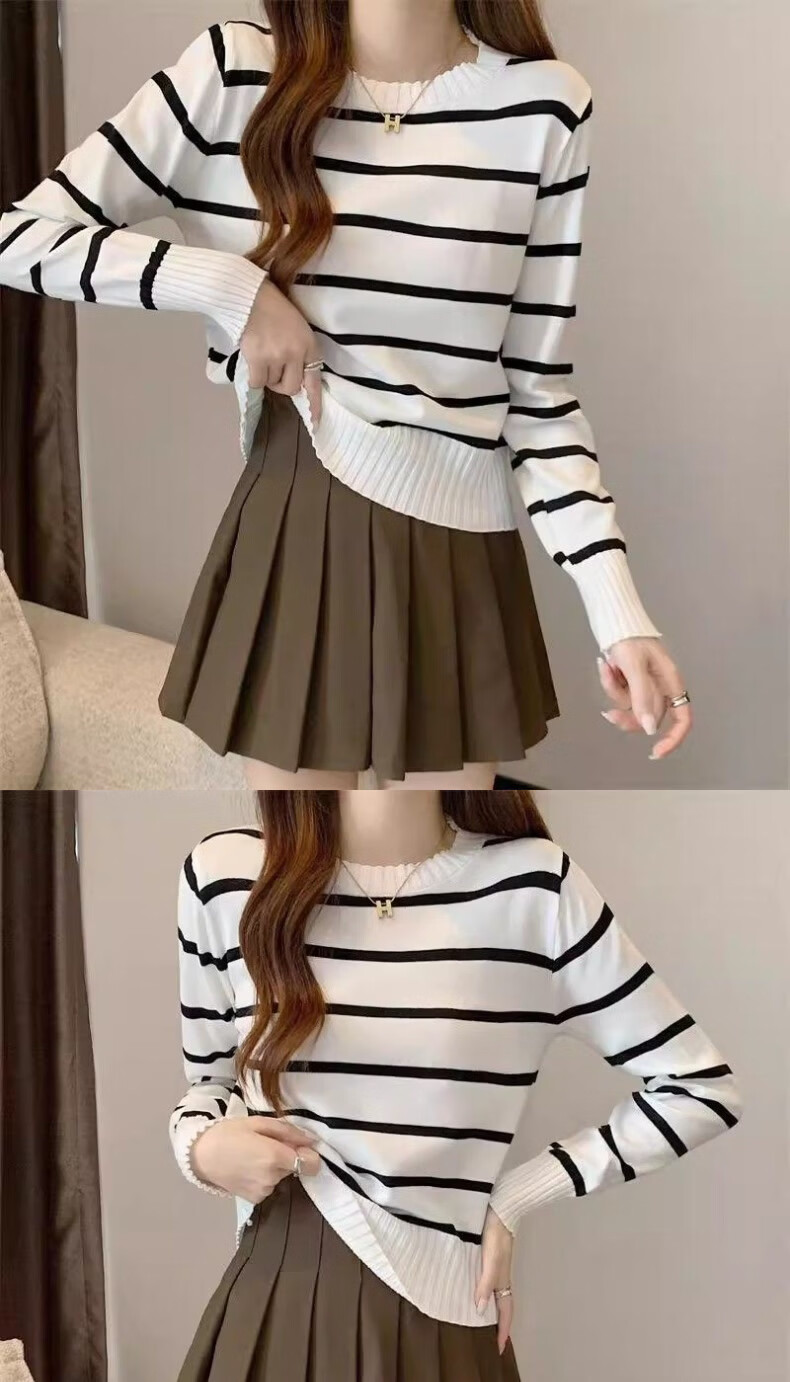 WAMLBN秋季短款韩版撞色条纹长袖针织衫针织2025打底新款毛衣设计上衣 白色 均码