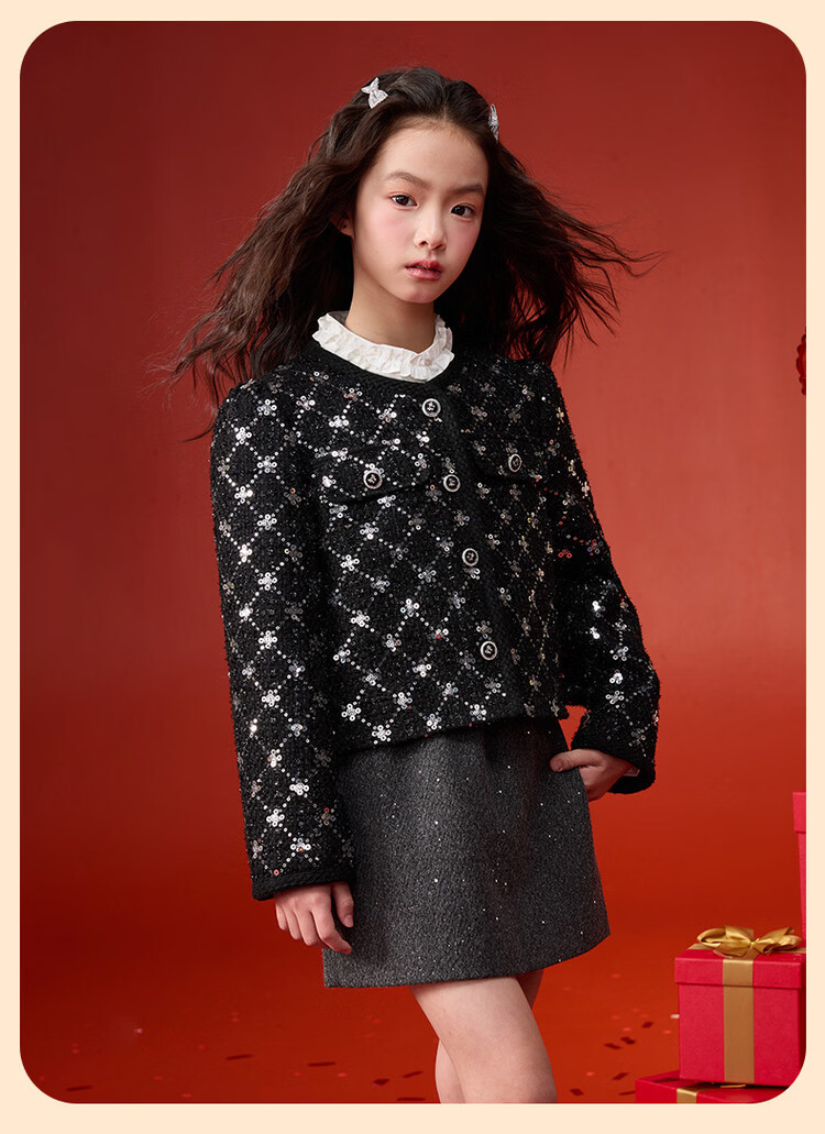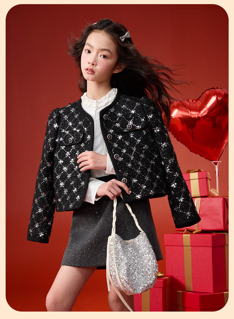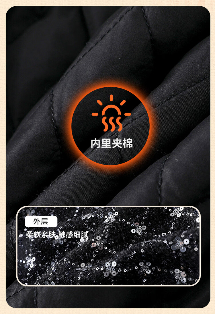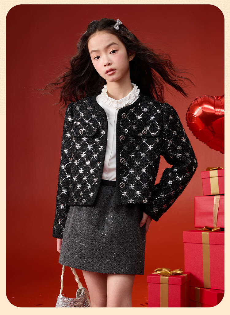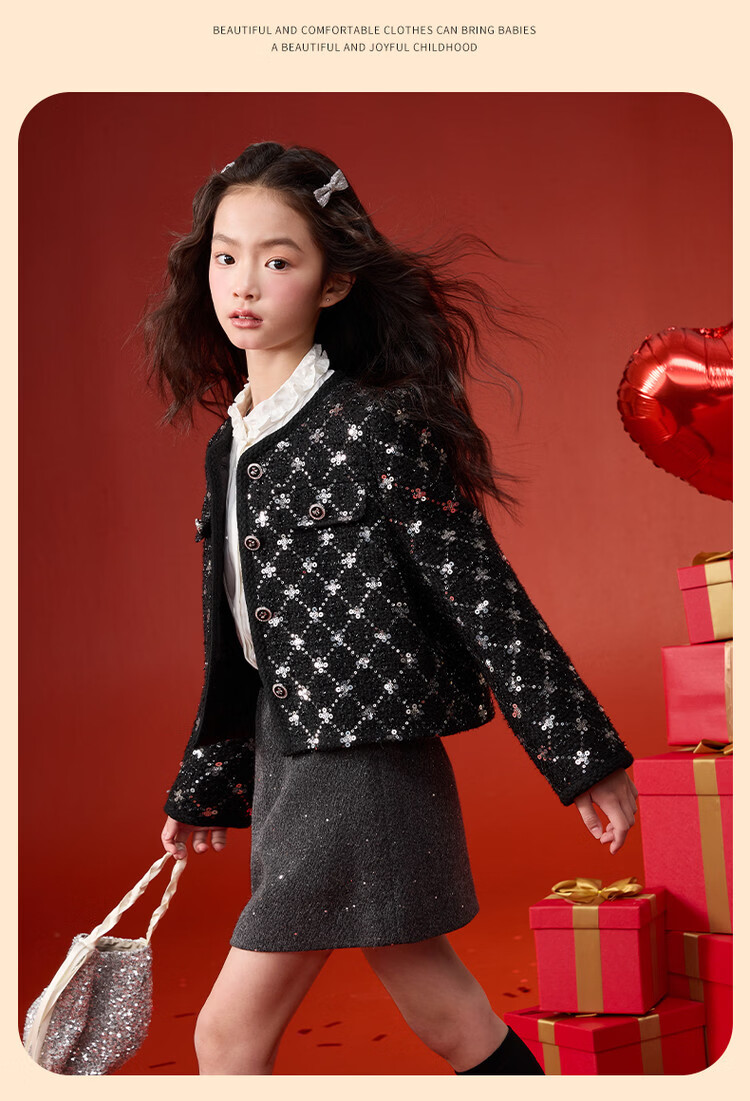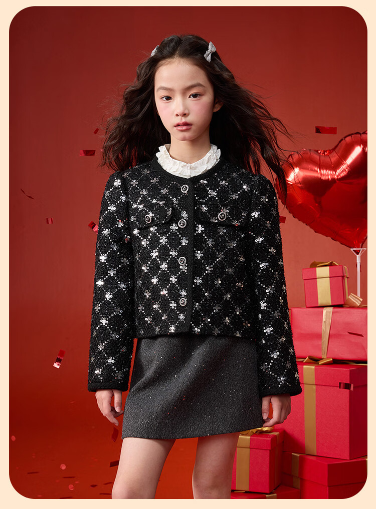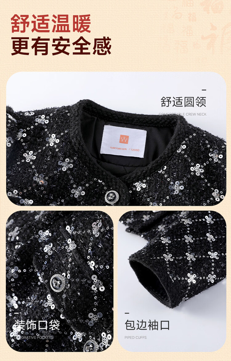 媛媛公主儿童中式亮片小香风外套女童夹棉加厚保暖棉衣中大童柔软舒适童装 黑色 110