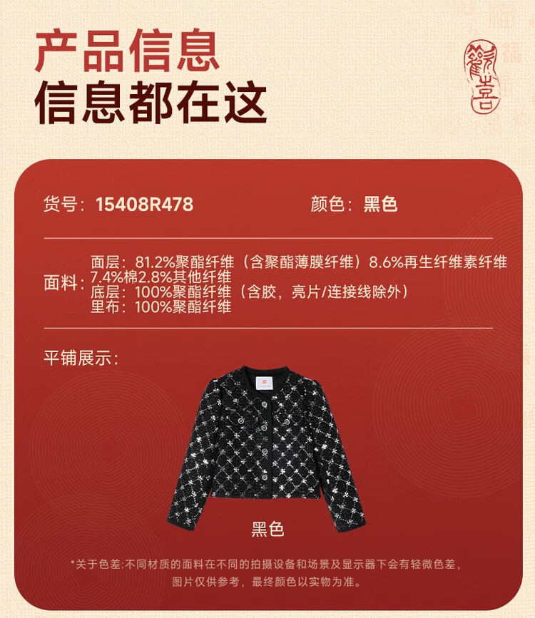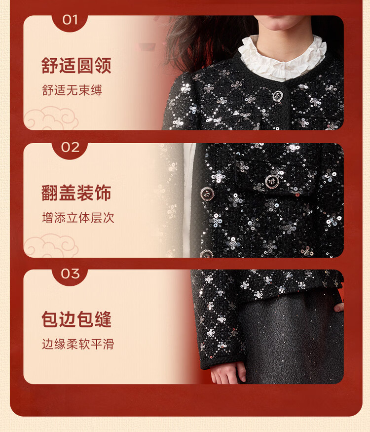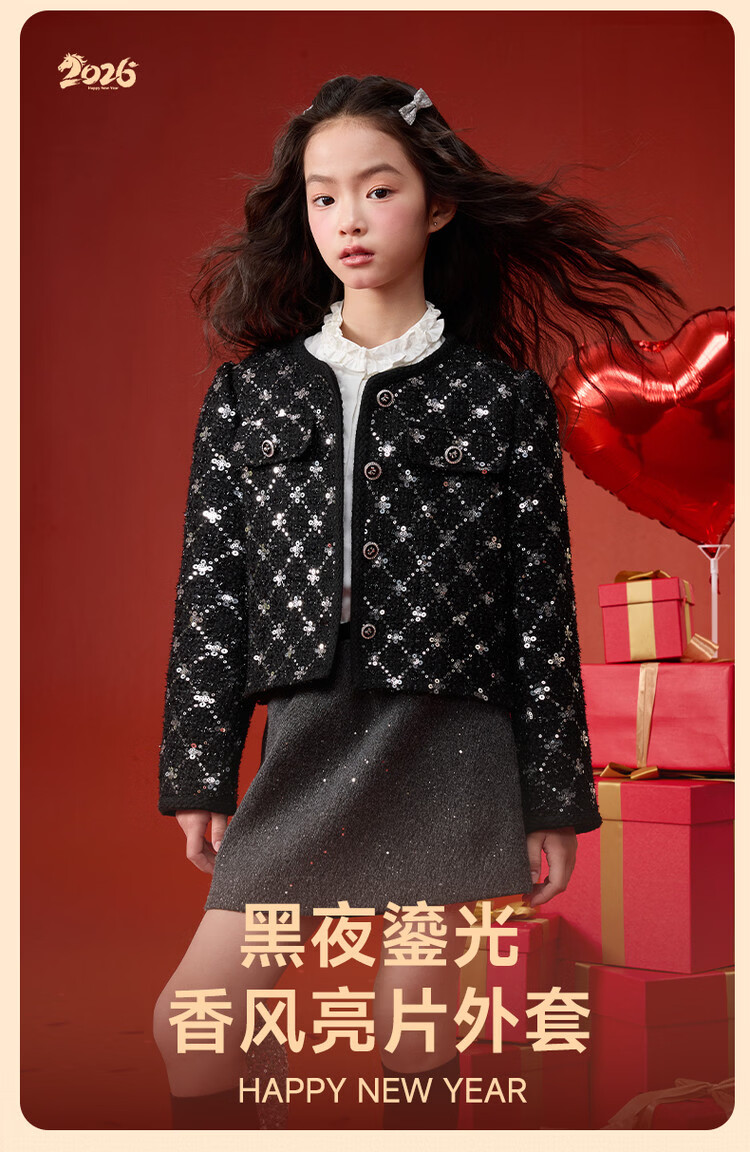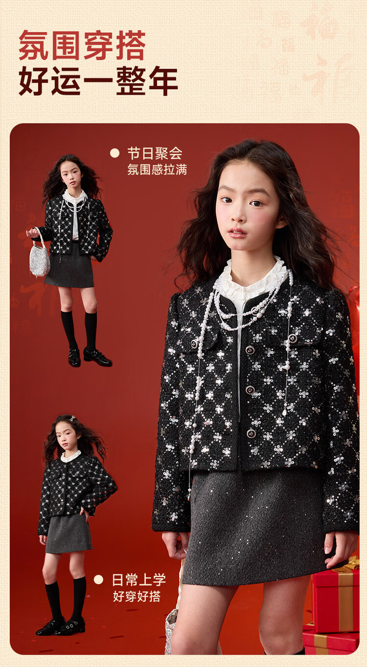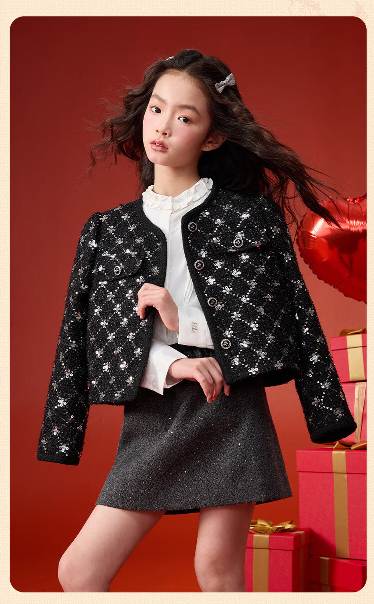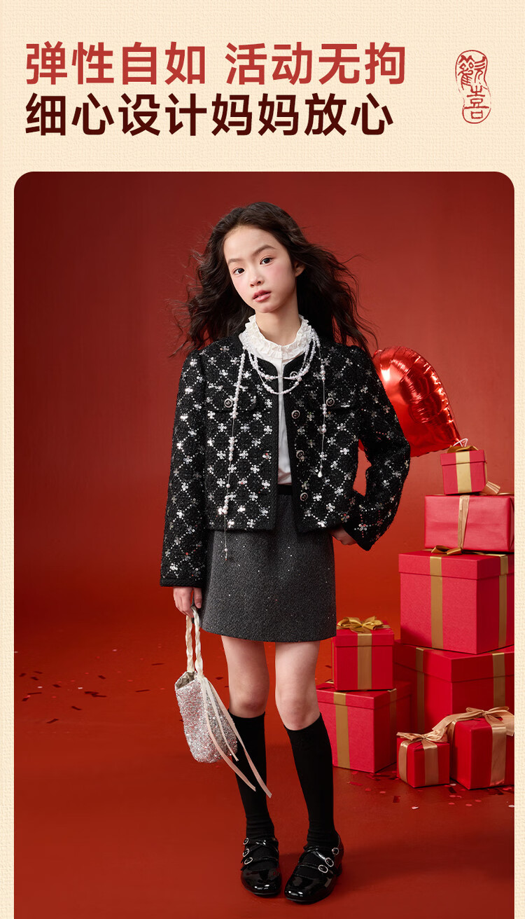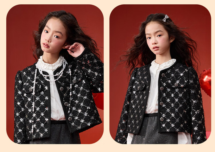 媛媛公主儿童中式亮片小香风外套女童夹棉加厚保暖棉衣中大童柔软舒适童装 黑色 110