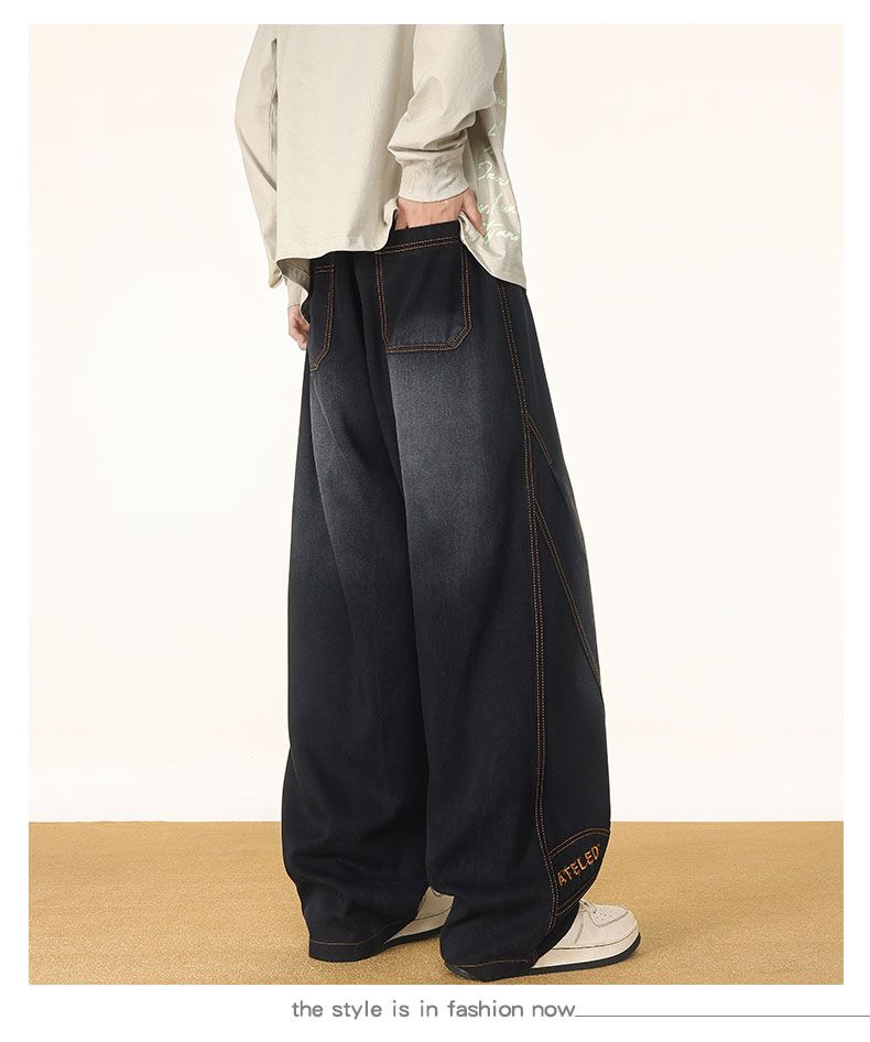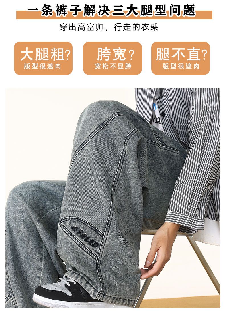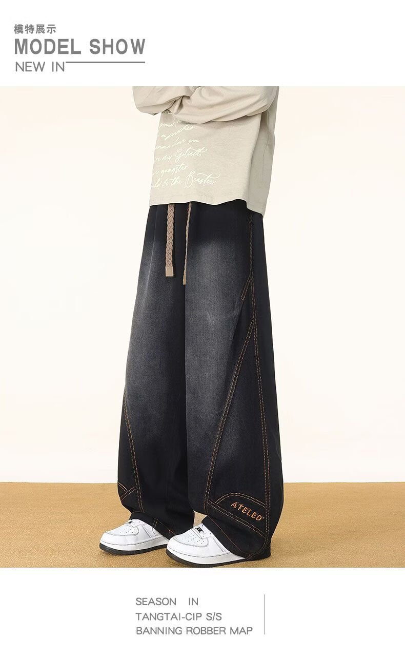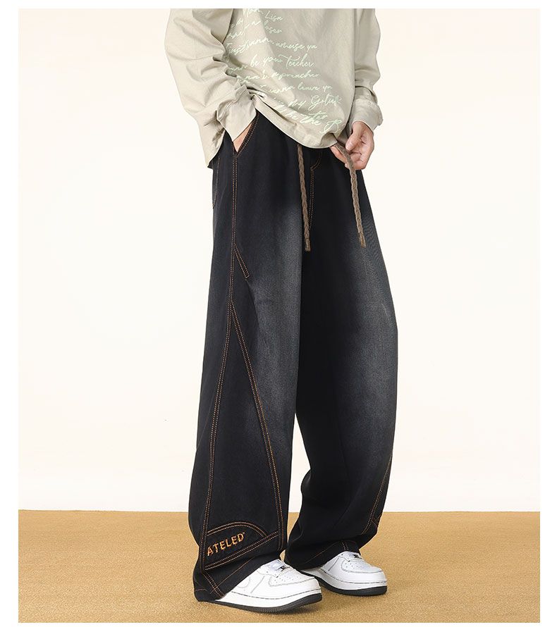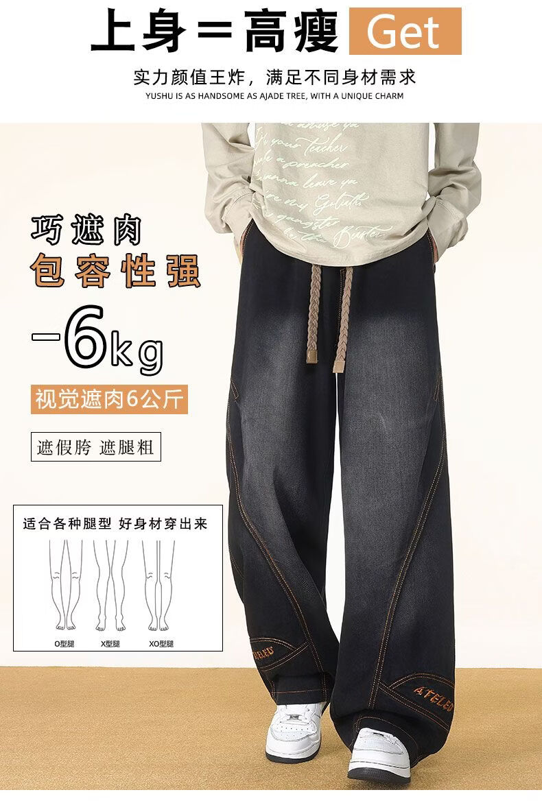 啄木鸟阔腿弯刀牛仔裤男款秋冬季加绒美式直筒休闲长裤加肥加大码裤子男 黑色 L