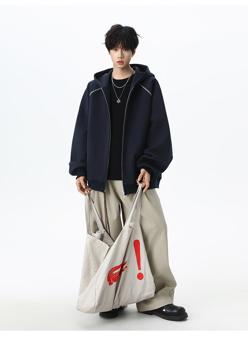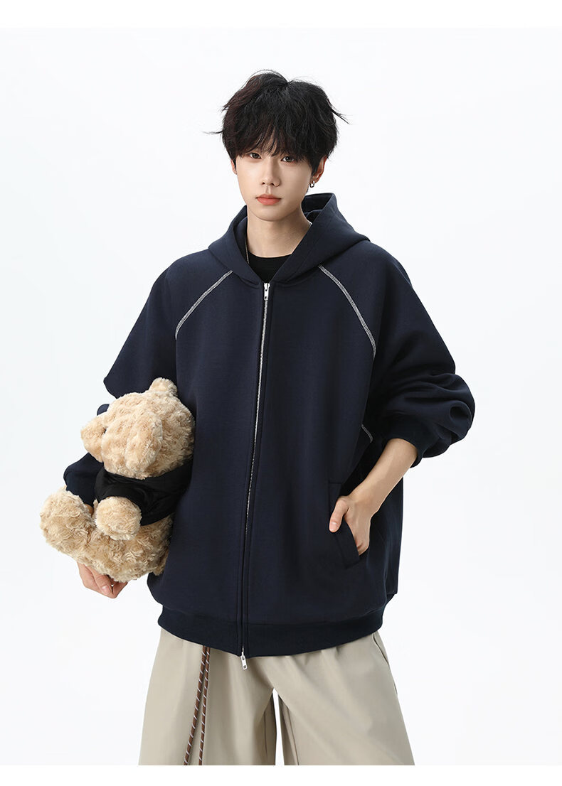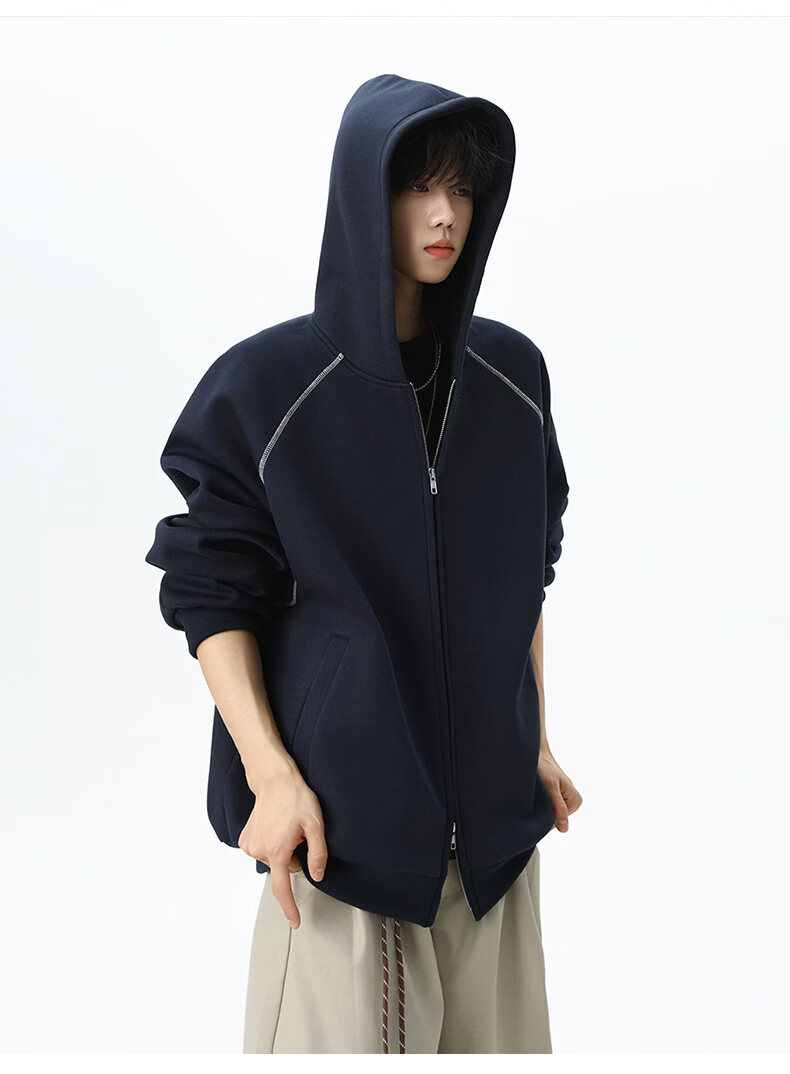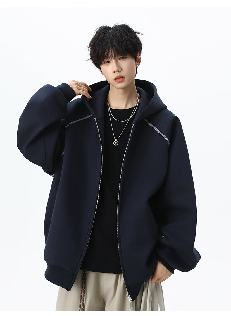 NEW OR MODE潮牌重磅开衫连帽卫衣男春季新款高街宽松拼接帽衫休闲情侣夹克衫 深兰色【高品质】 XL 【建议125-145斤】
