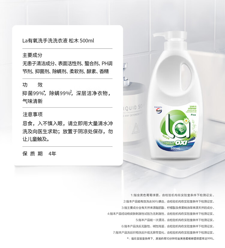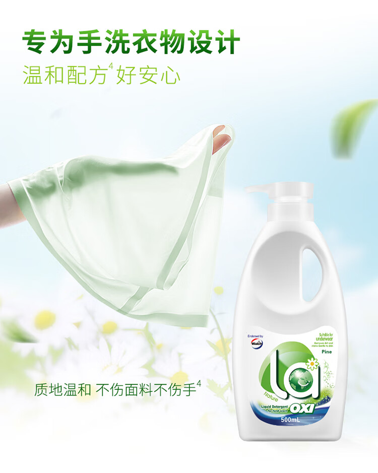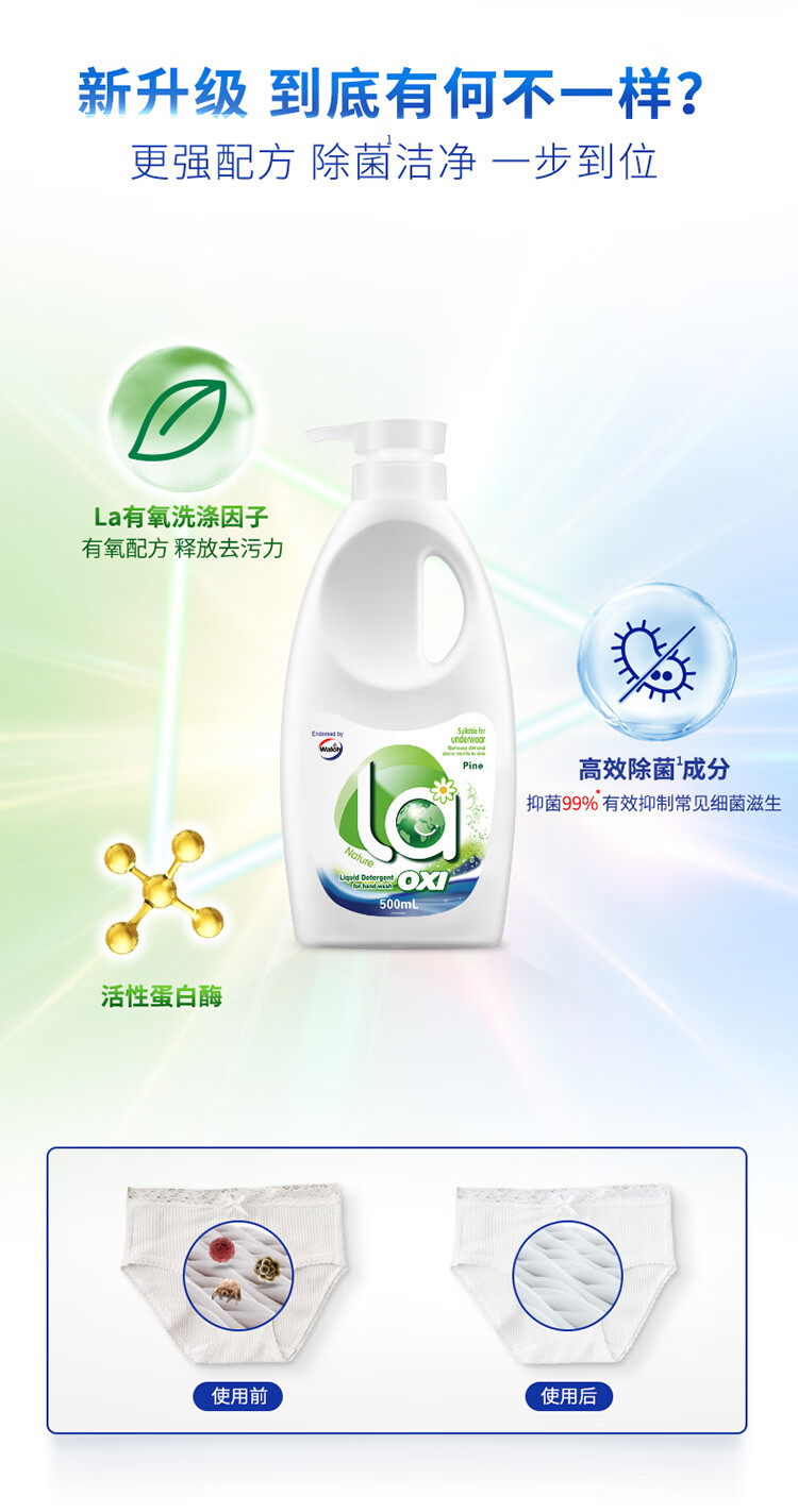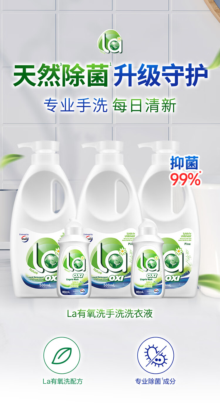 威露士La有氧洗手洗洗衣液500ml*3+内衣净松木香90ml*2抑菌除螨可洗内衣