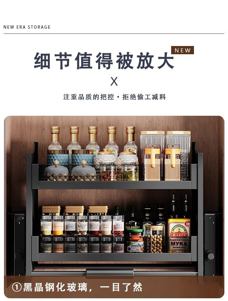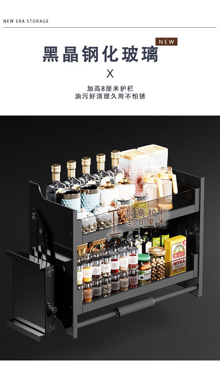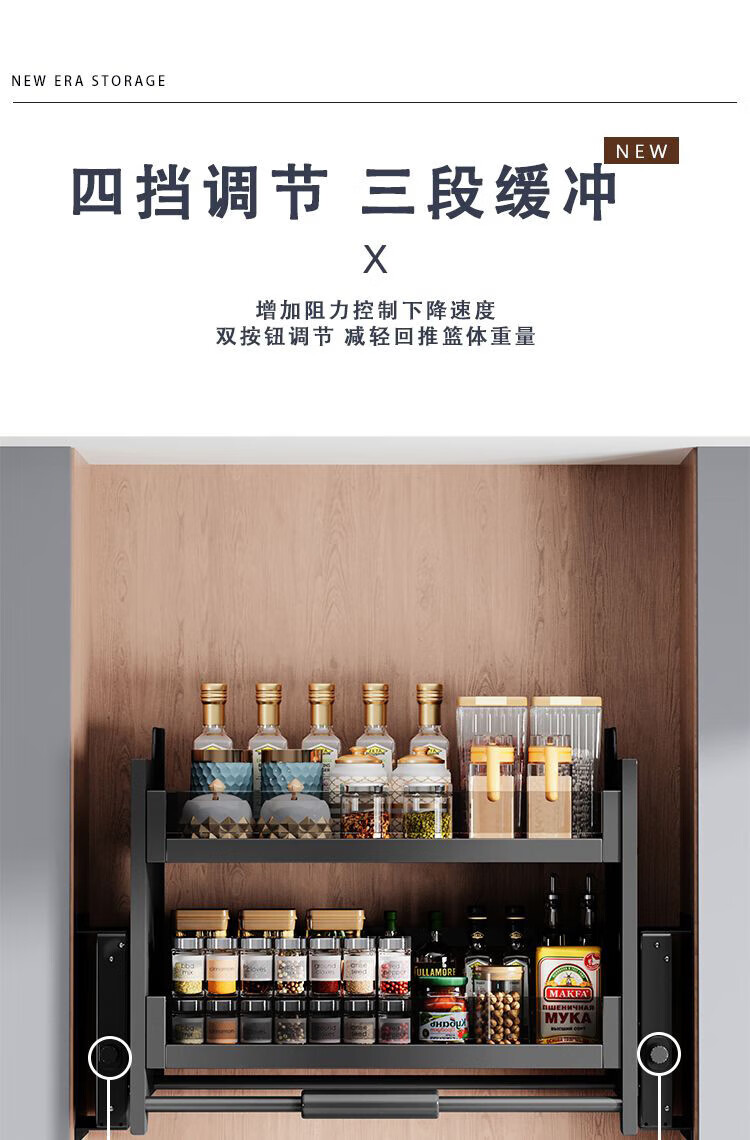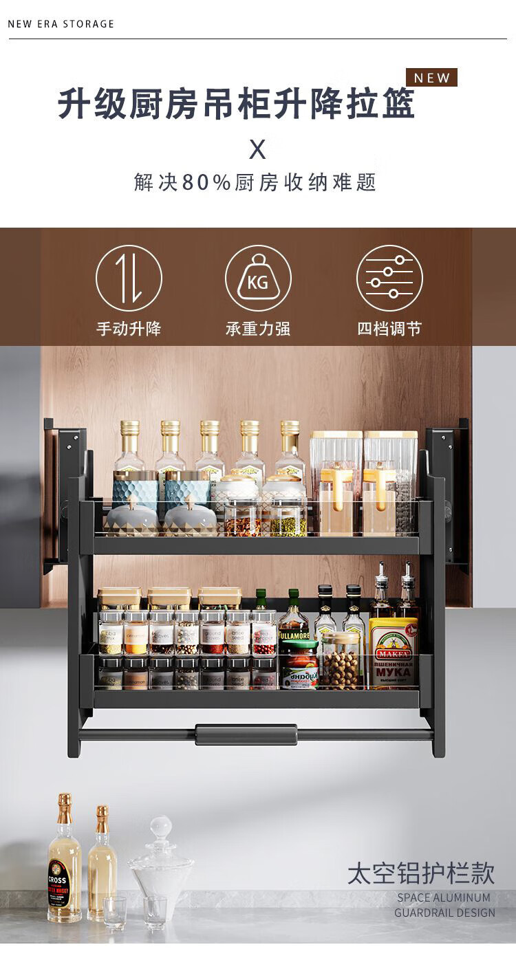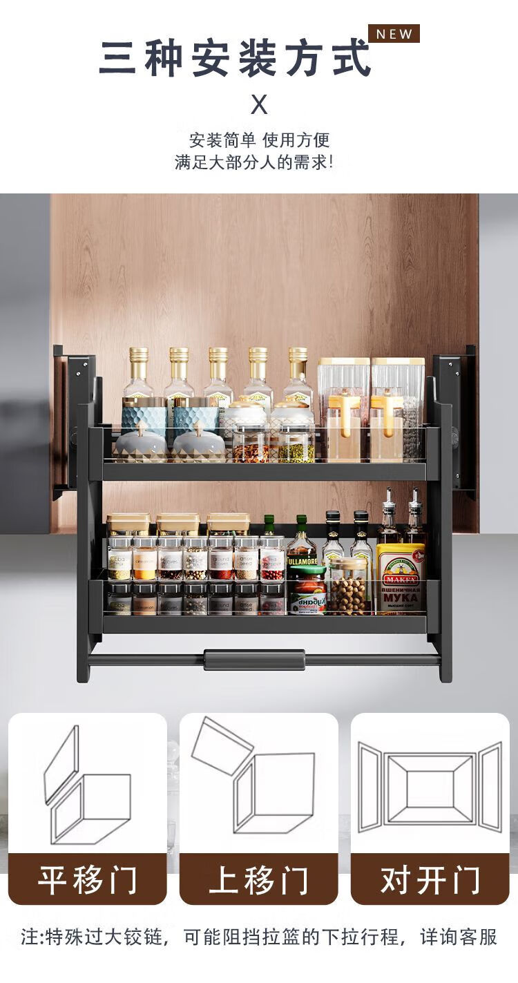 德米莫单层矮柜厨房吊柜拉篮铝合金下拉式手动调味篮多层置物架 【升级2.0双层400柜】钢化玻璃挡板款纳米黑