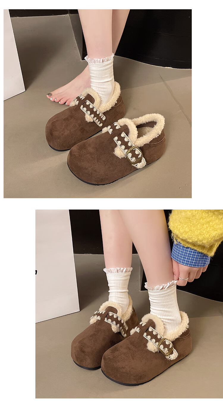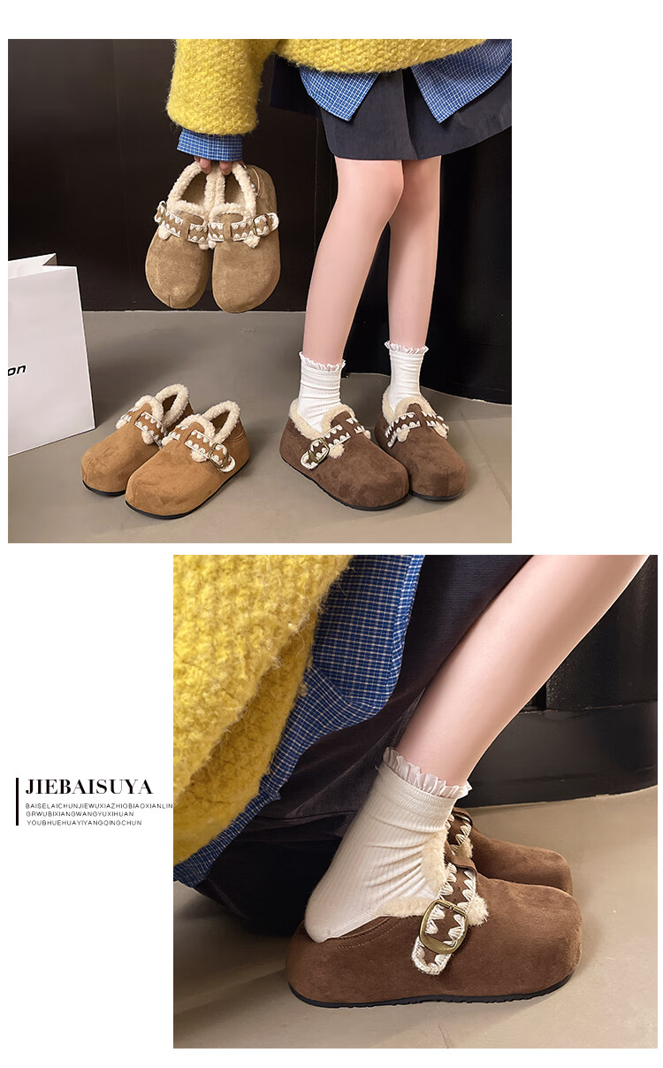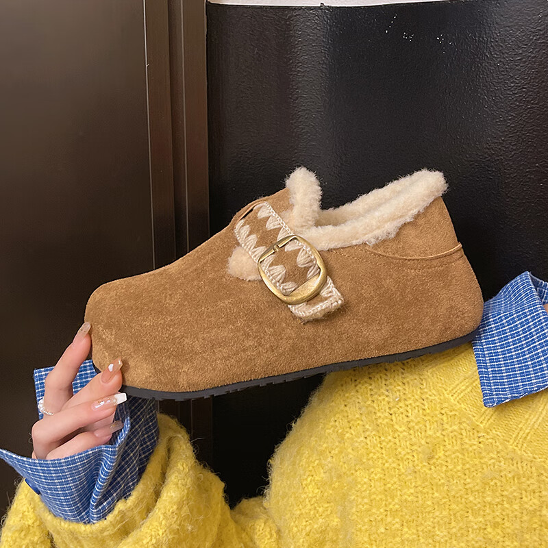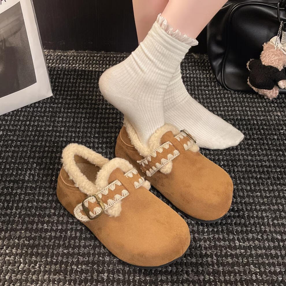 稻草人(MEXICAN)大码女鞋41到43勃肯鞋加绒厚底复古毛毛鞋2026新款冬保暖低帮棉鞋 驼色 35