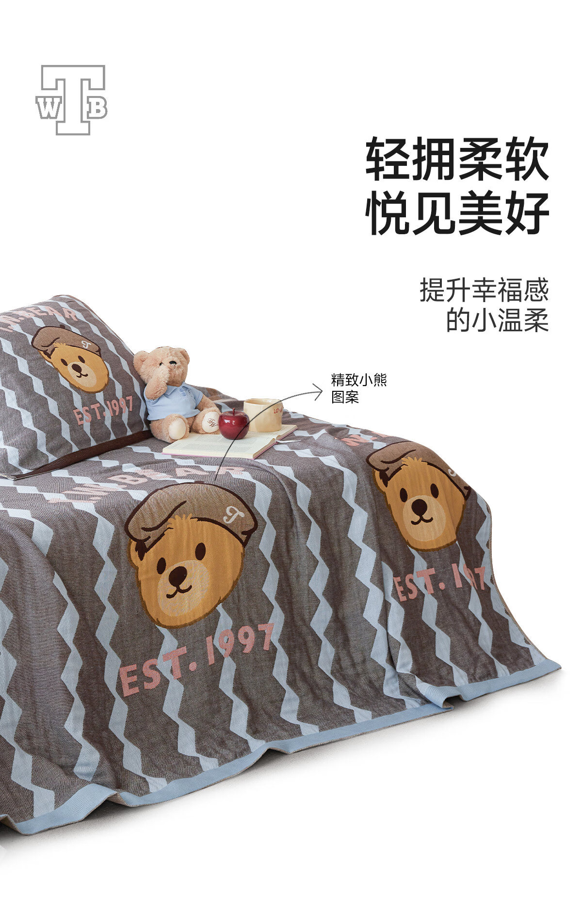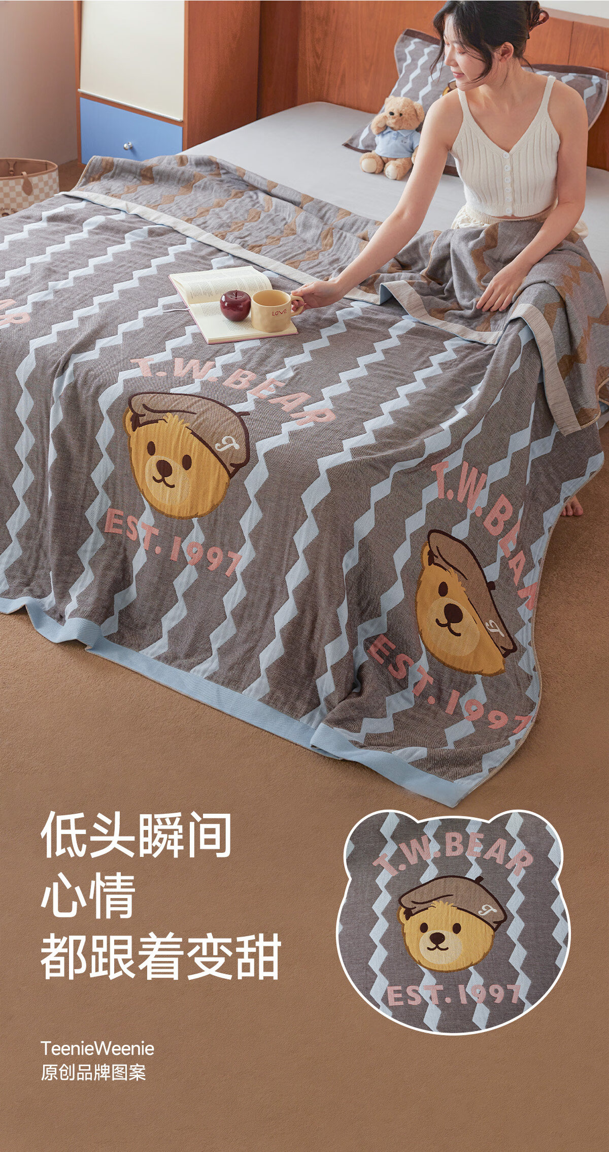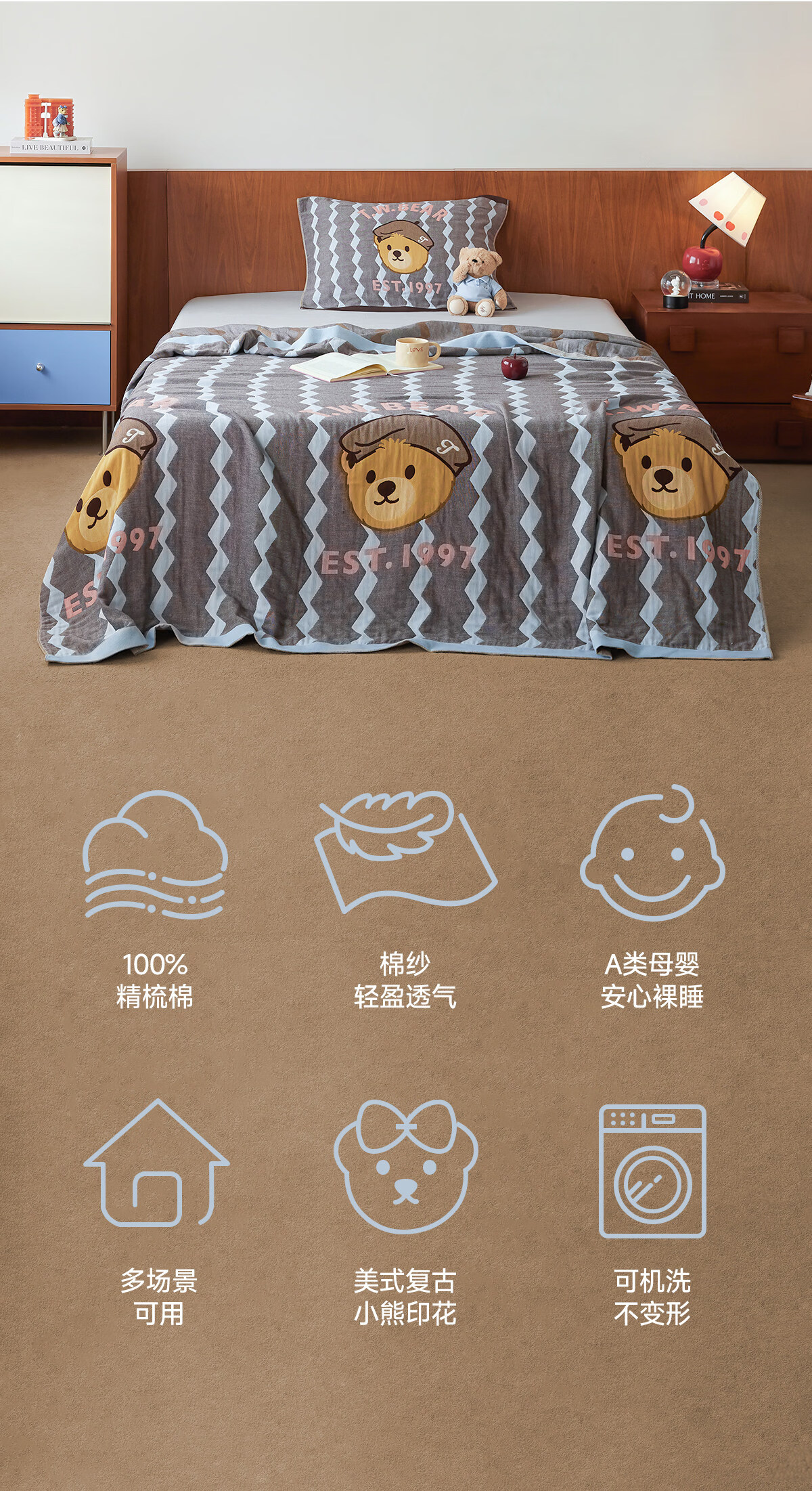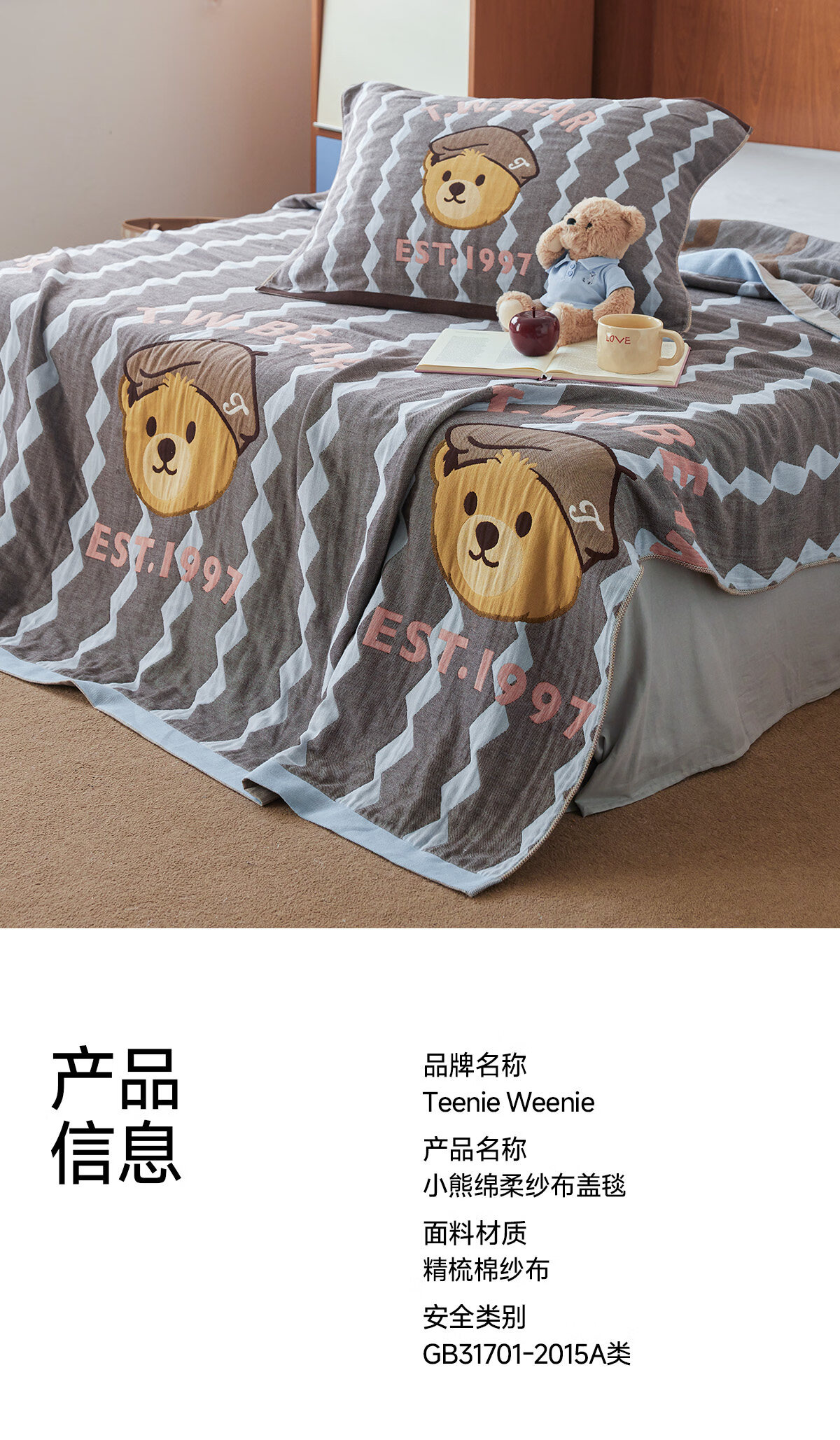 Teenie Weenie小熊新款A类母婴纱布盖毯纯棉毯子卧室毛毯午休毯多功能毯 菱形蓝【全棉纱布盖毯+A类+小熊图案】 200cm*150cm