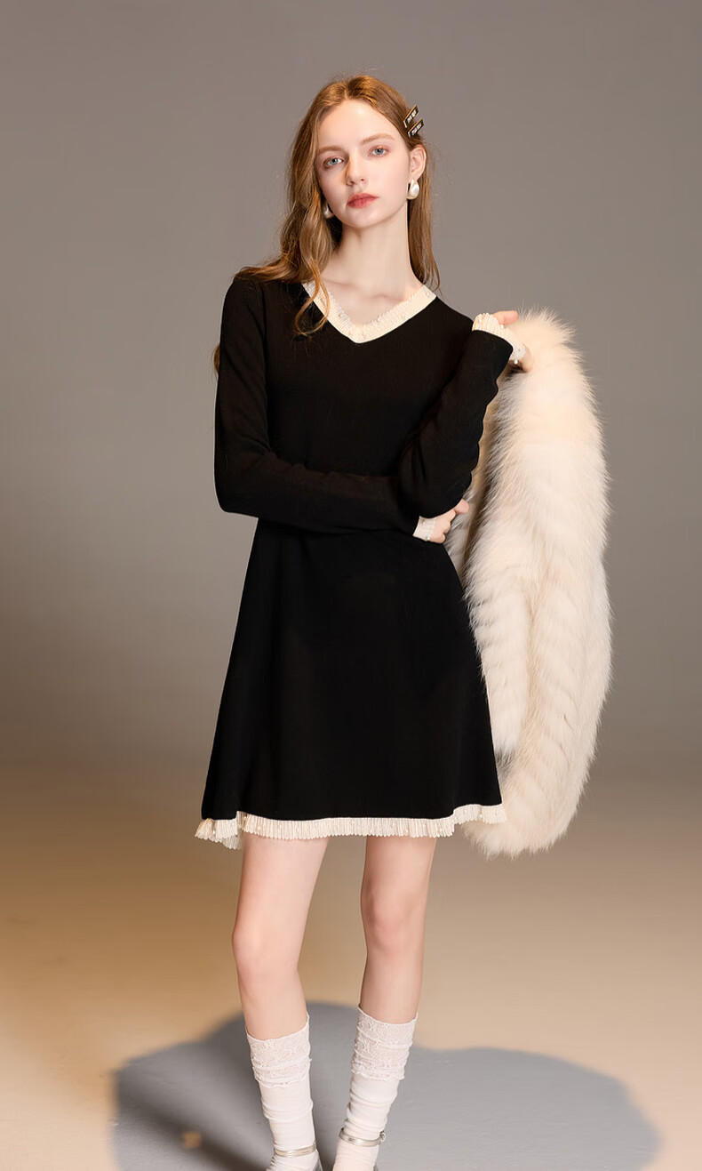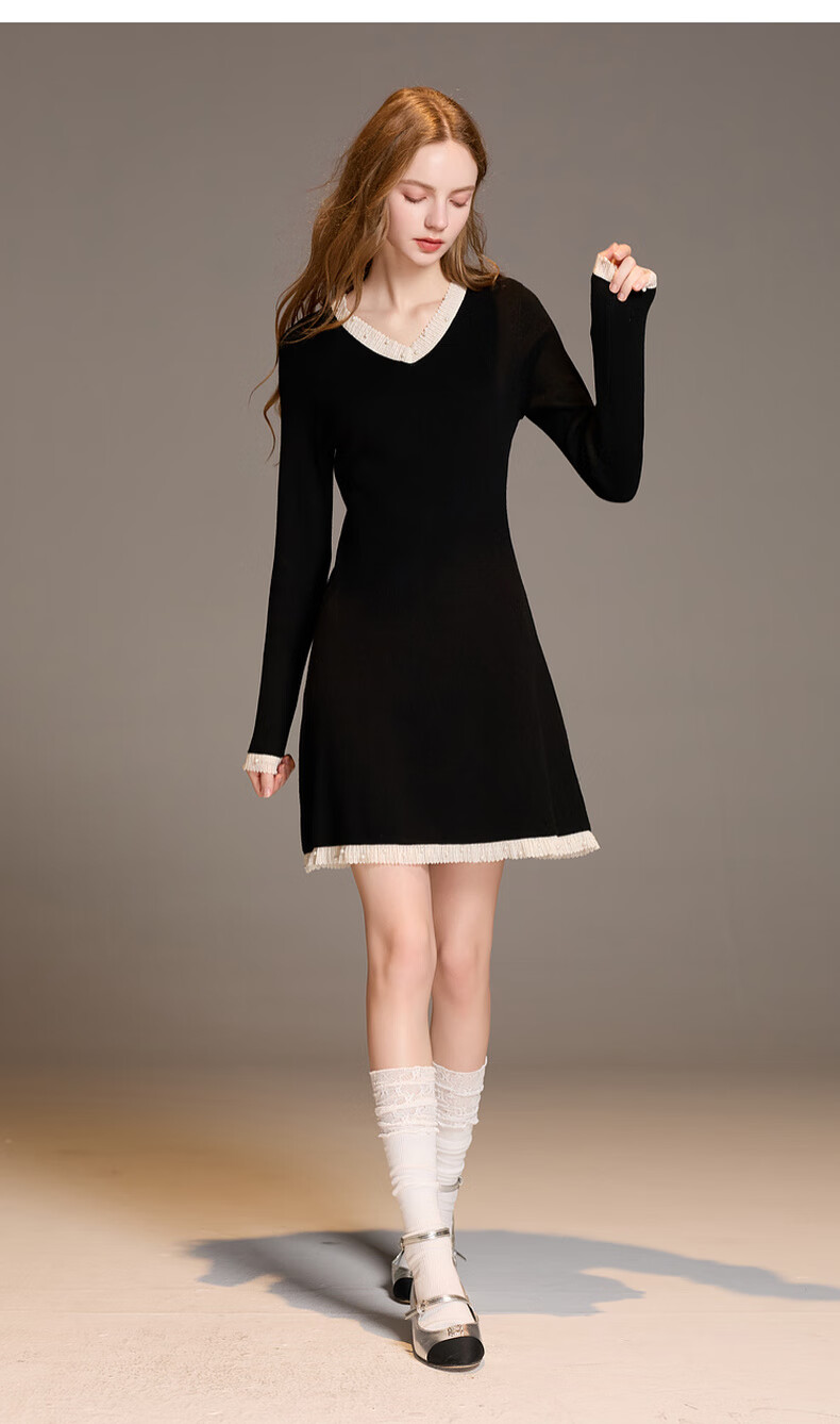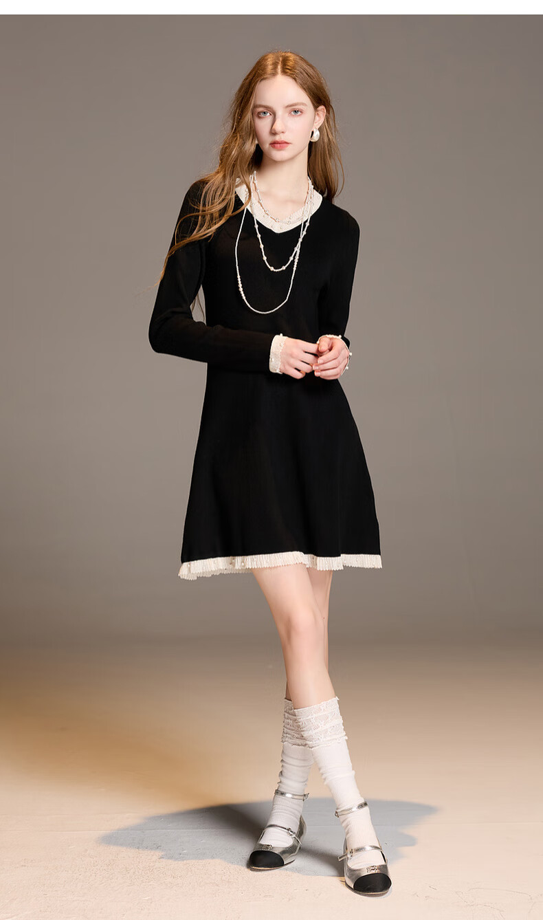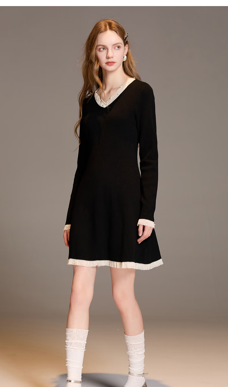 三彩2025冬季新款针织连衣裙花边V领长袖A字短裙修身气质M
