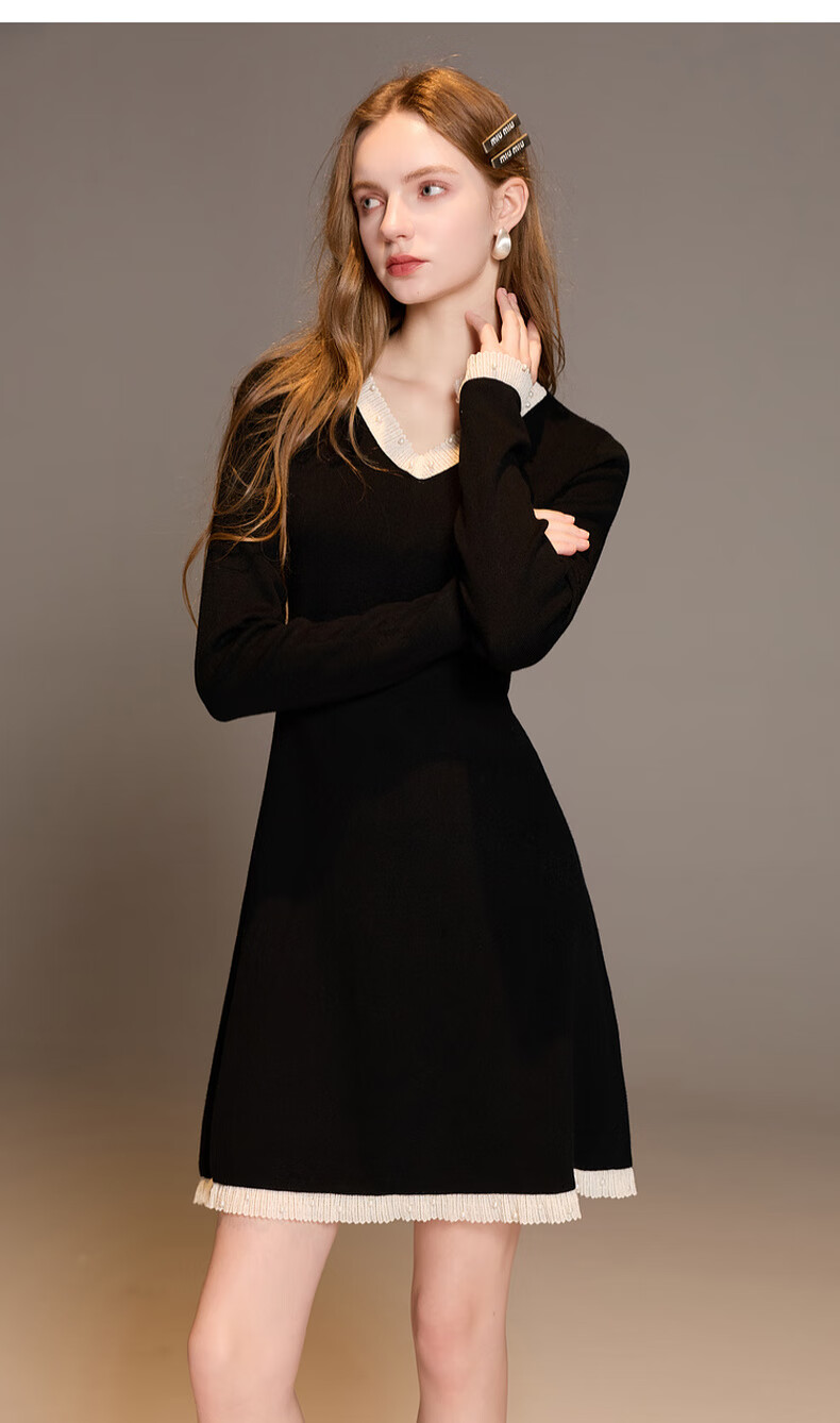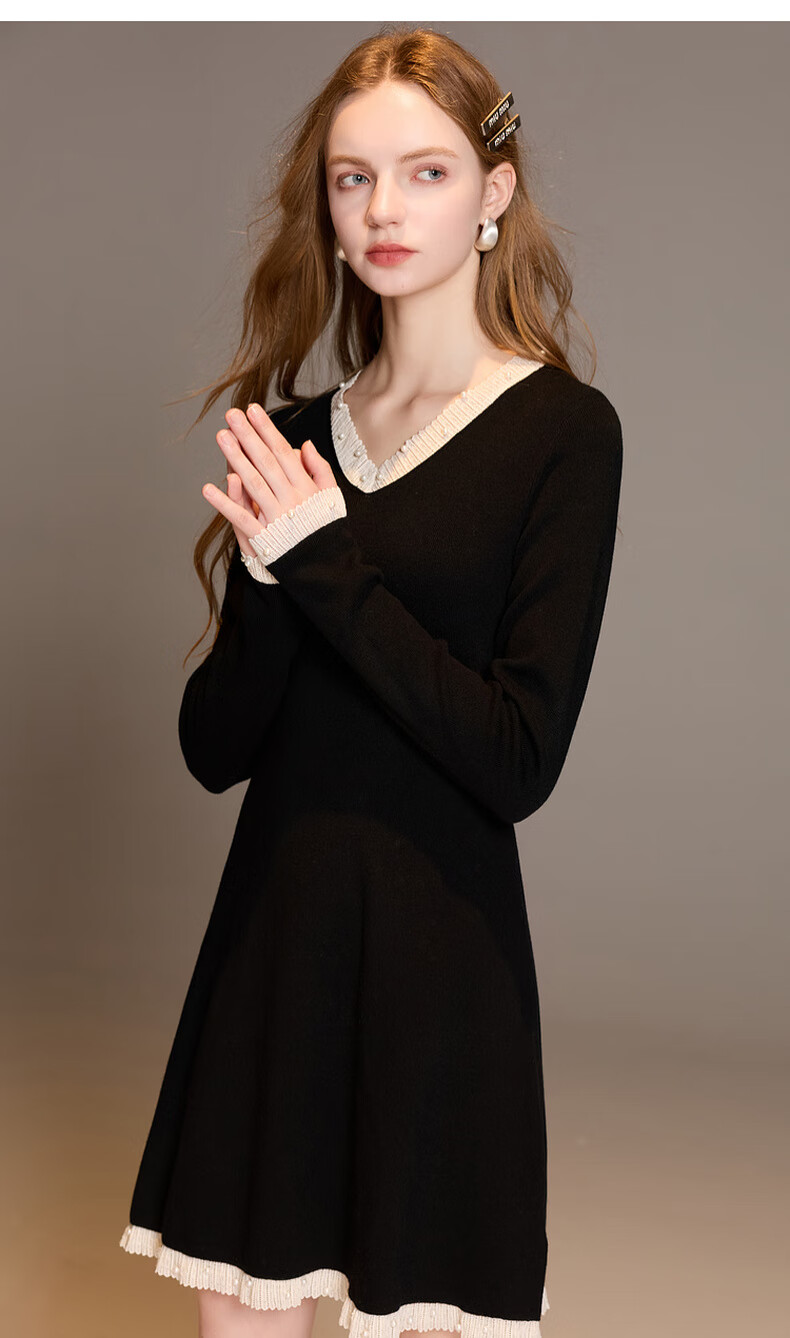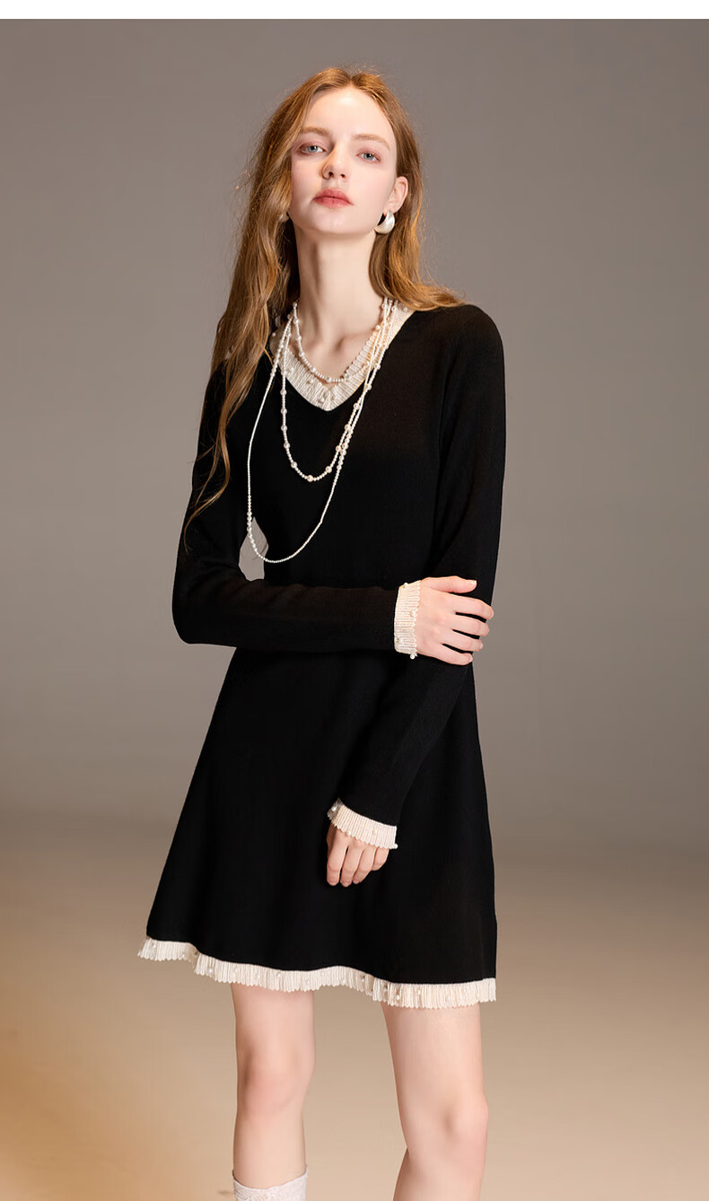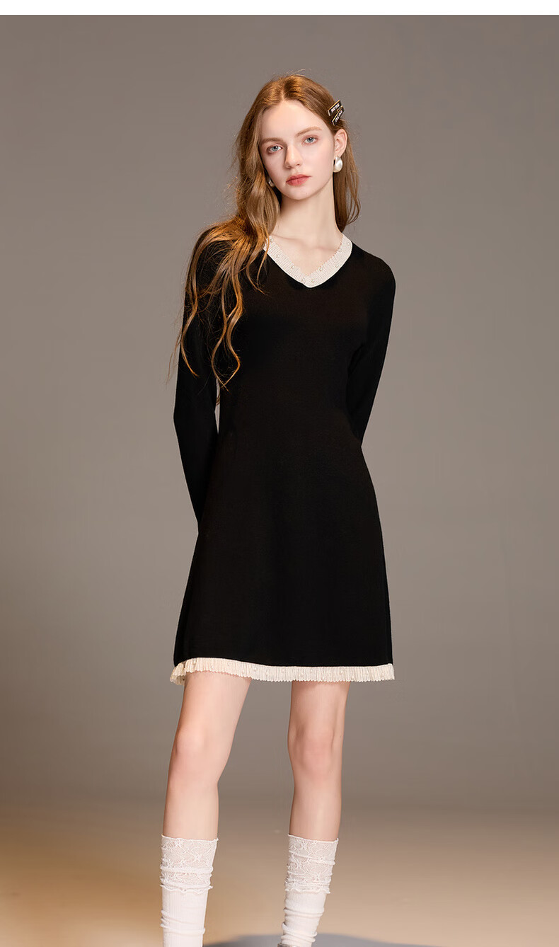 三彩2025冬季新款针织连衣裙花边V领长袖A字短裙修身气质M
