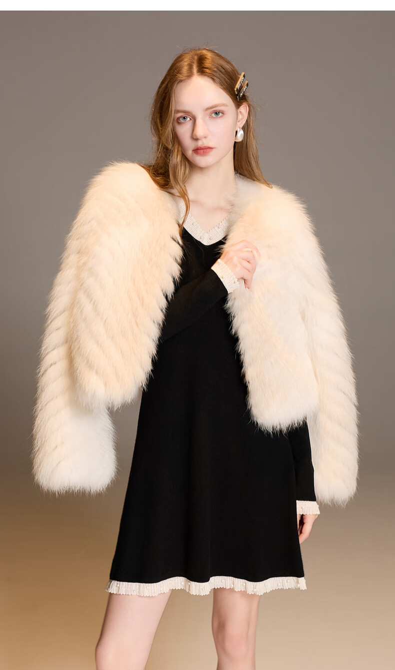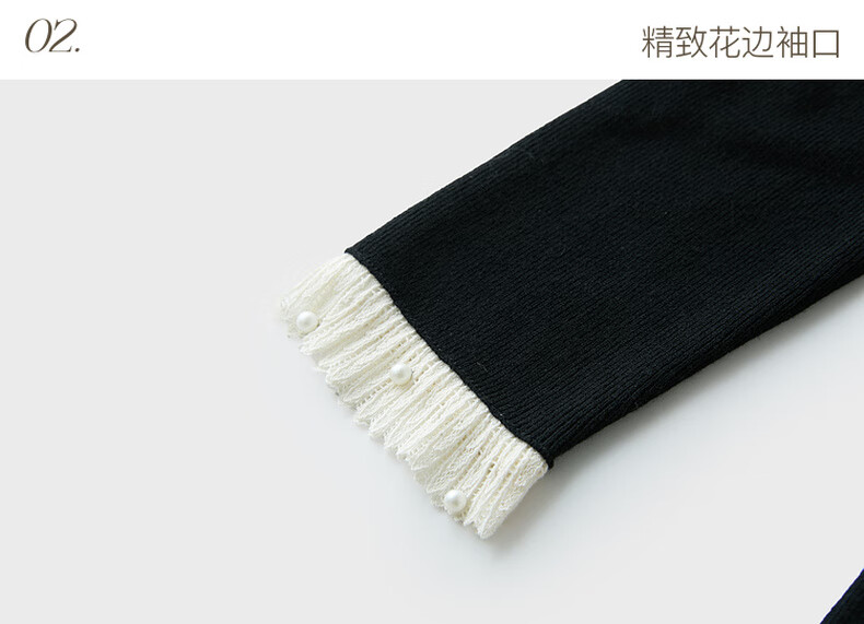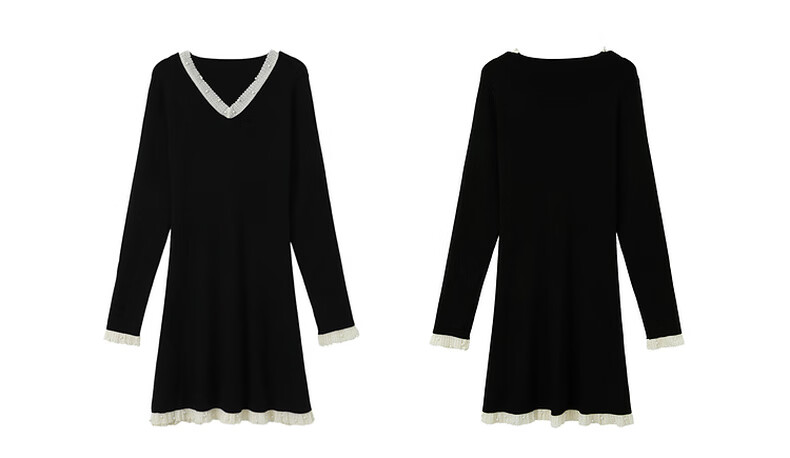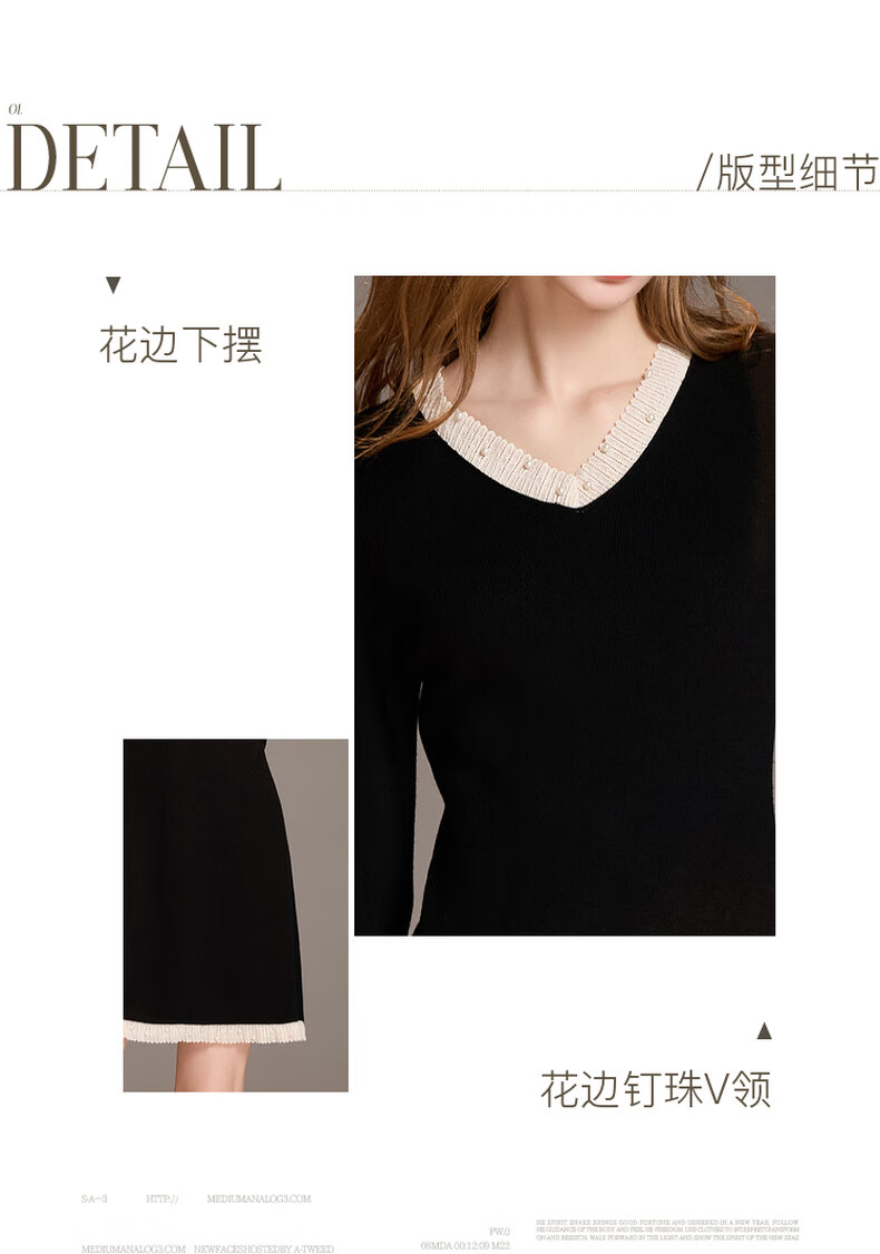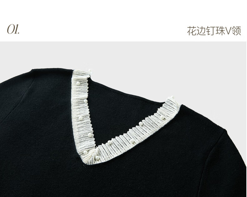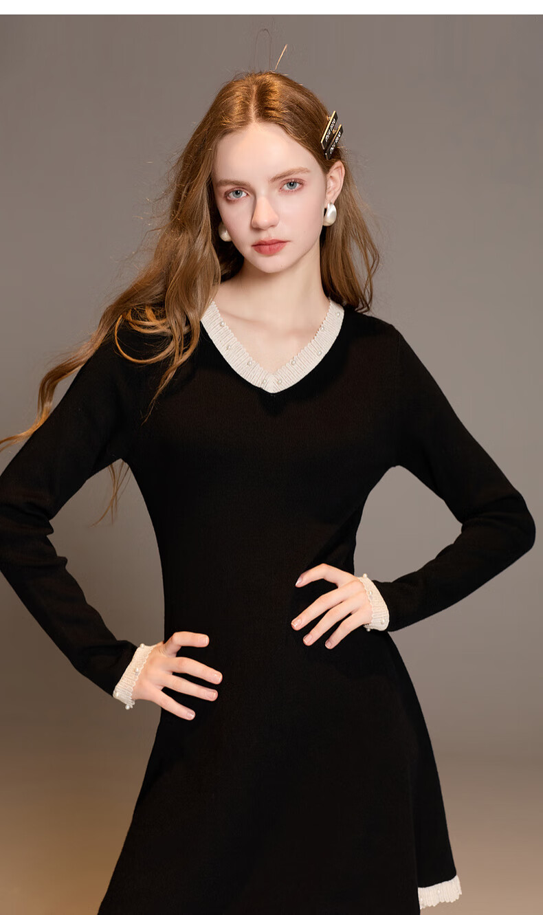 三彩2025冬季新款针织连衣裙花边V领长袖A字短裙修身气质M