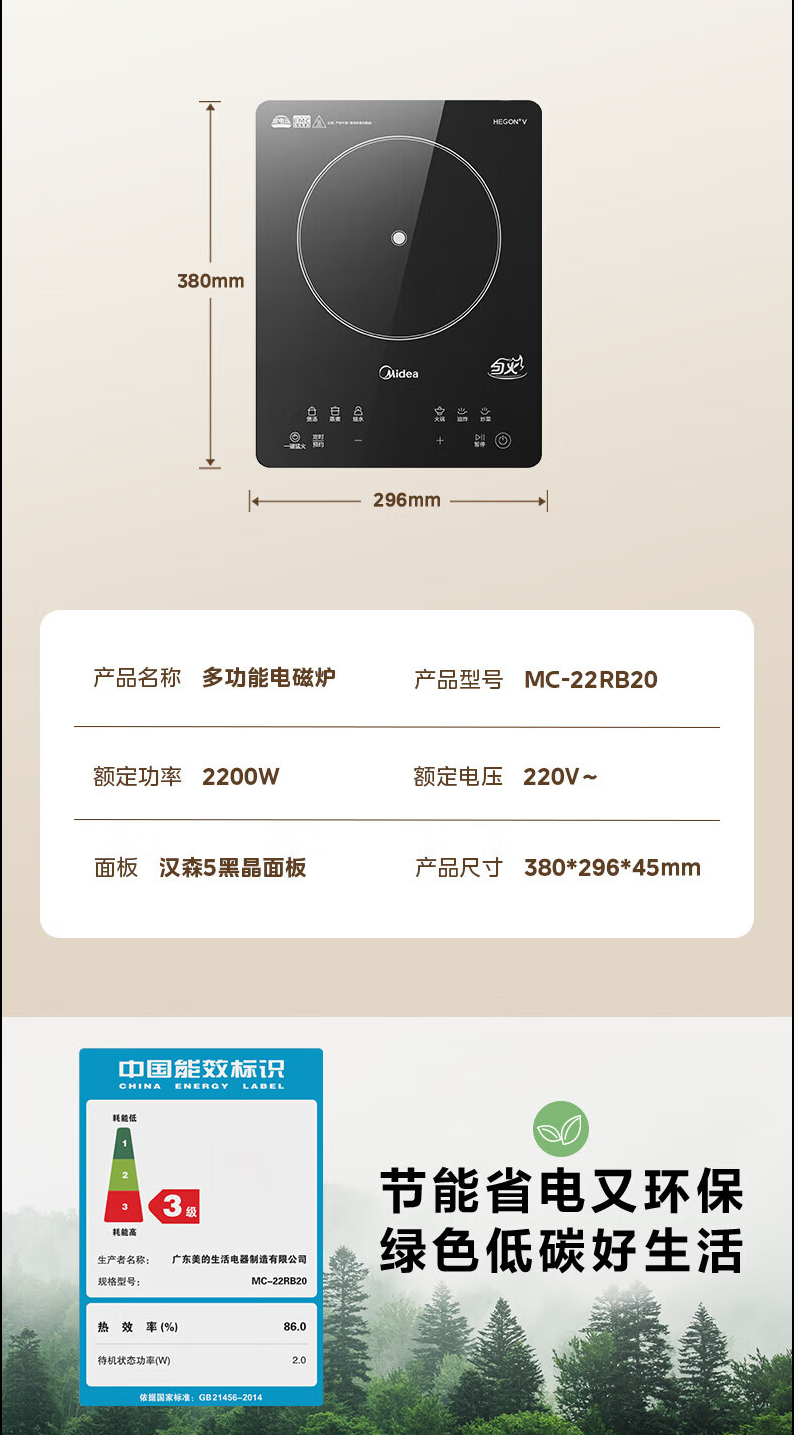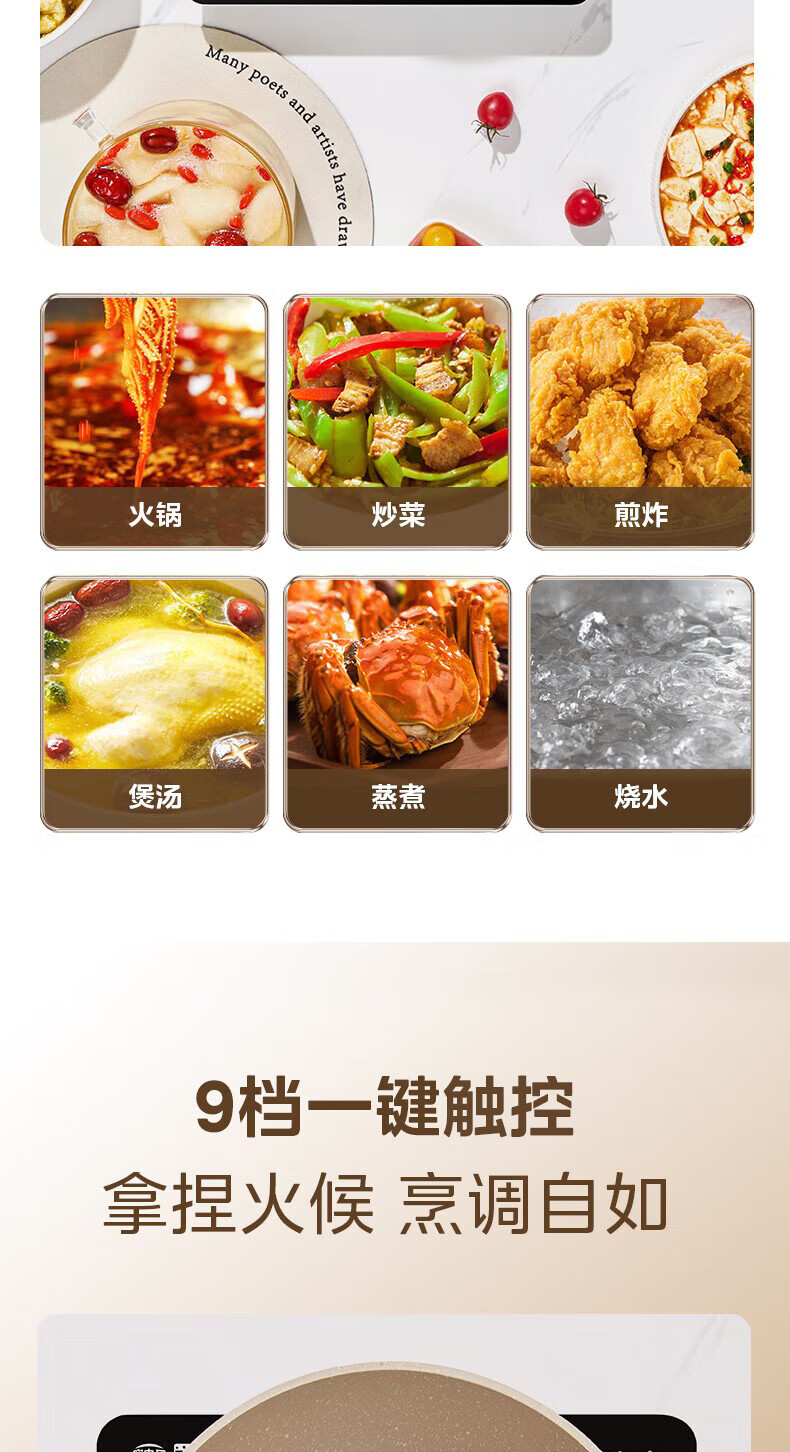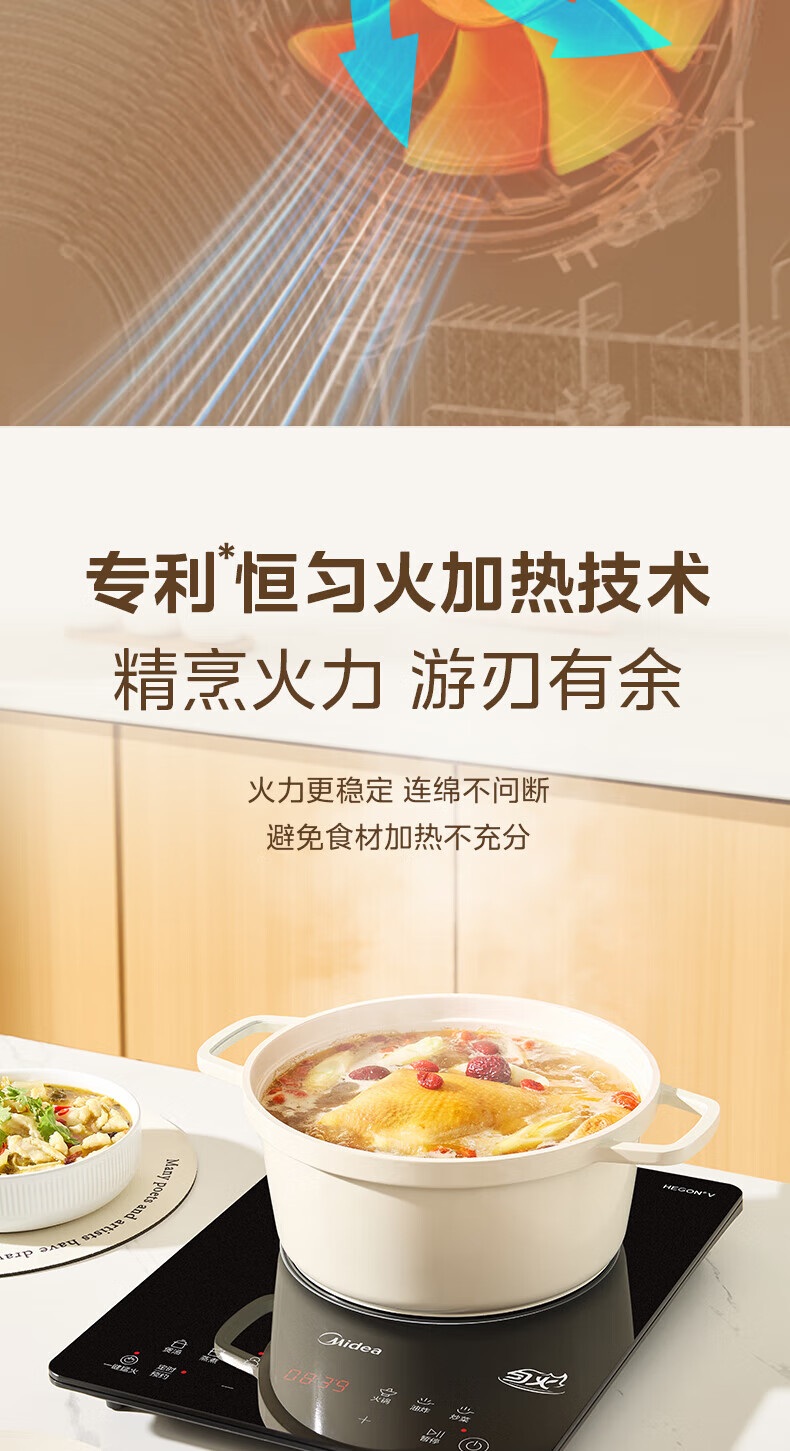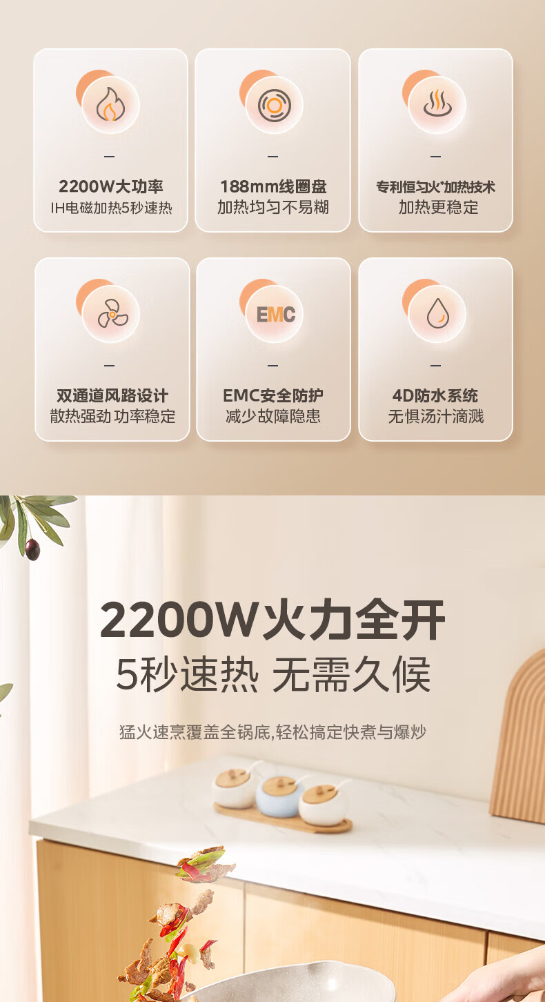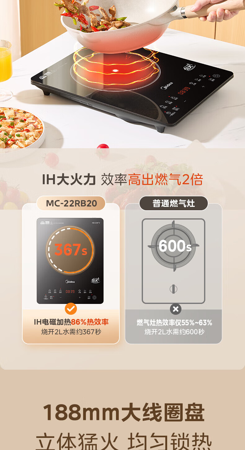 美的(Midea)电磁炉家用火锅2200W大功率电磁灶带锅套装炒锅汤锅一键爆炒触控面板电池炉大火力22RB20