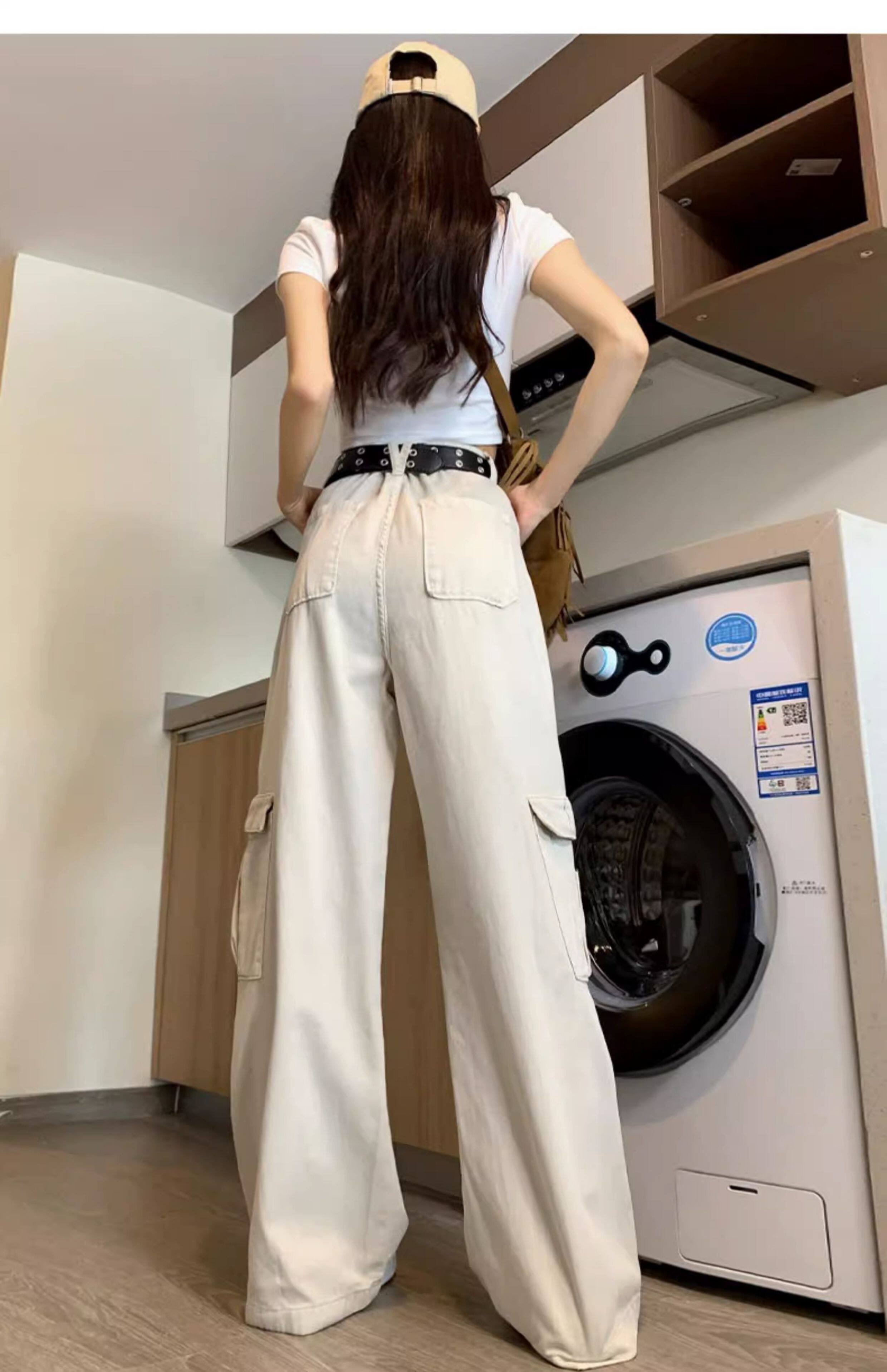 浪莎工装牛仔裤女春季新款休闲裤小个子高腰宽松阔腿裤显瘦百搭直筒裤 米杏色 【遮肉宽松大口袋】 XL 【推荐120-130斤】