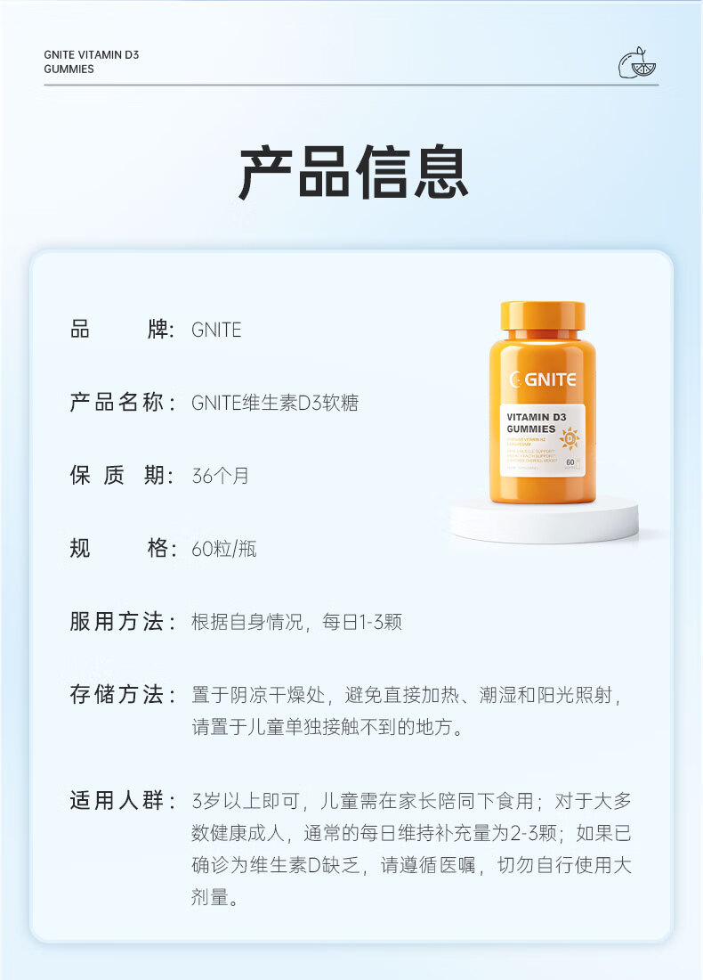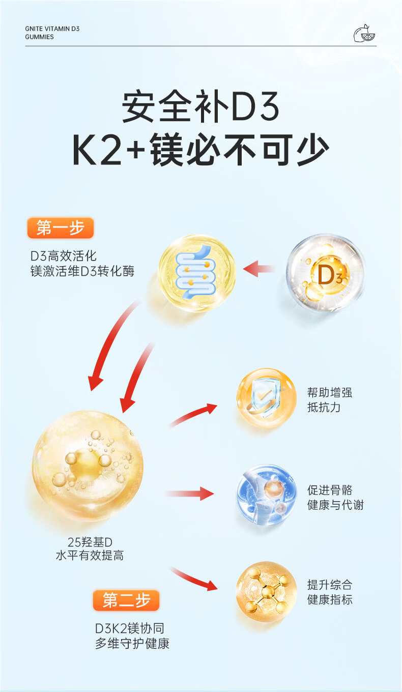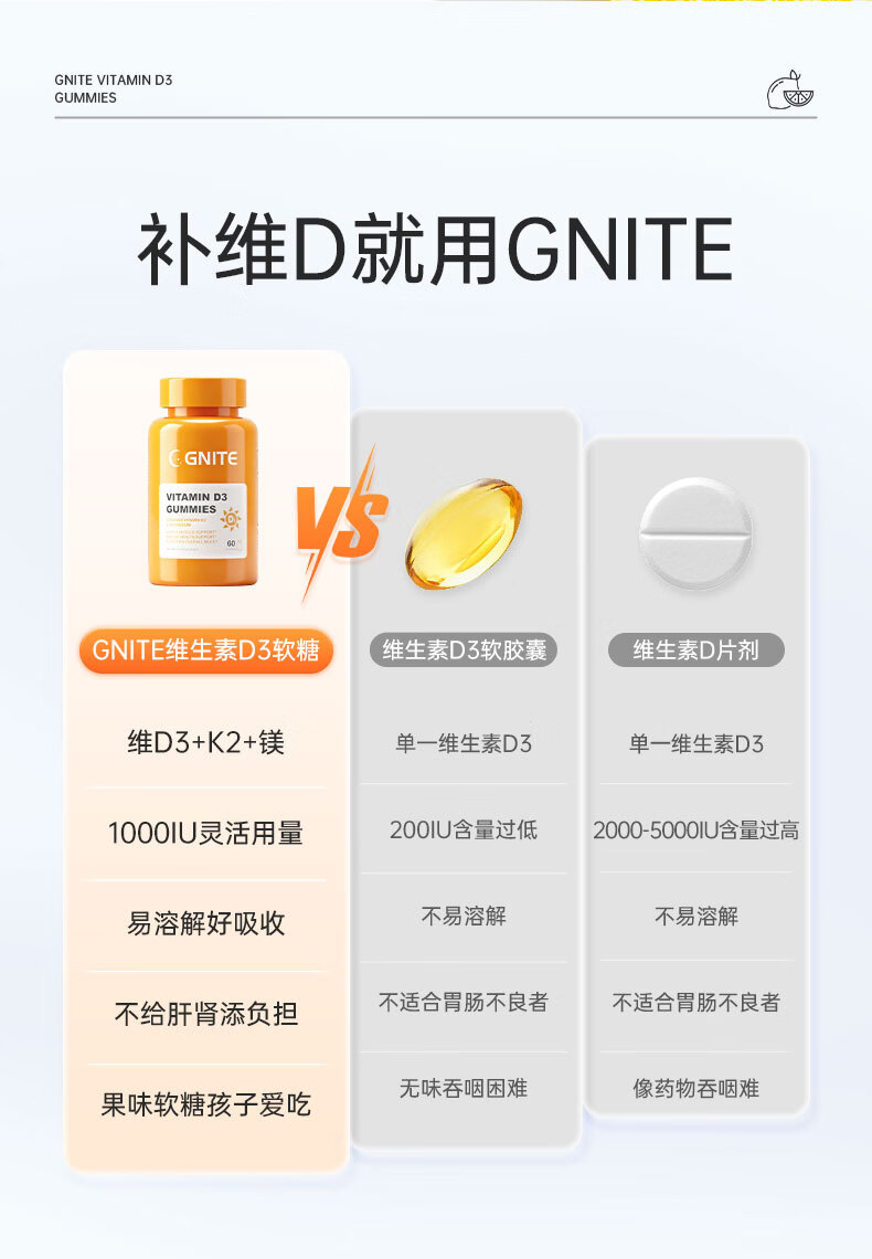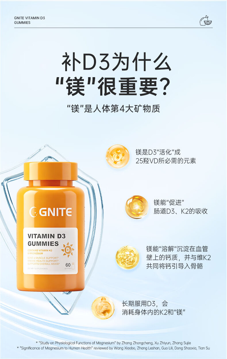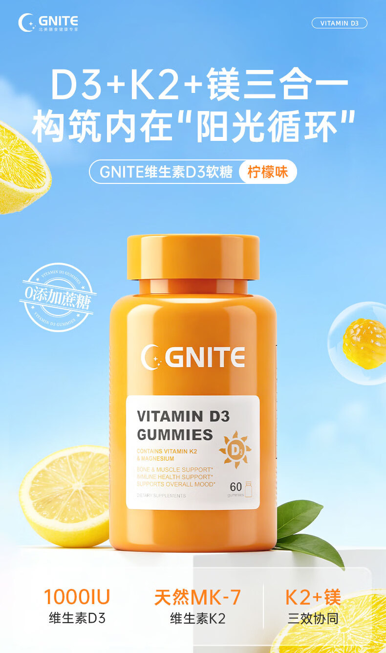 GNITE维生素D3+K2+镁三合一阳光瓶补钙成人儿童青少年软糖60粒 维D阳光瓶 60粒*1瓶
