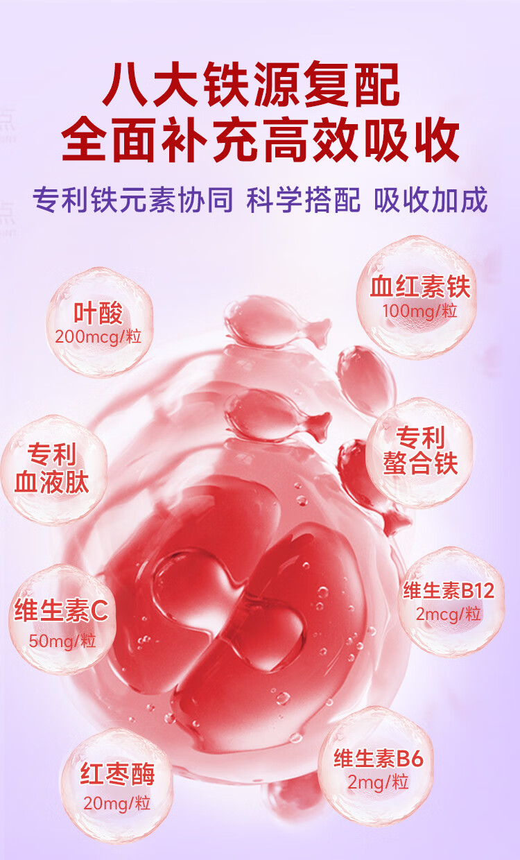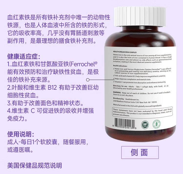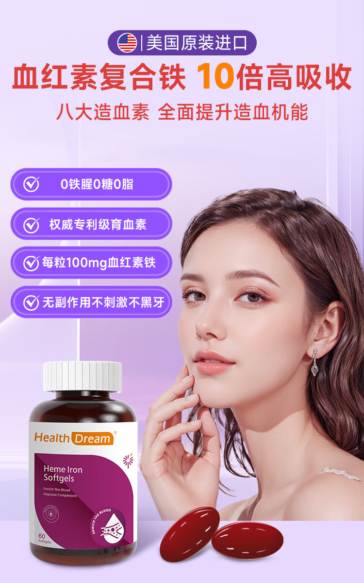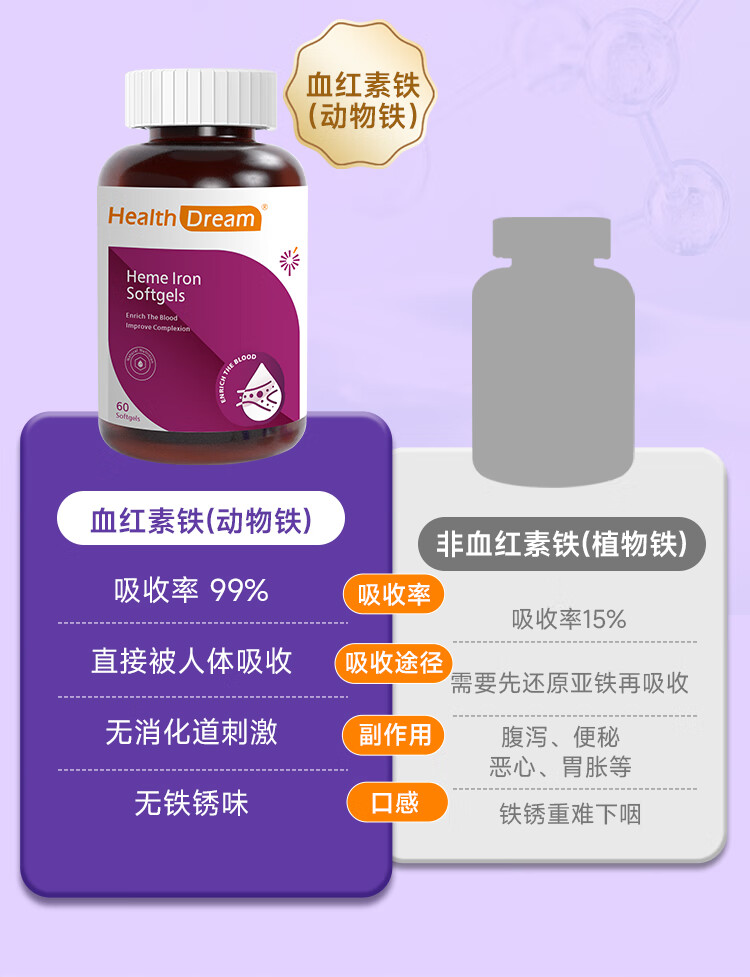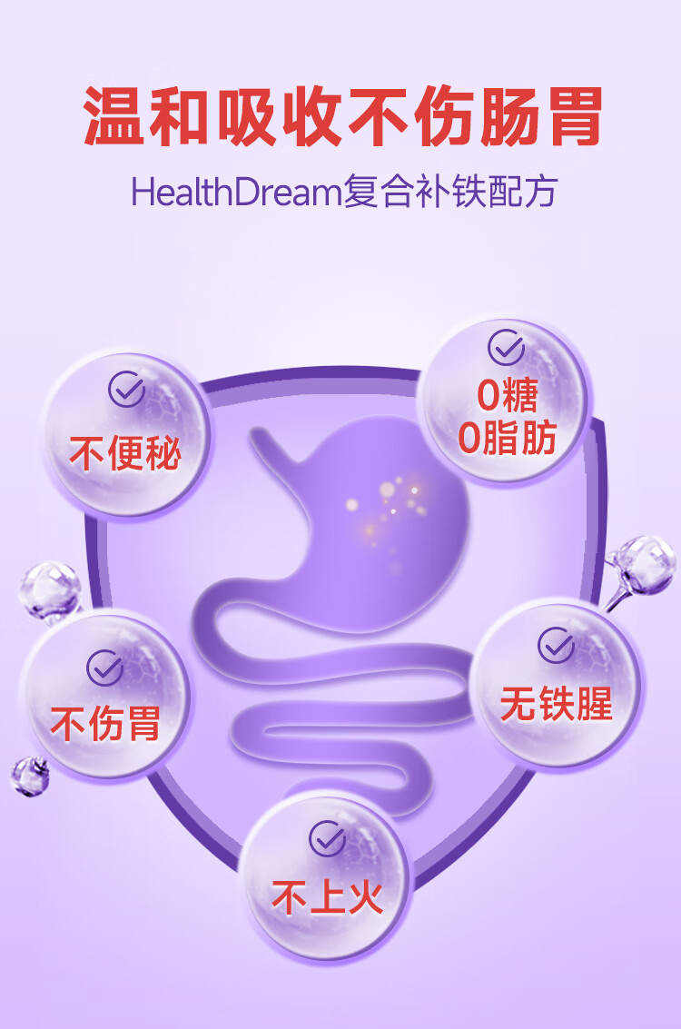 healthdream成人补铁补血补气血改善贫血铁剂铁片女孕妇哺乳期铁元素叶酸维c 2瓶装(60粒/瓶)