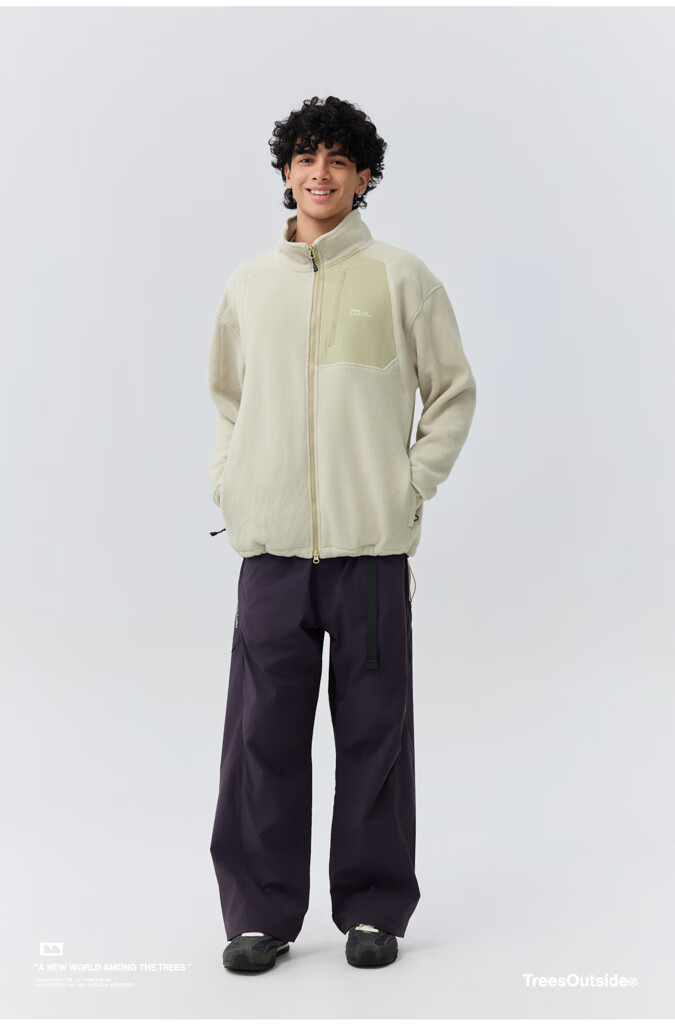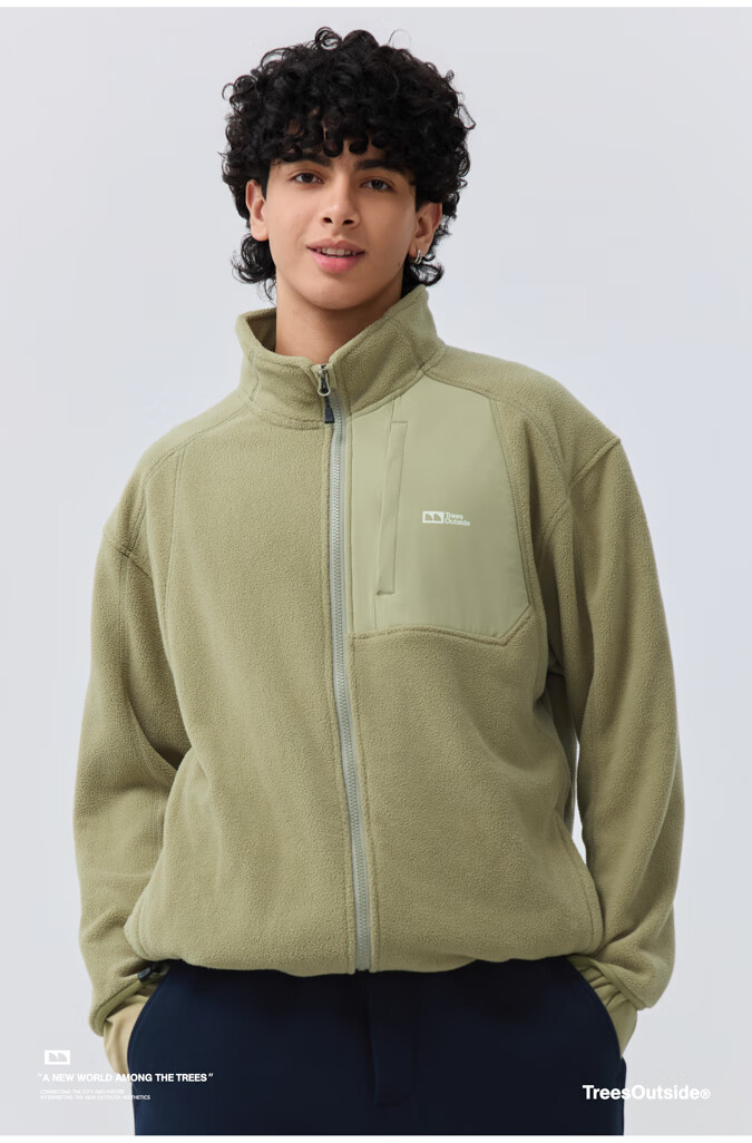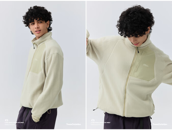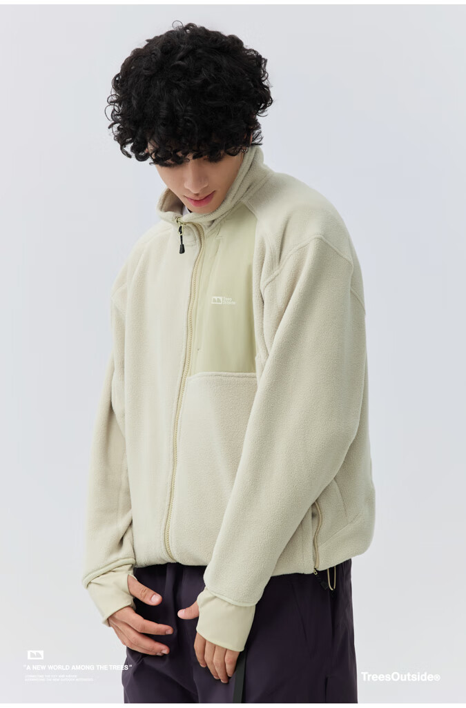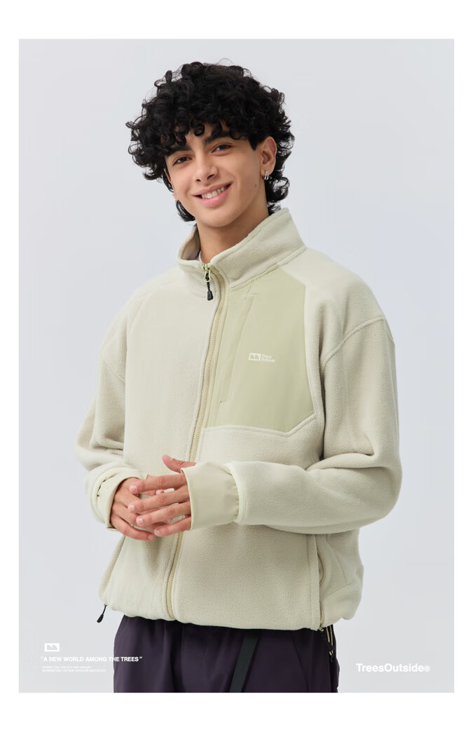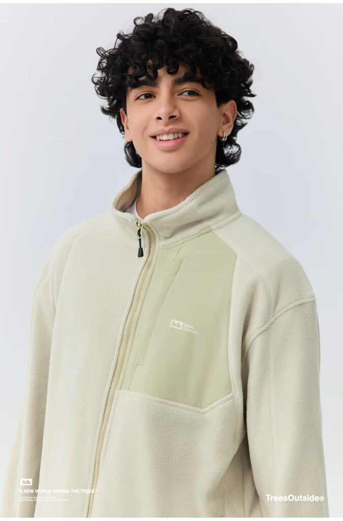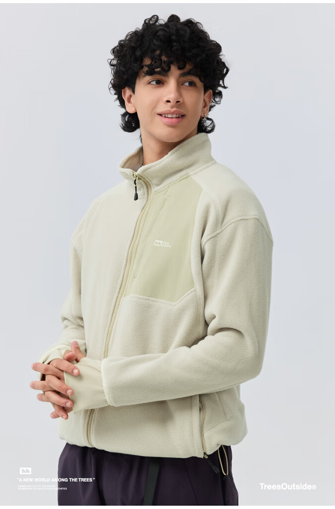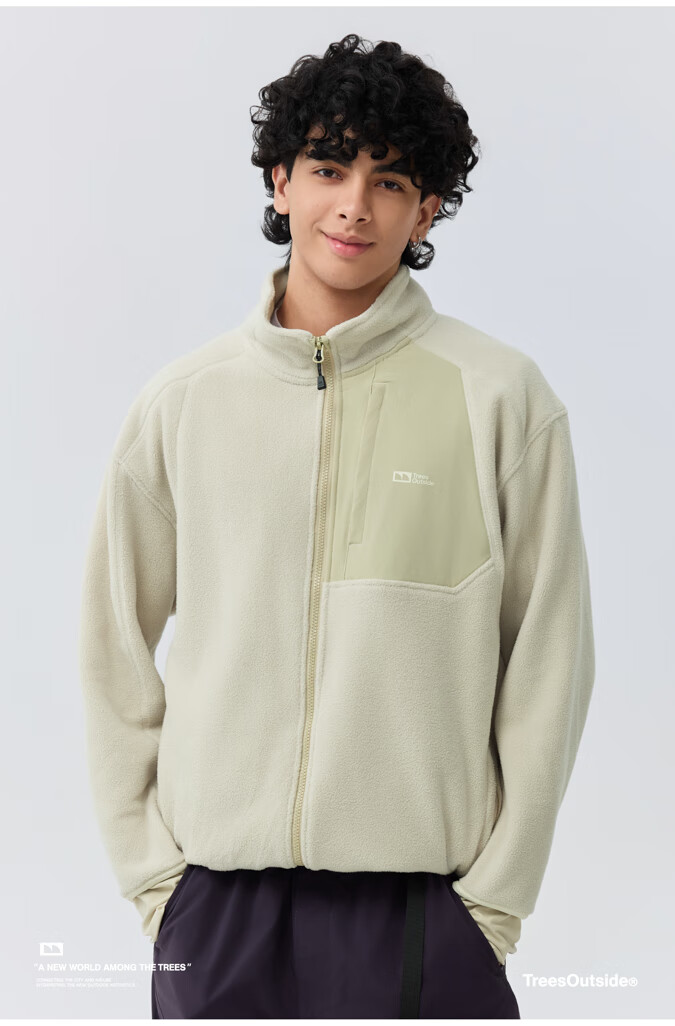warmtreesTreesOutside秋冬拼接冚线立领250g摇粒绒夹克外套运动上衣服 卵石色+浅米白 S