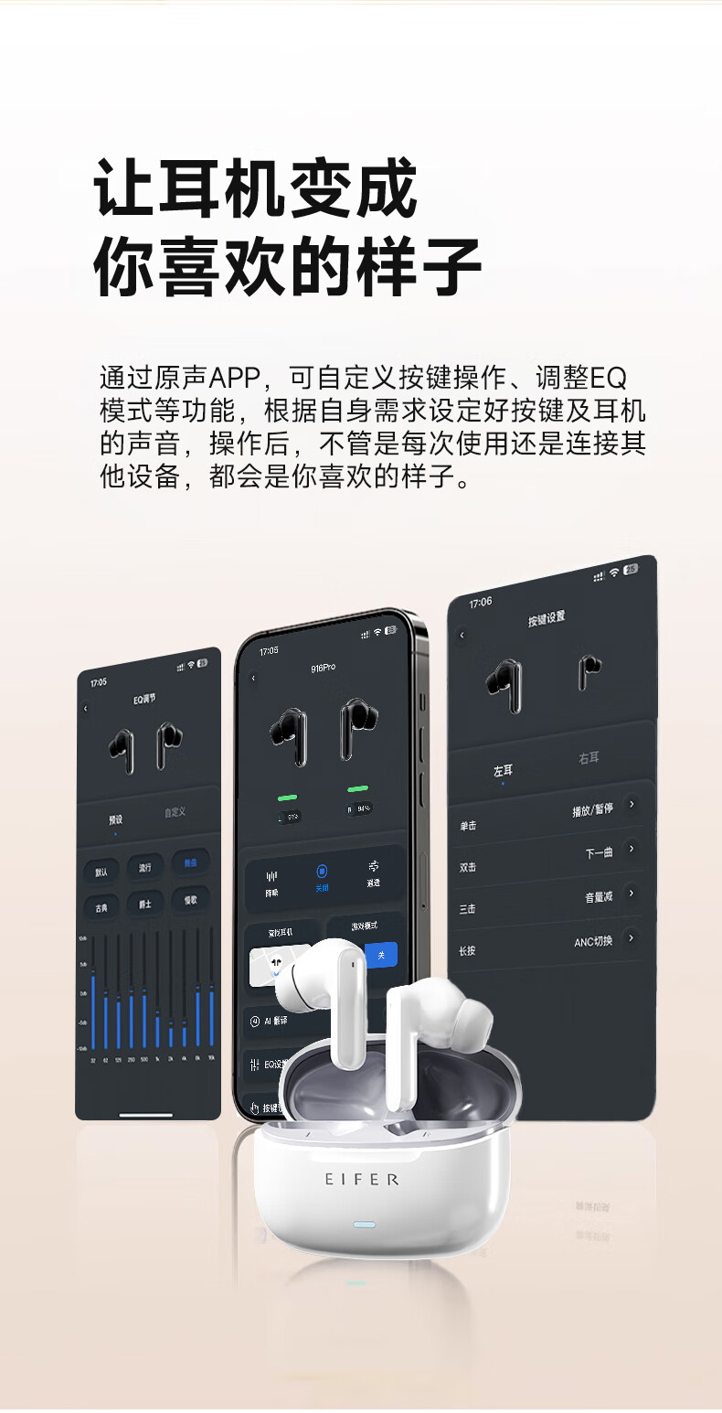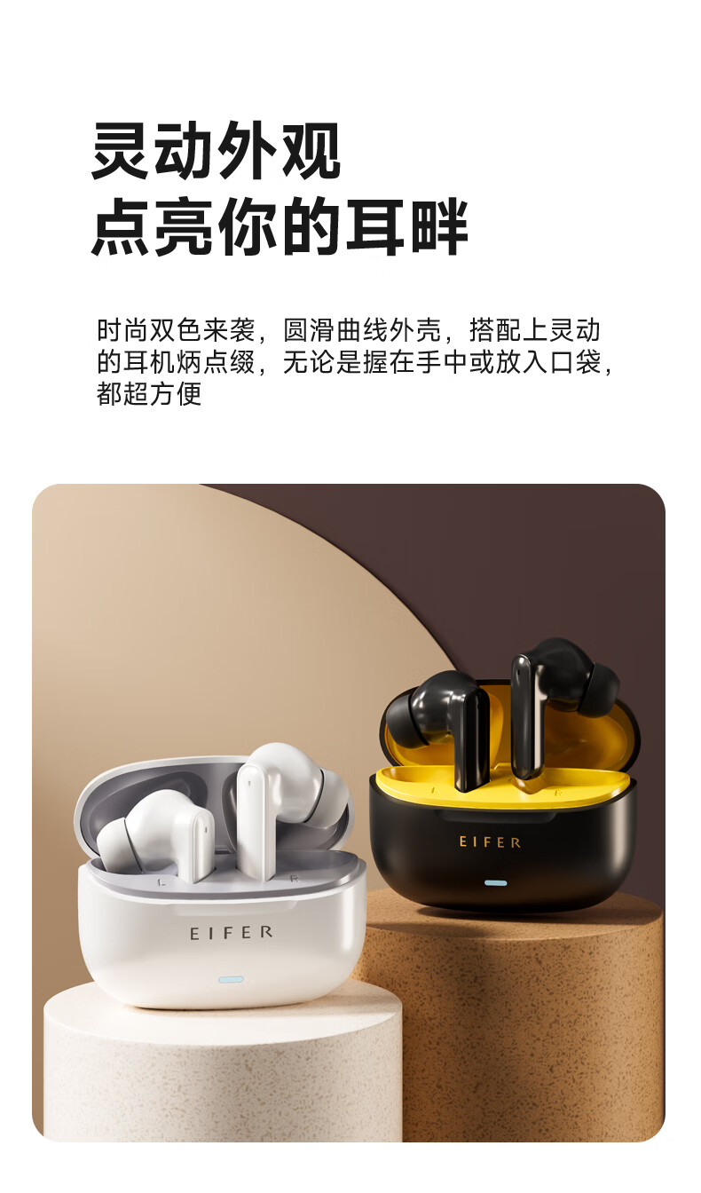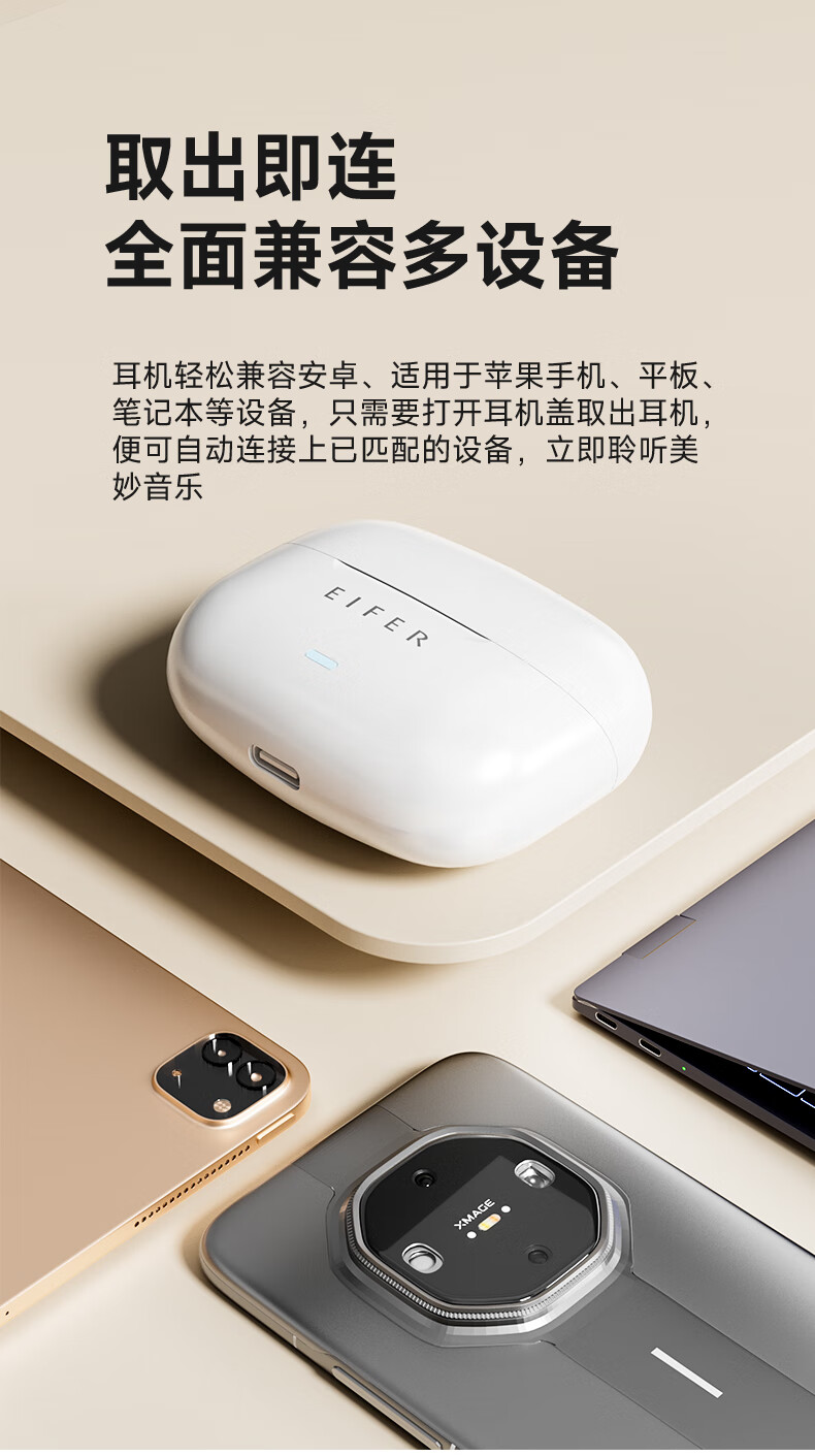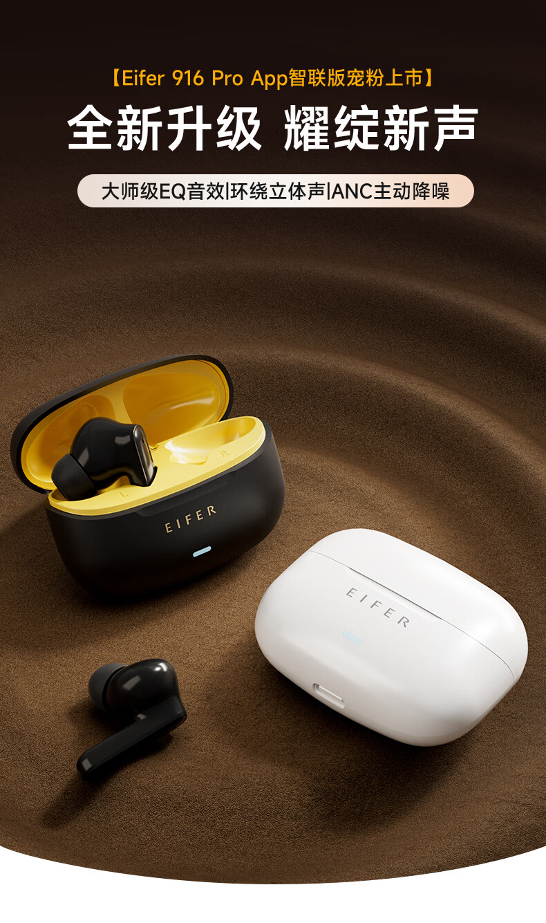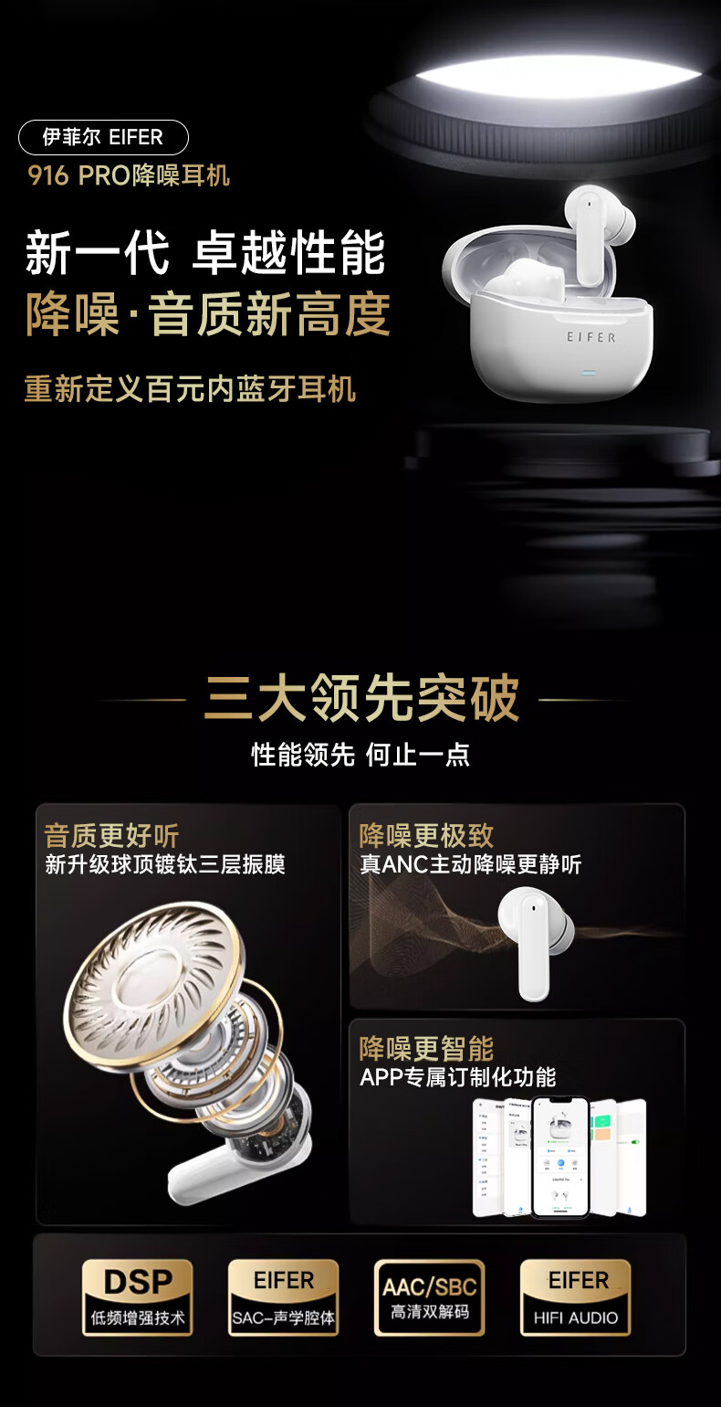 伊菲尔(Eifer) 916 Pro 主动降噪无线蓝牙耳机入耳式高音质超长续航游戏模式防水防汗运动 流光白(智联APP版) ANC主动降噪+低音增强+定位查找