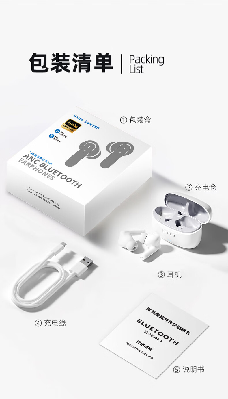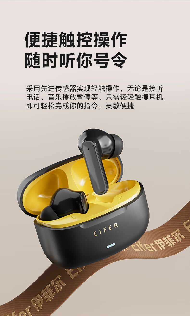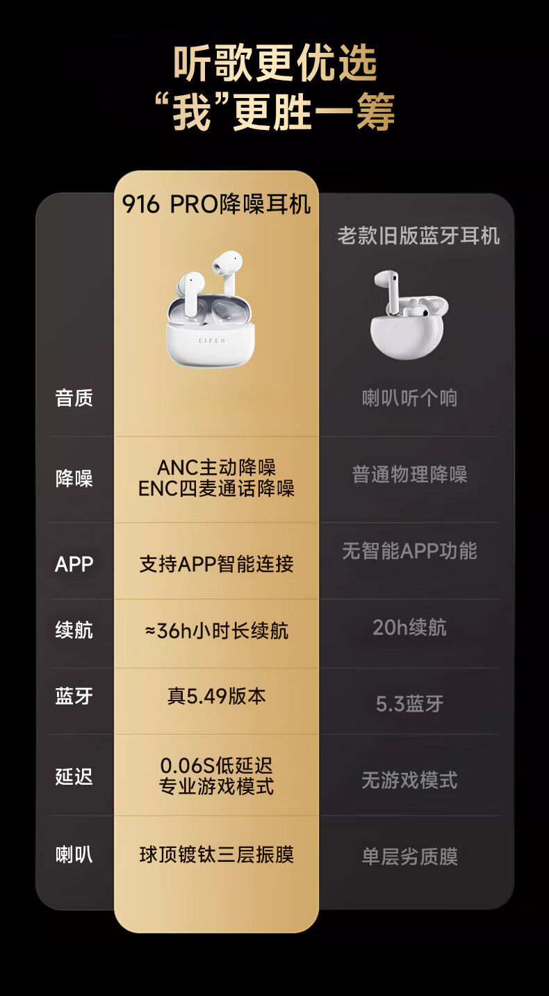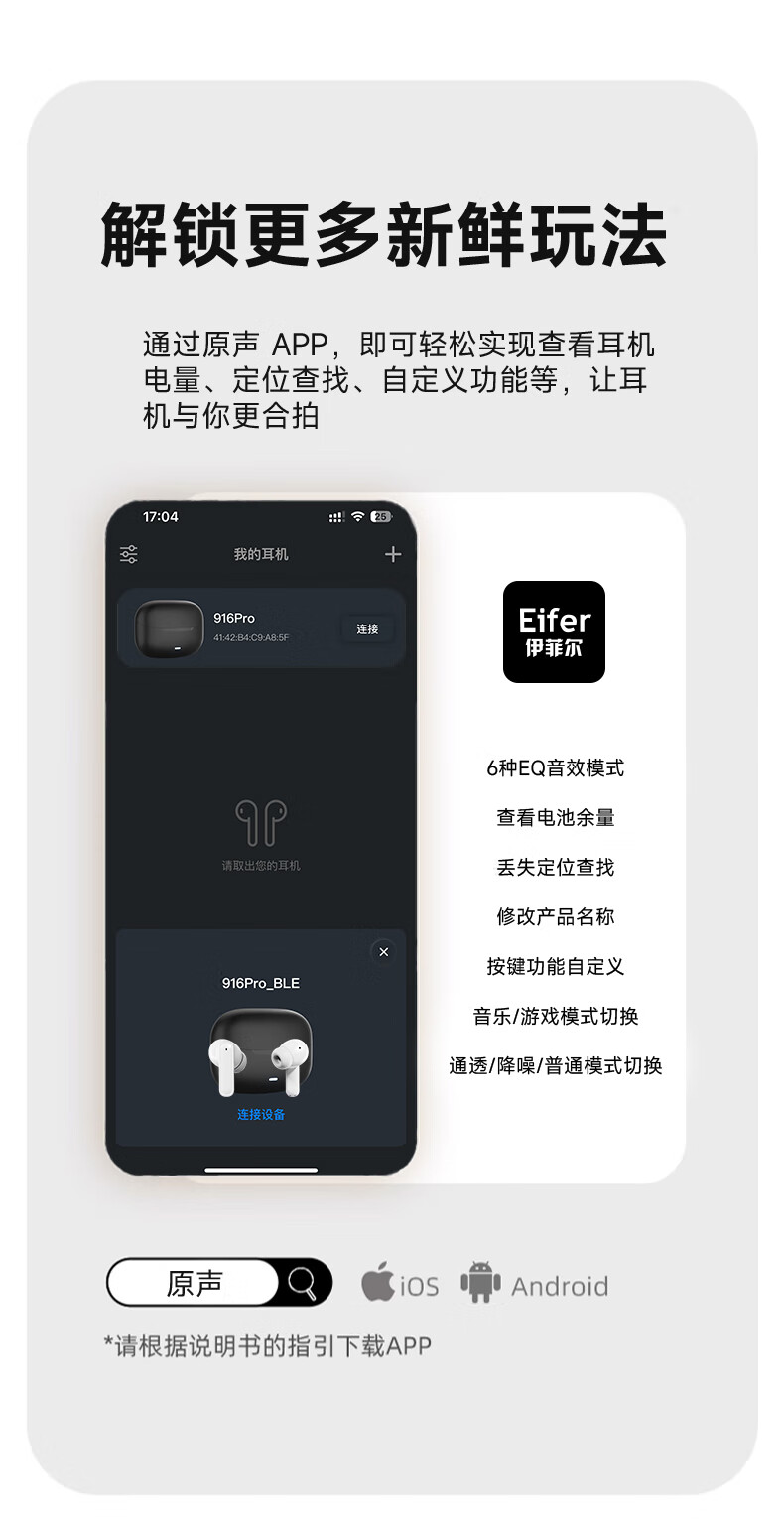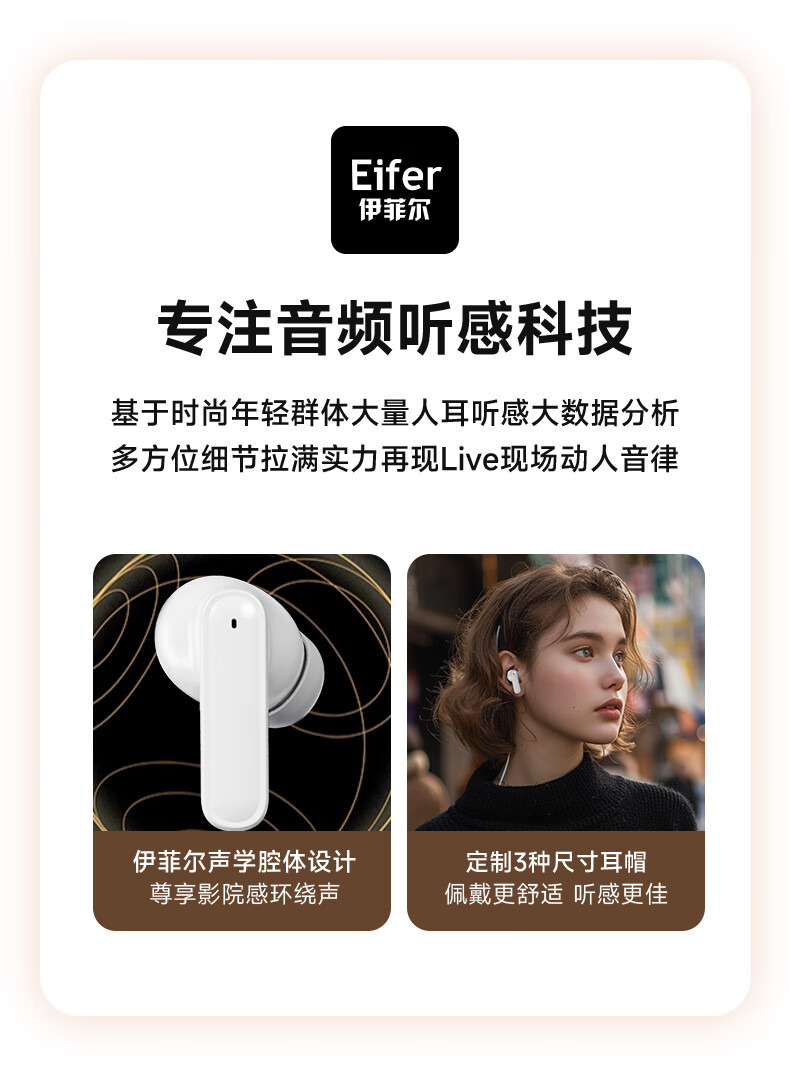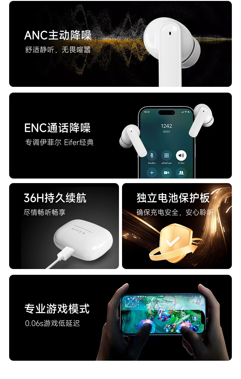 伊菲尔(Eifer) 916 Pro 主动降噪无线蓝牙耳机入耳式高音质超长续航游戏模式防水防汗运动 流光白(智联APP版) ANC主动降噪+低音增强+定位查找