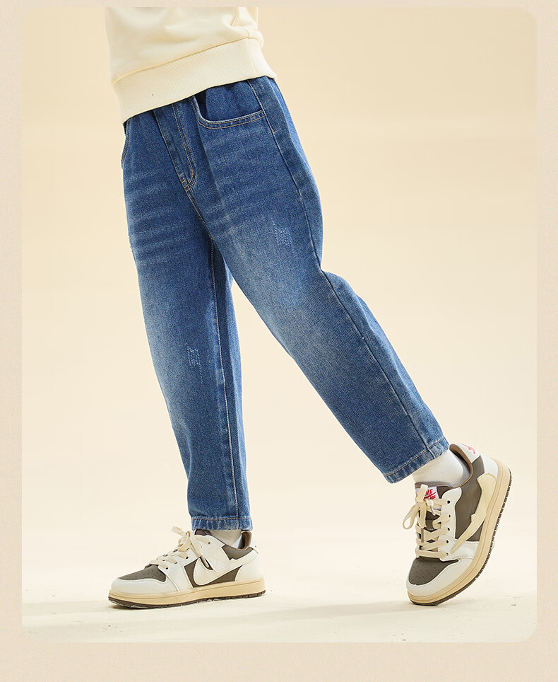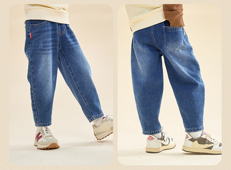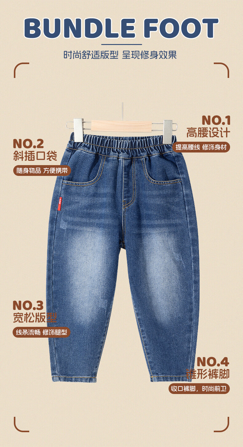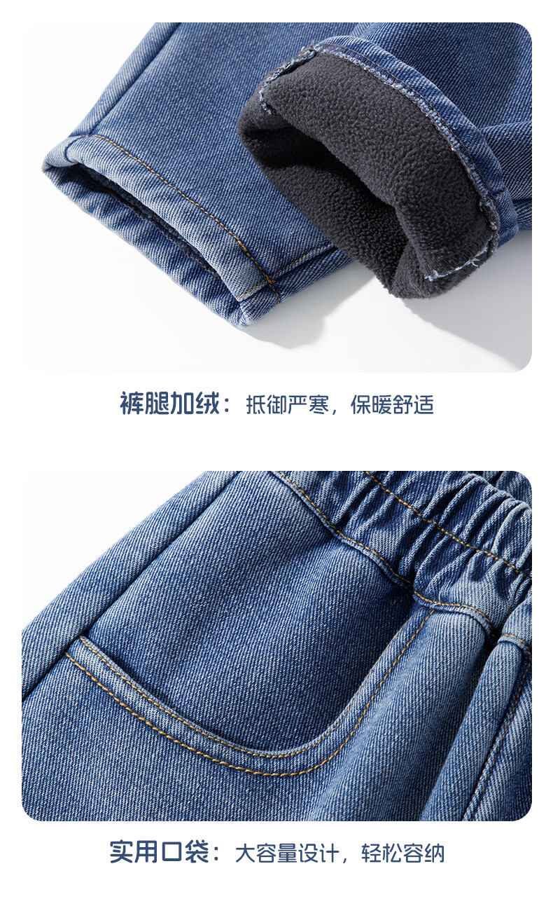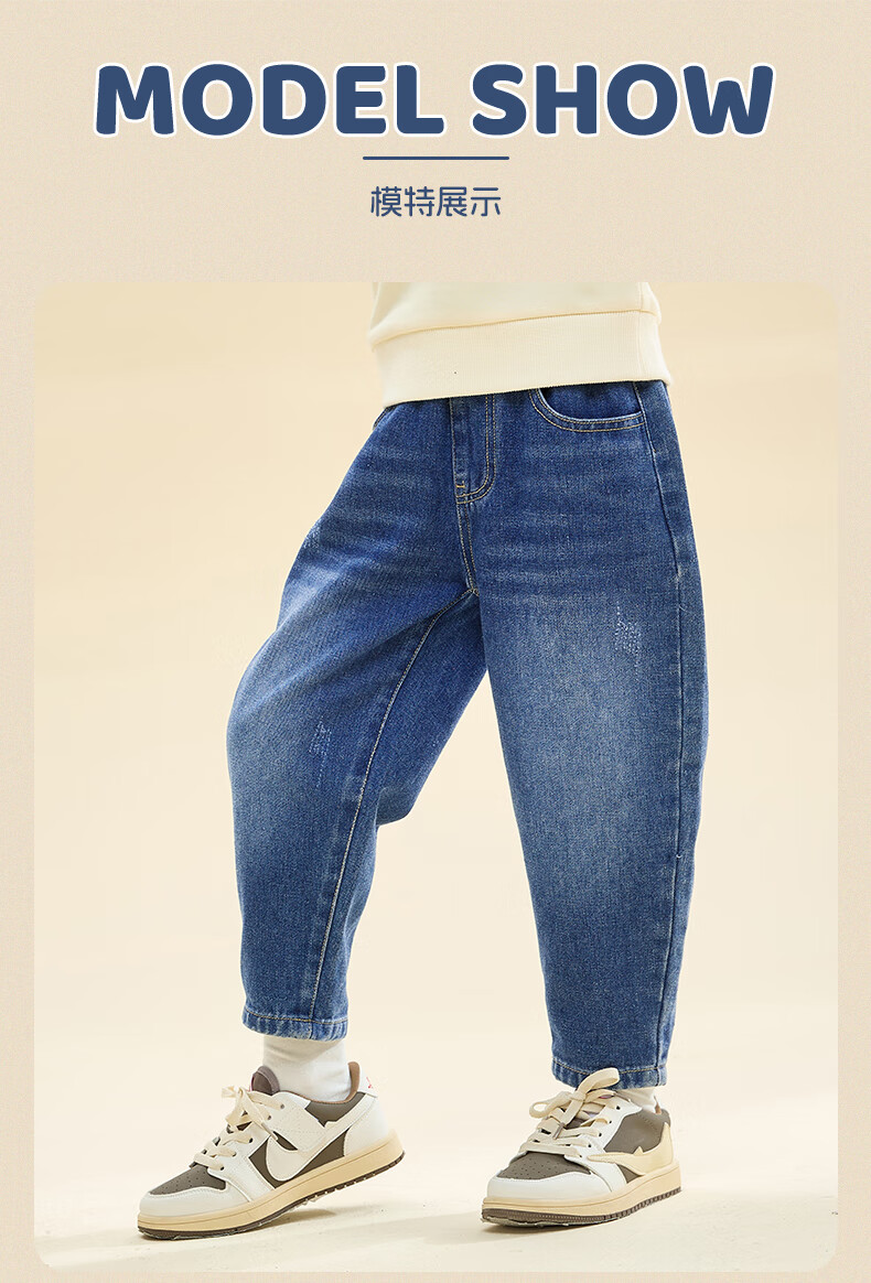 小猪班纳男童牛仔裤2026春季新款中大童束口裤子春秋款儿童时髦休闲萝卜裤 【加绒款】浅蓝/白线条K 140
