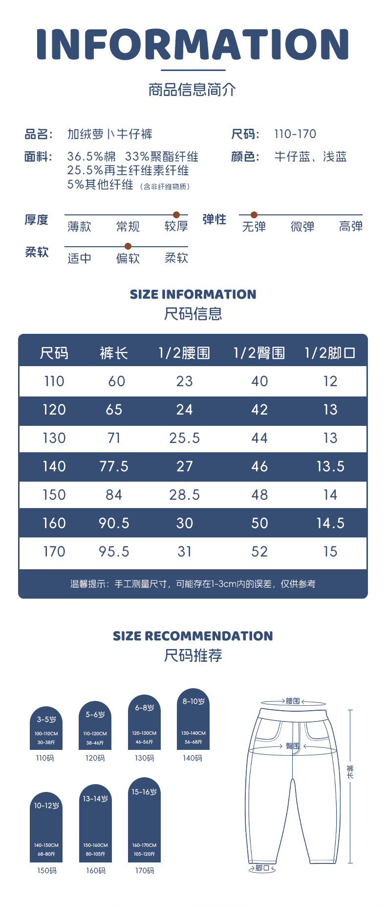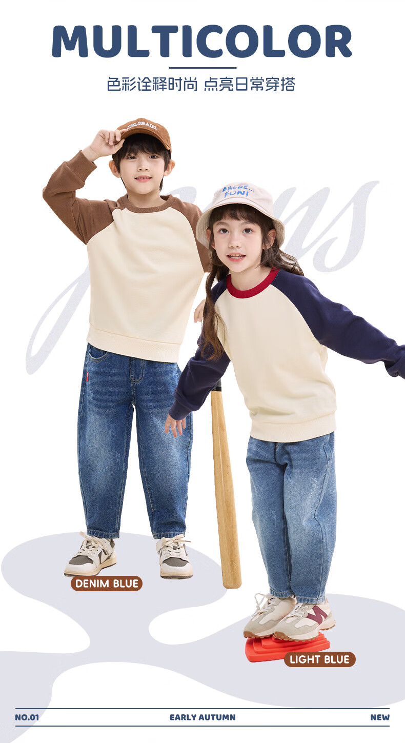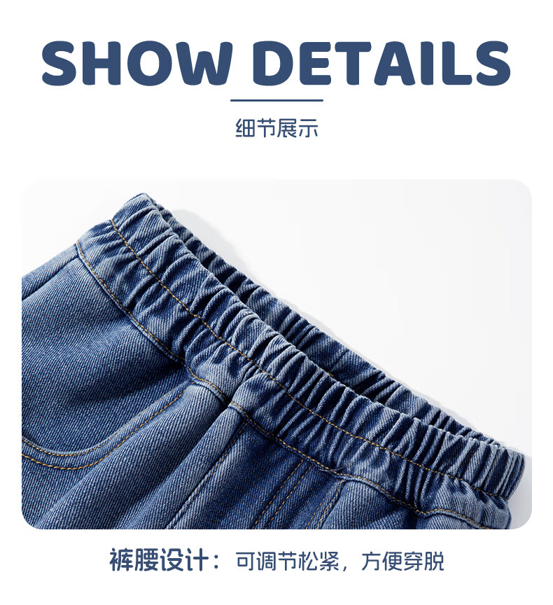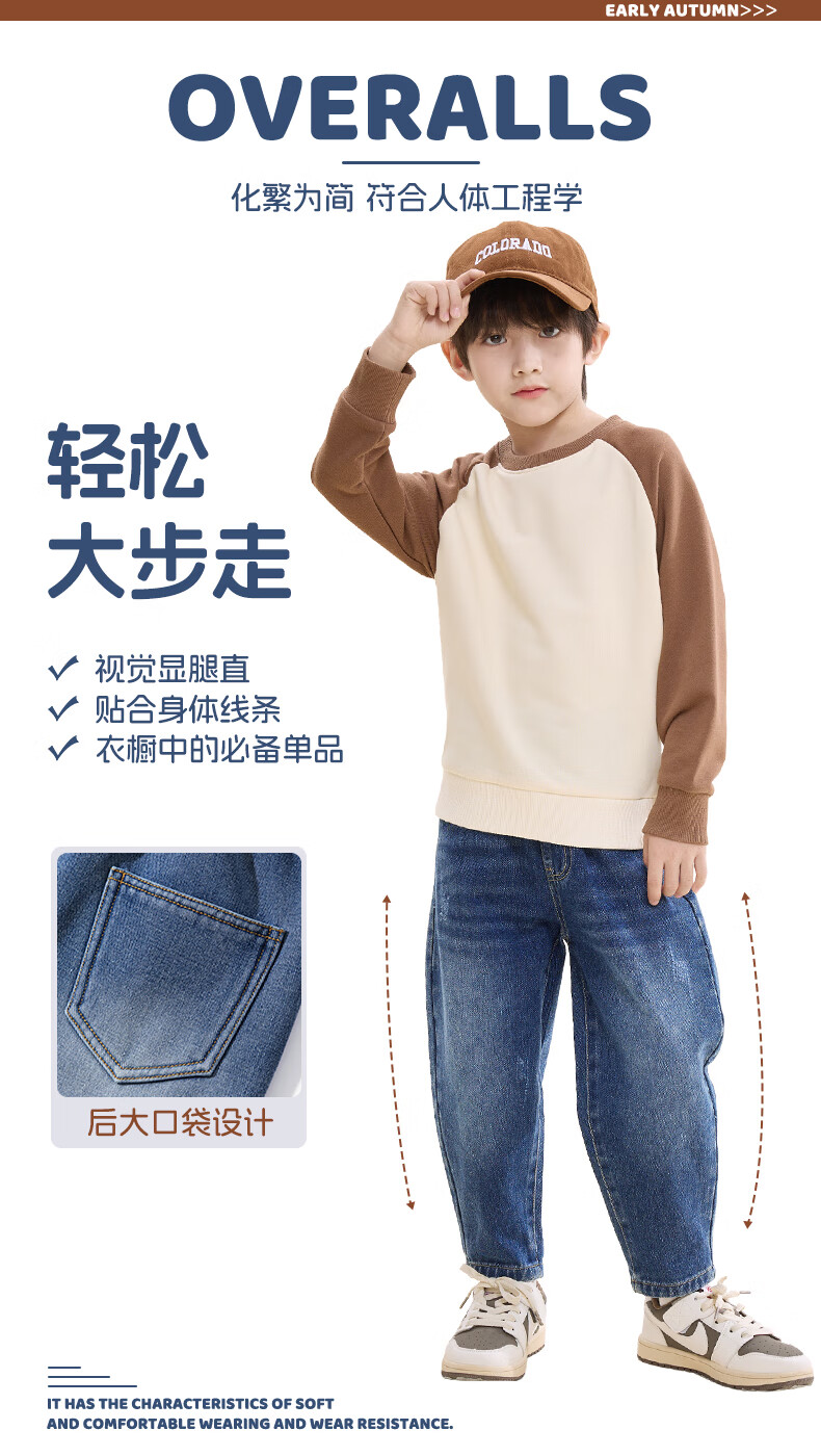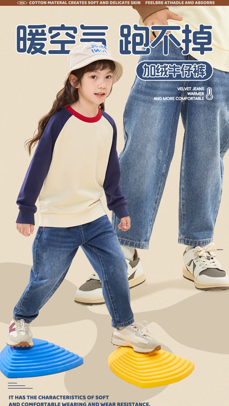 小猪班纳男童牛仔裤2026春季新款中大童束口裤子春秋款儿童时髦休闲萝卜裤 【加绒款】浅蓝/白线条K 140