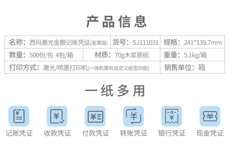 西玛(SIMAA)用友凭证纸KPJ103发票版 凭证打印纸激光金额记账凭证用友软件适用 2000份/箱