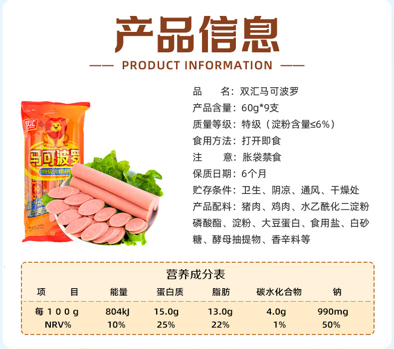 双汇 马可波罗特级火腿肠香肠 60g*9支 休闲零食 露营 出游烧烤 速食