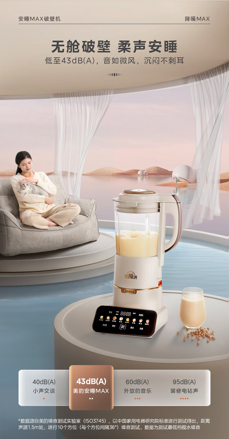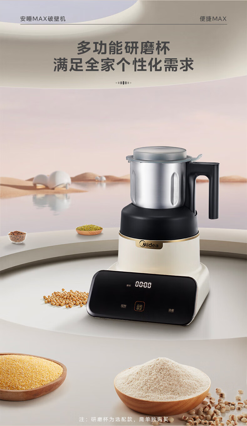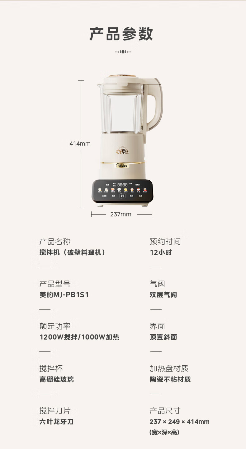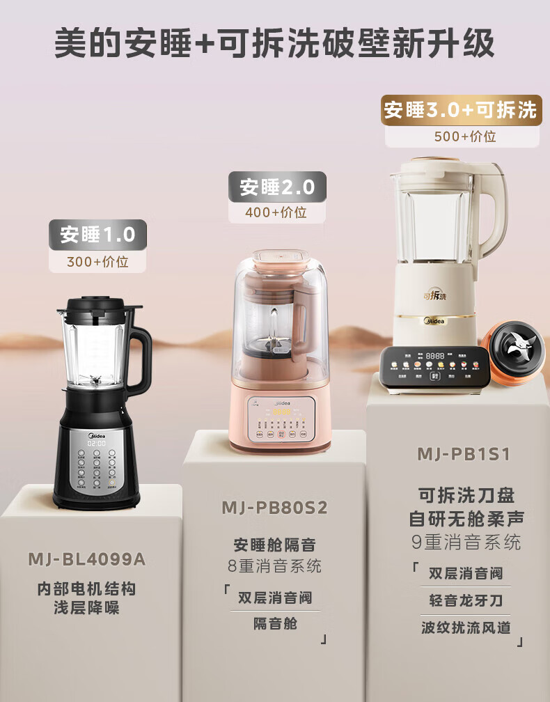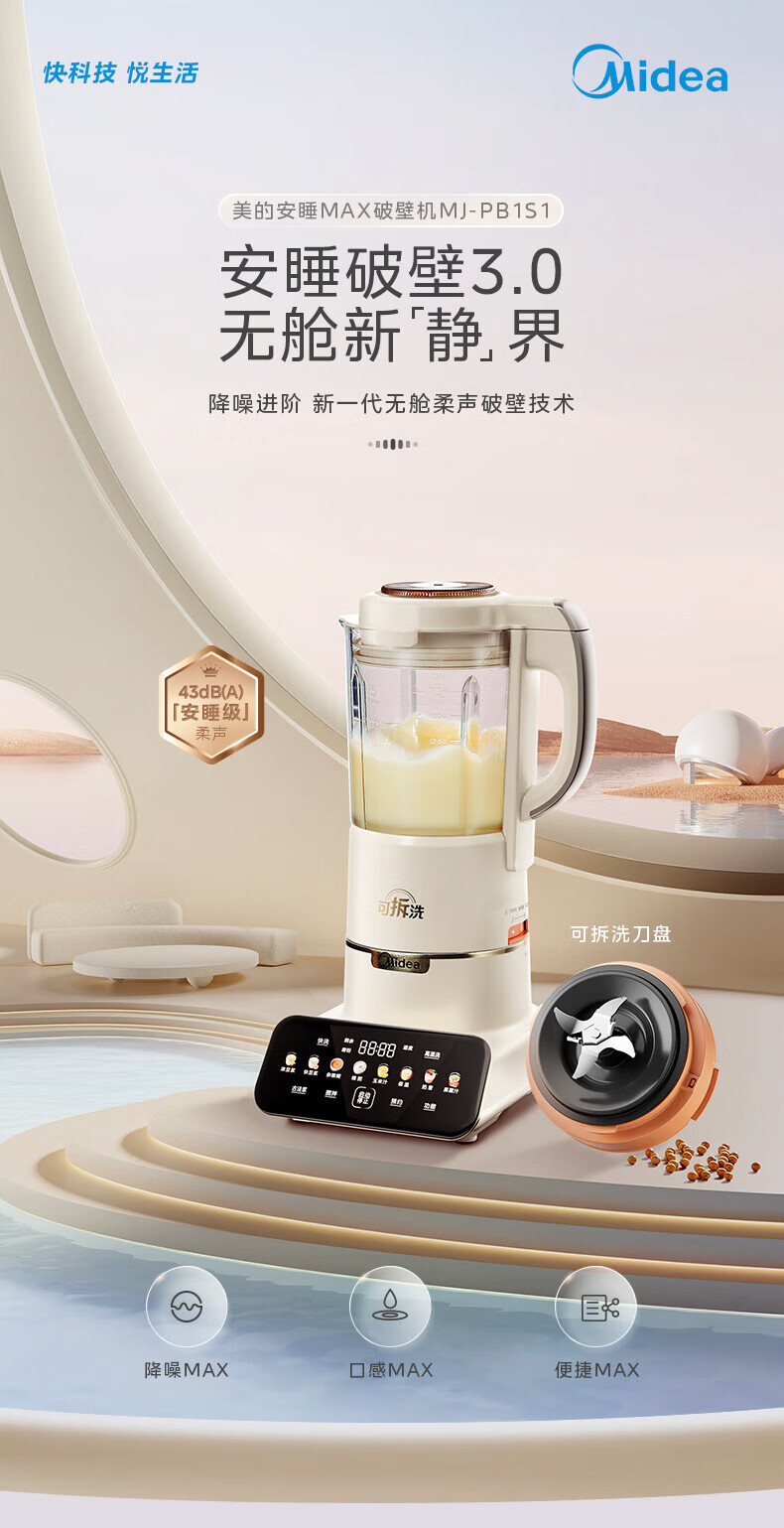 美的(Midea)破壁机豆浆机家用可拆洗1.75L大容量榨汁机安睡Max智能多功低音果汁玉米汁米糊料理机 MJ-PB1S1 【升级】可拆洗~智频电机无仓安睡