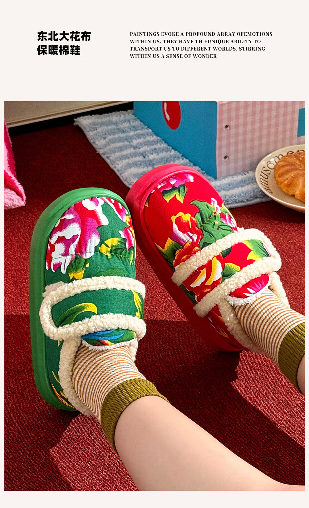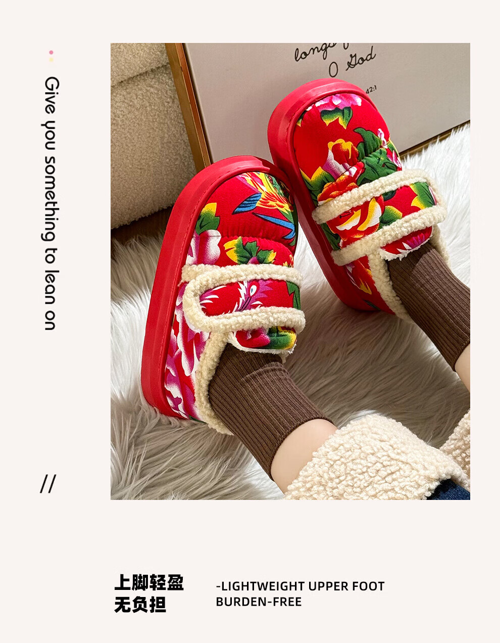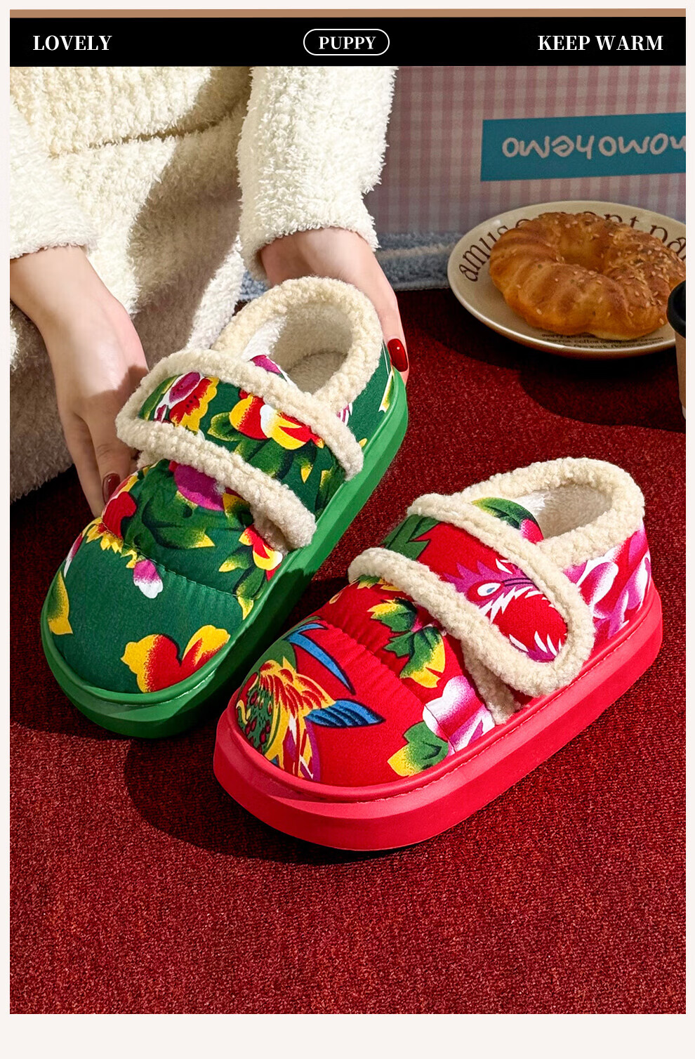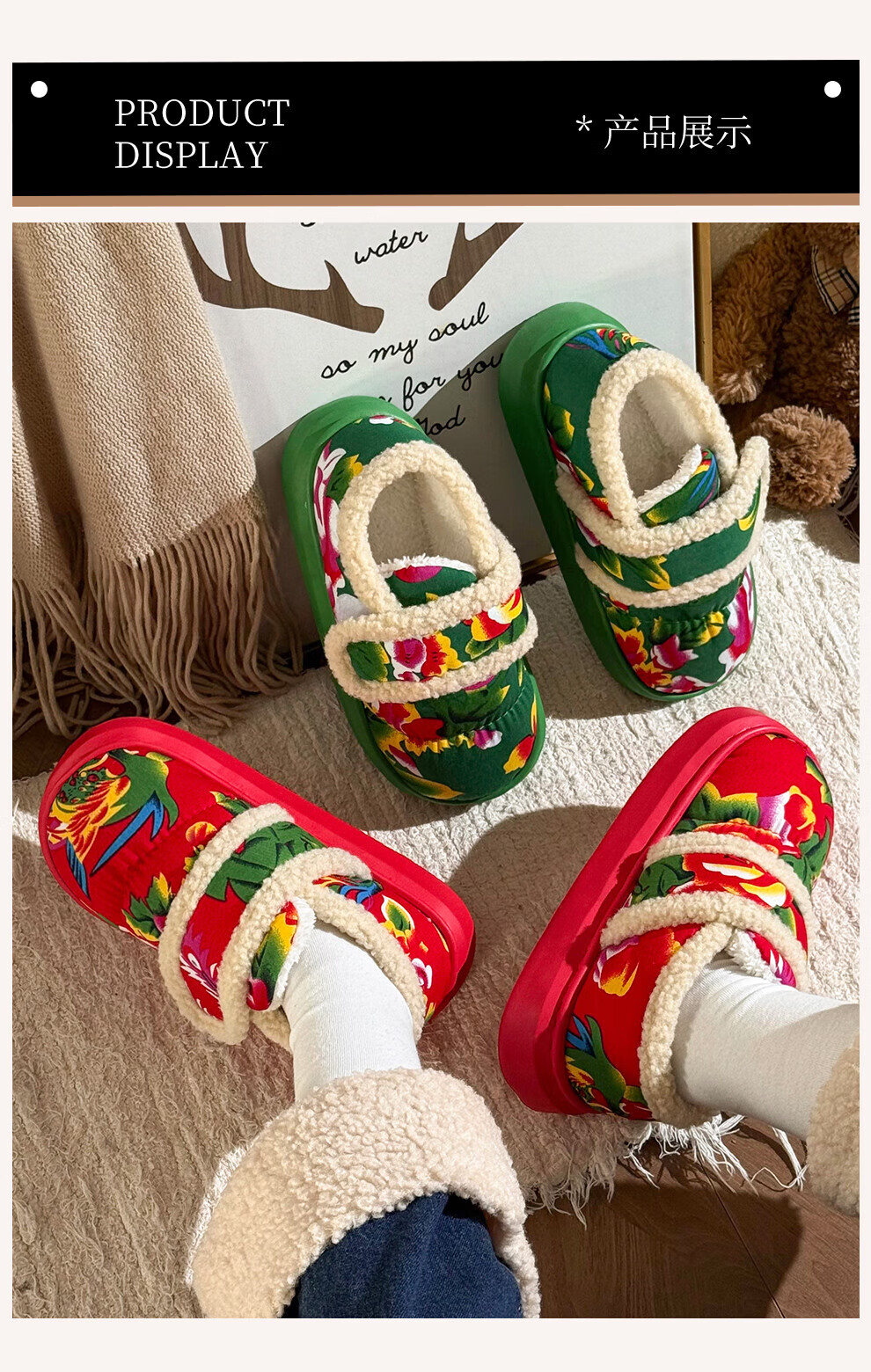 FZT东北大花棉鞋秋冬季女款包跟厚底保暖羊羔绒居家防滑魔术贴毛拖鞋 红色【东北大花棉鞋】 36-37 标准码