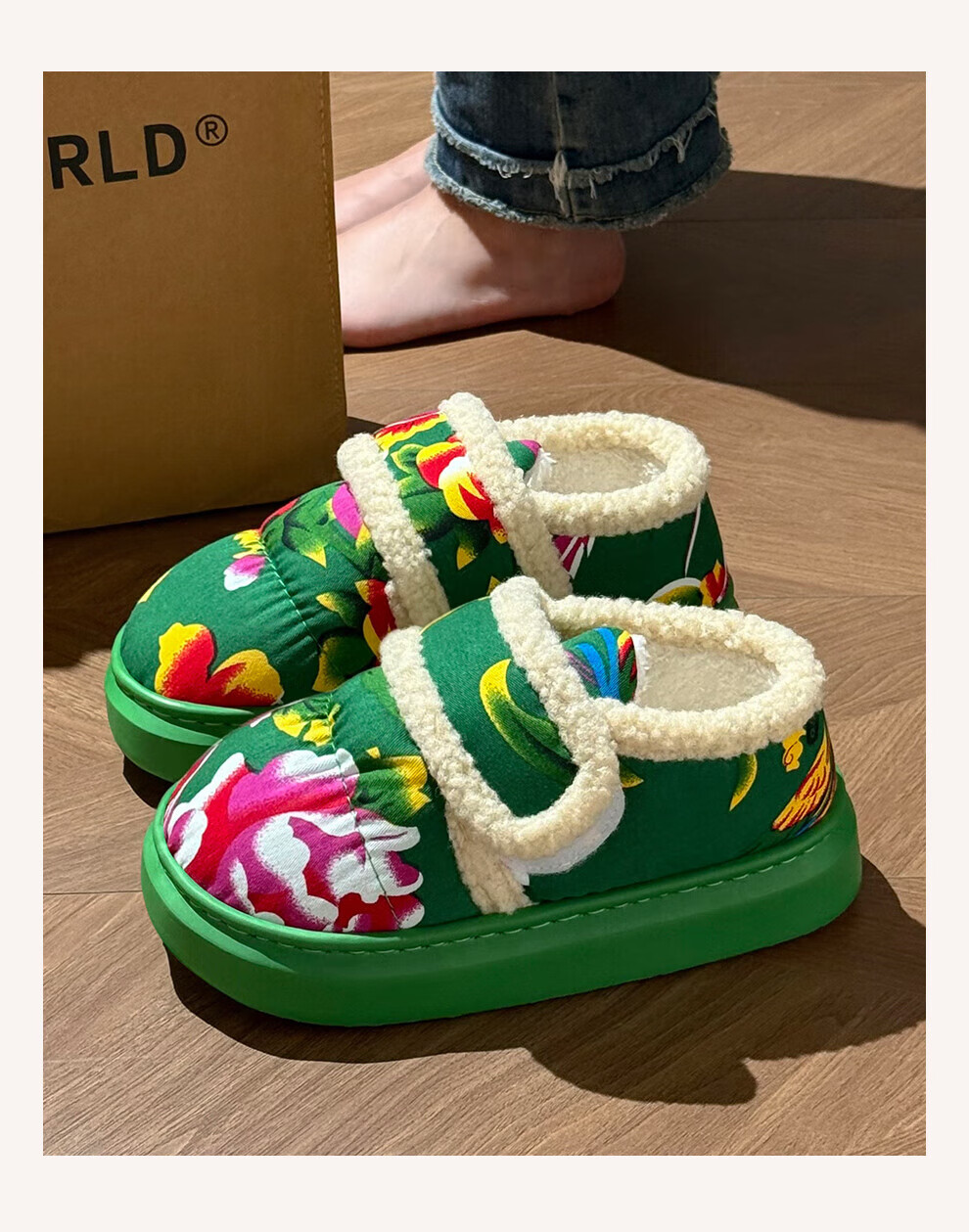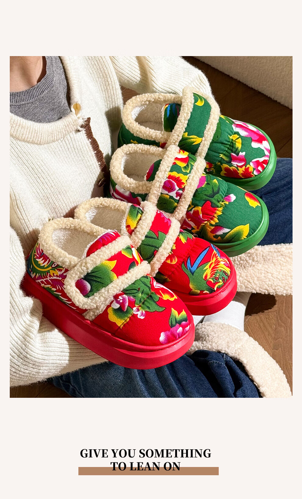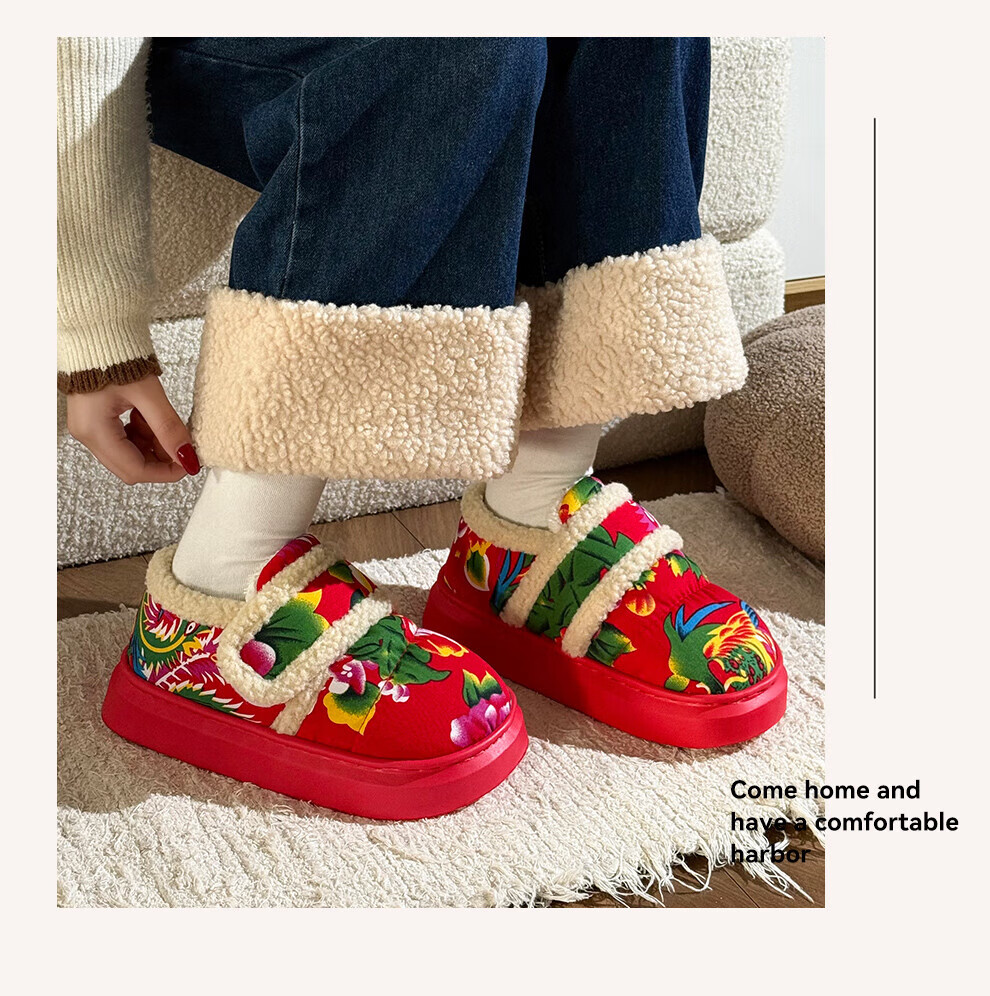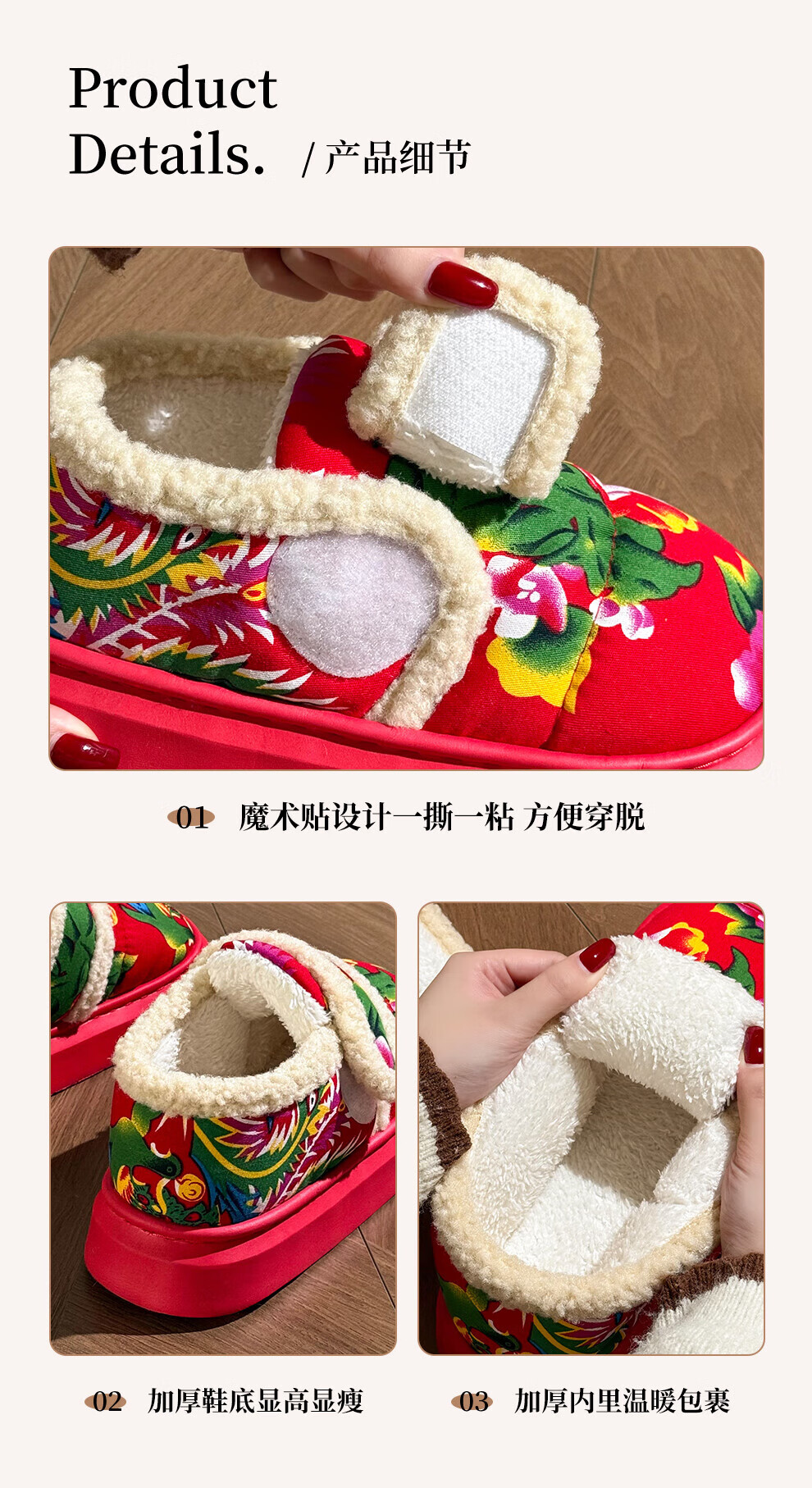 FZT东北大花棉鞋秋冬季女款包跟厚底保暖羊羔绒居家防滑魔术贴毛拖鞋 红色【东北大花棉鞋】 36-37 标准码