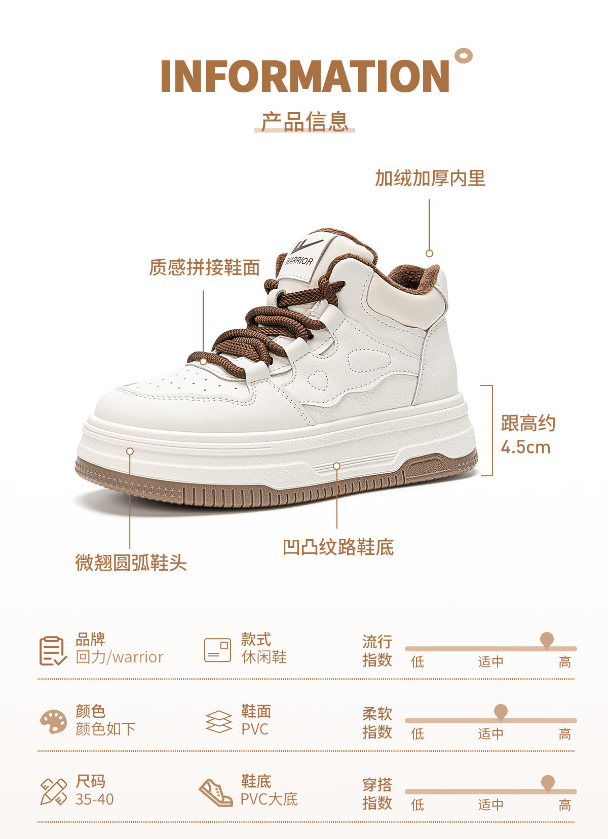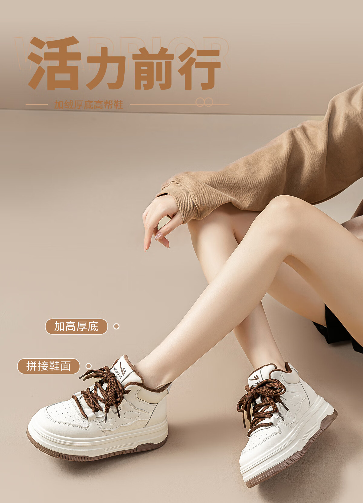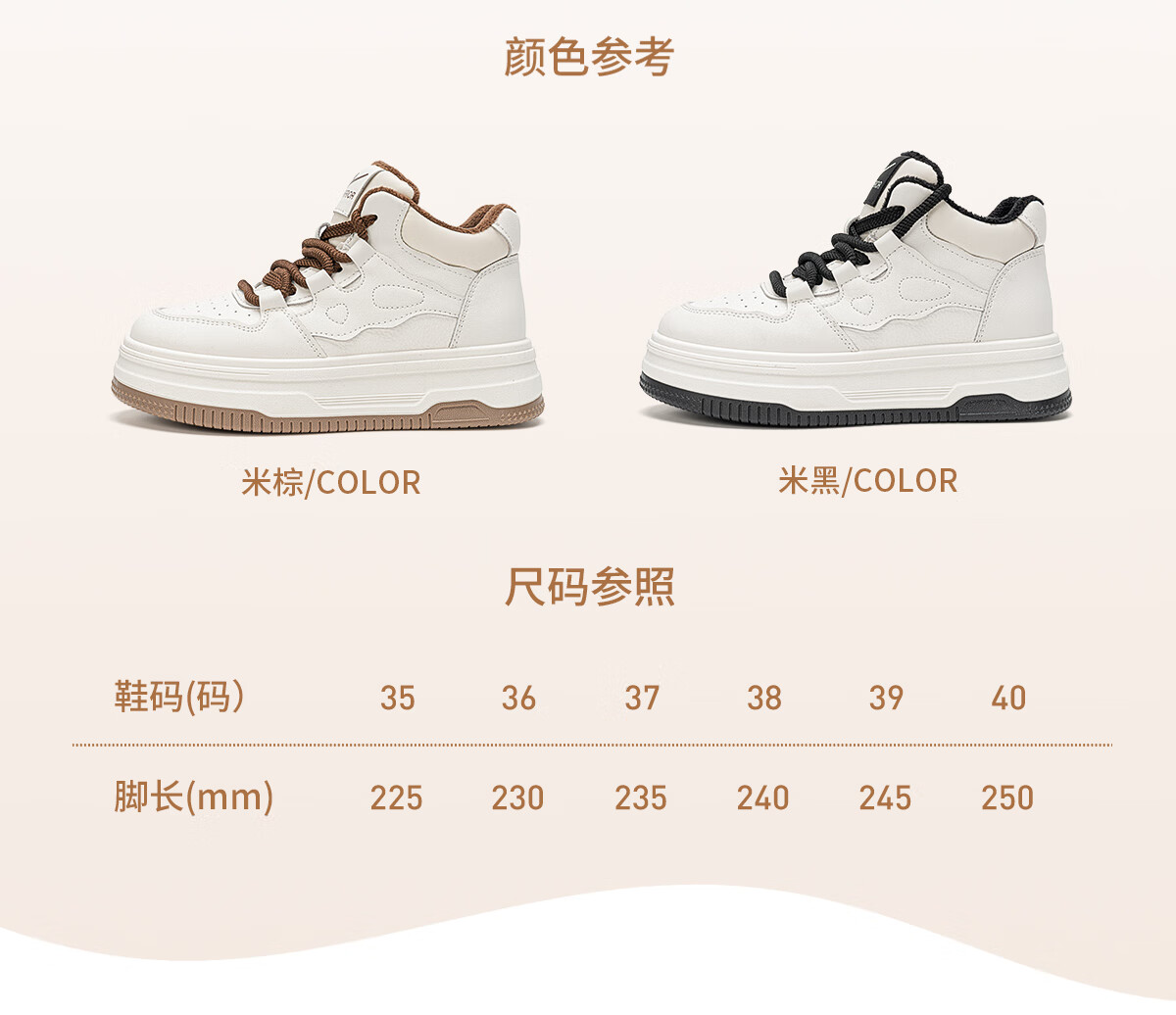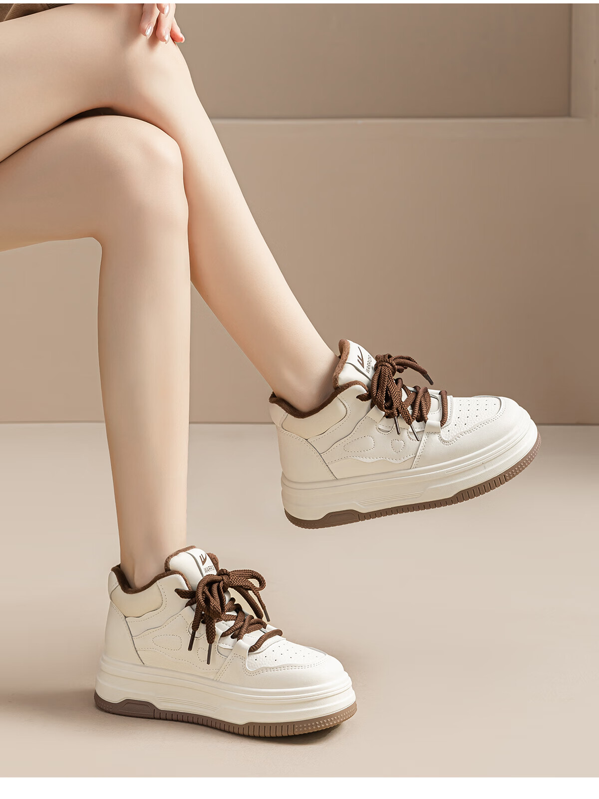 回力厚底高帮板鞋2025冬季女鞋新款加绒加厚保暖舒适百搭休闲增高棉鞋 白棕 35