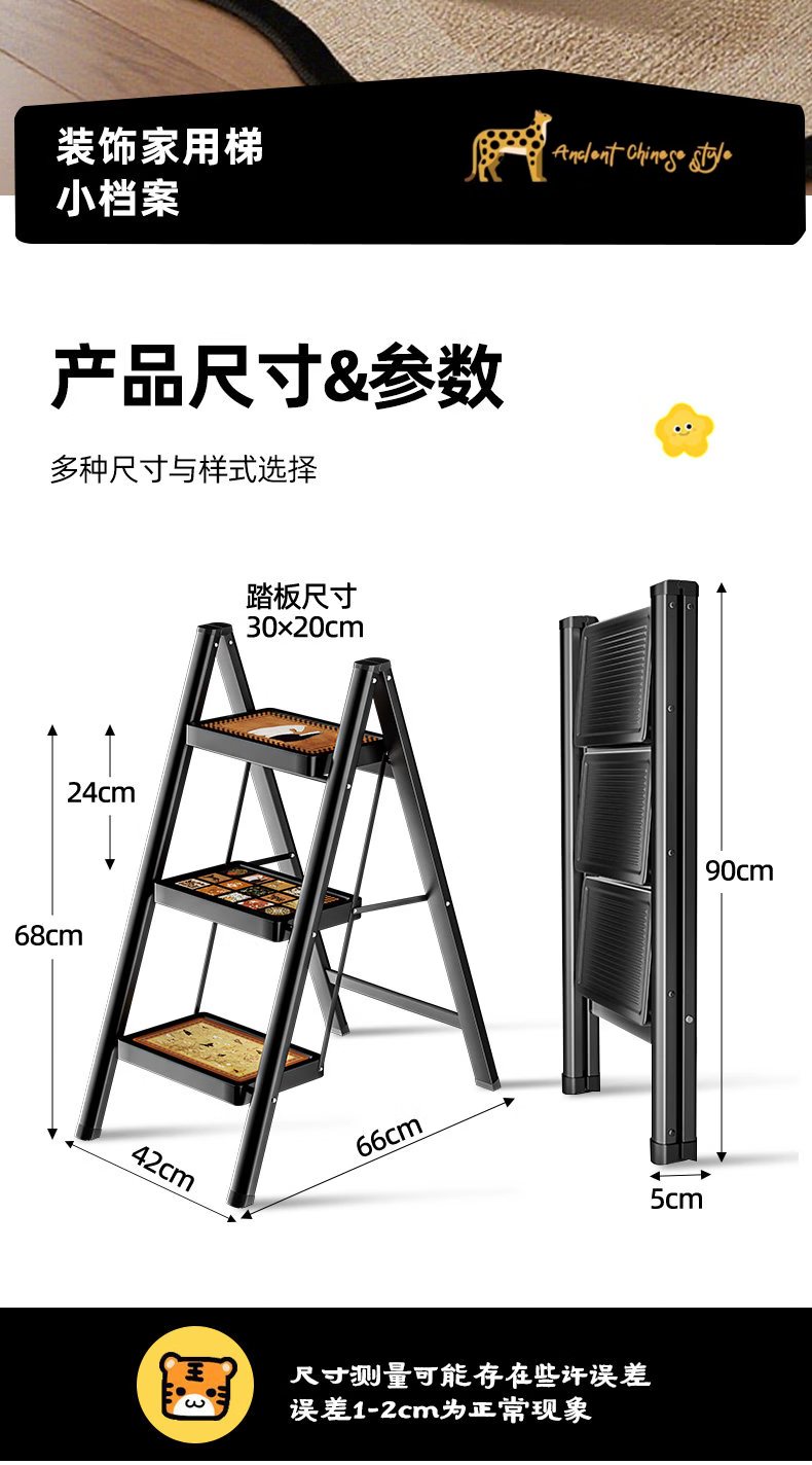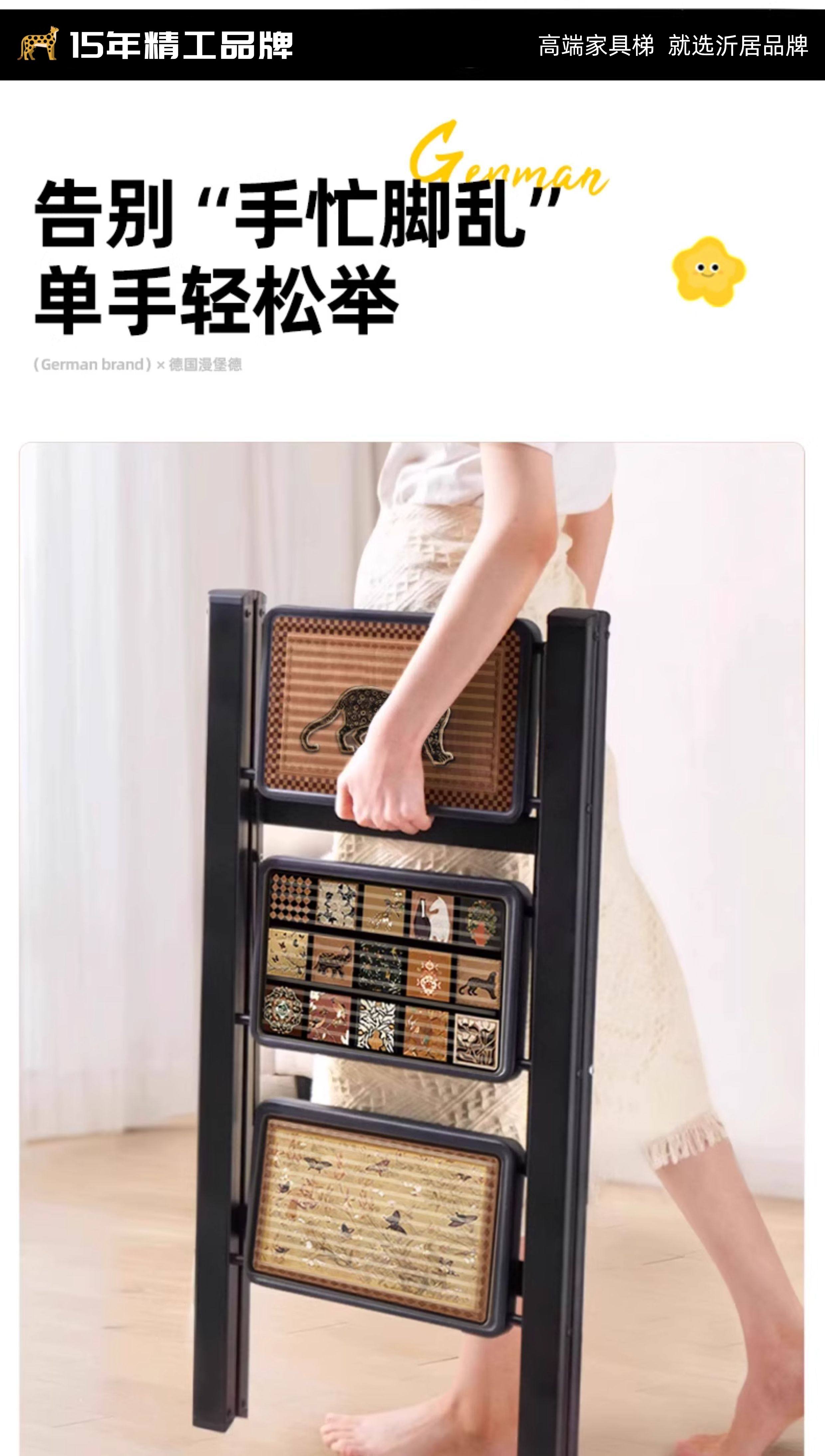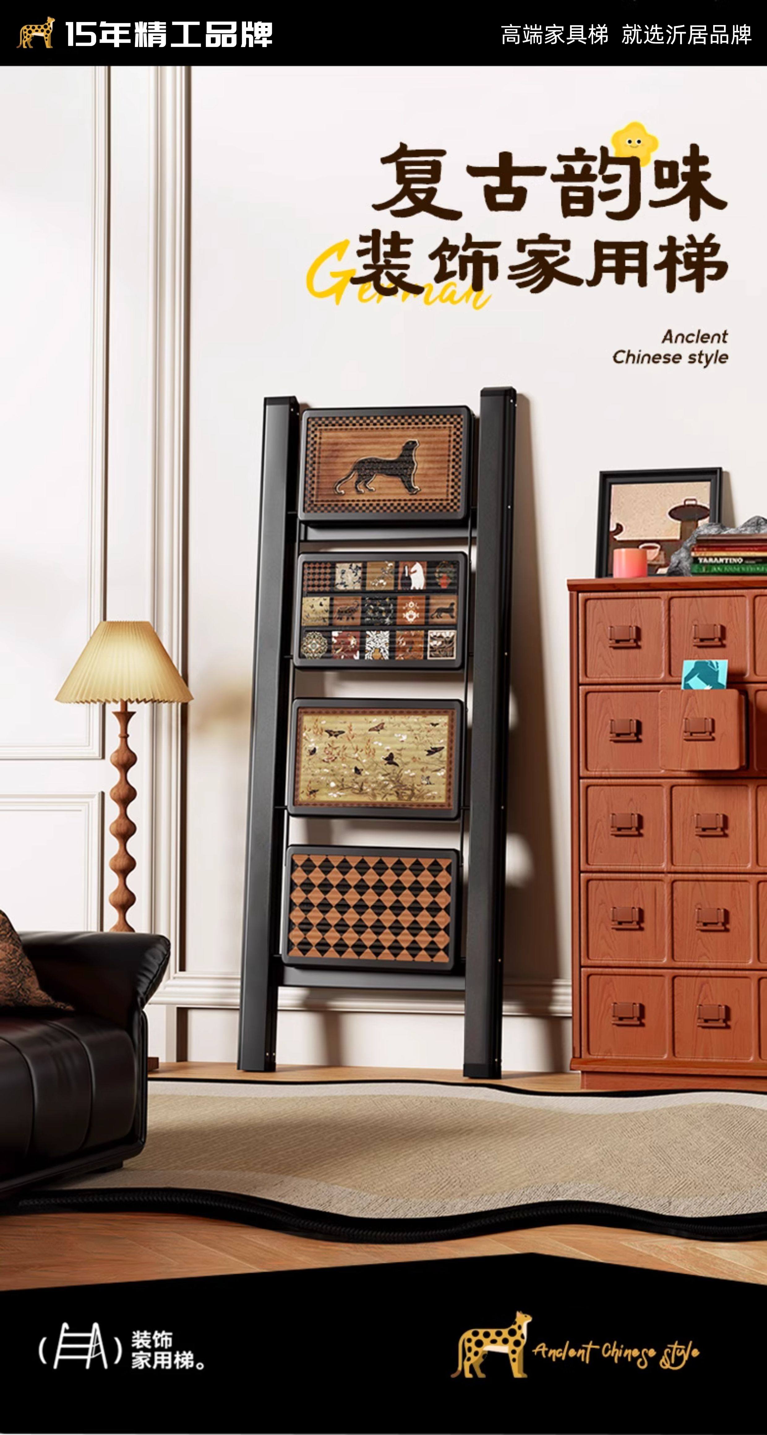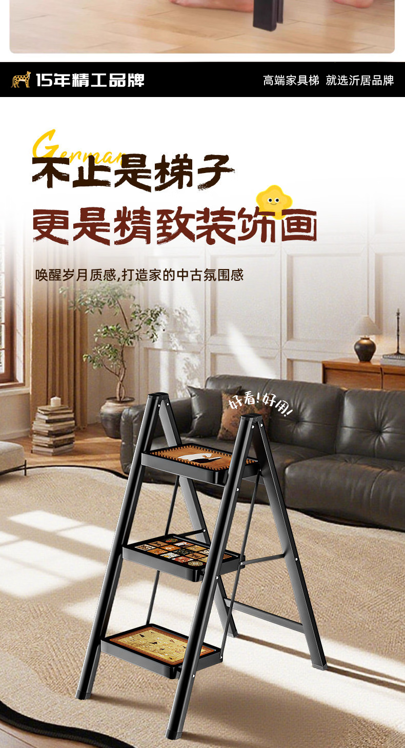 沂居家用折叠中古风梯子复古小梯子室内便携人字梯防滑加厚 复古氛围黑色二步梯【微喷印花耐磨不褪色】登高装饰