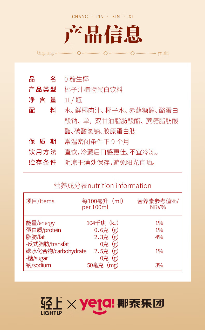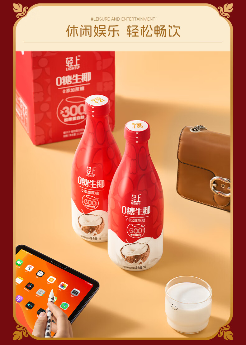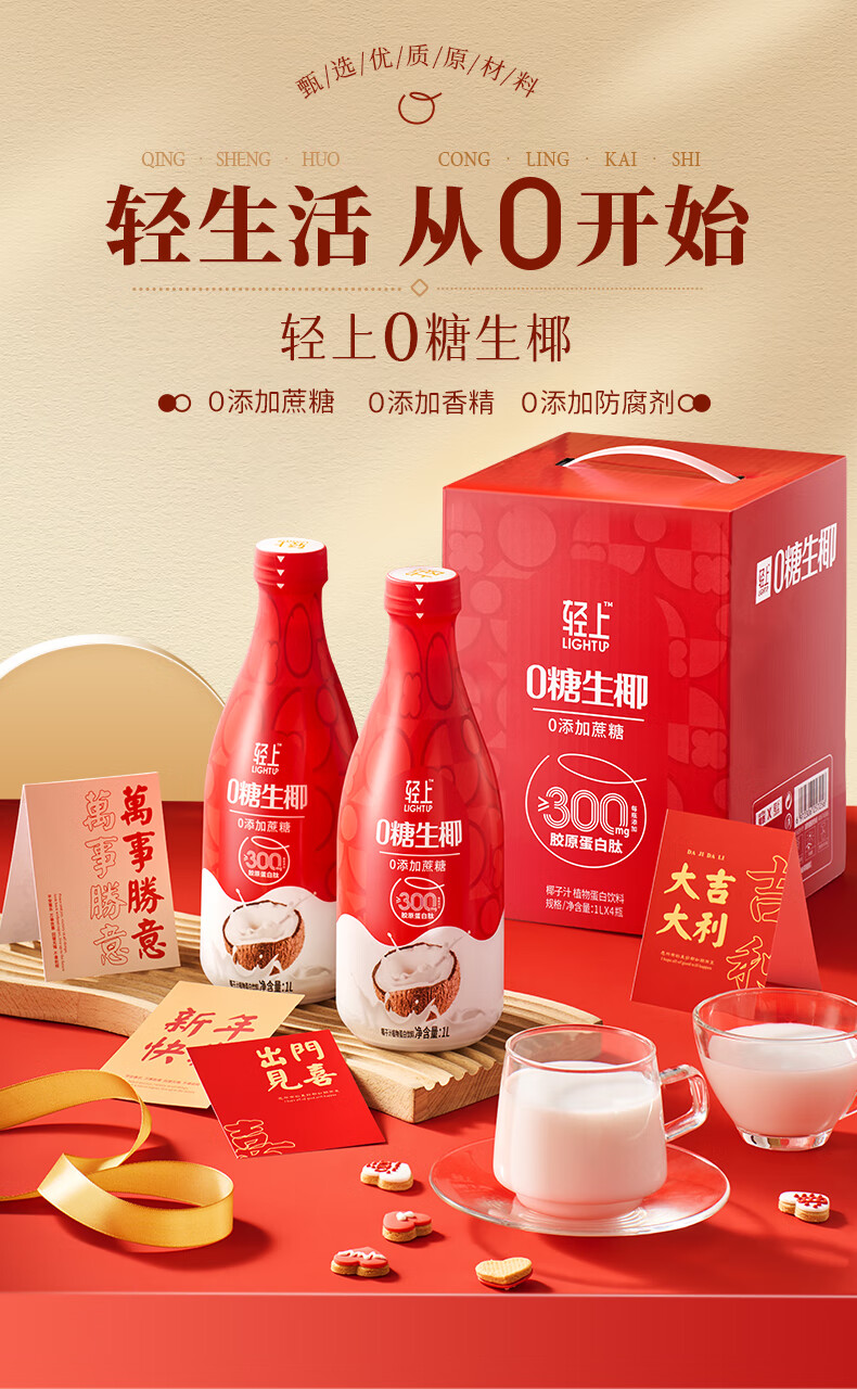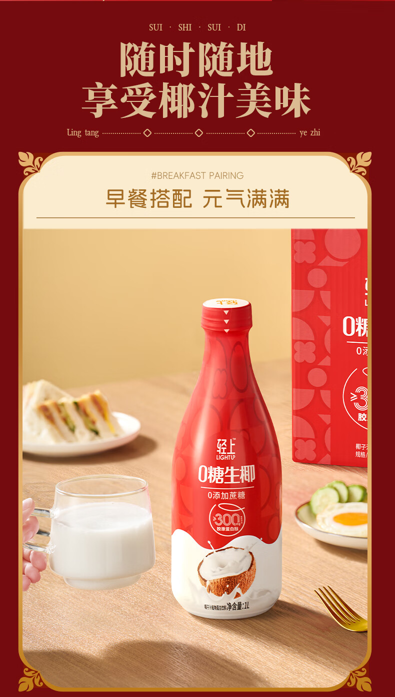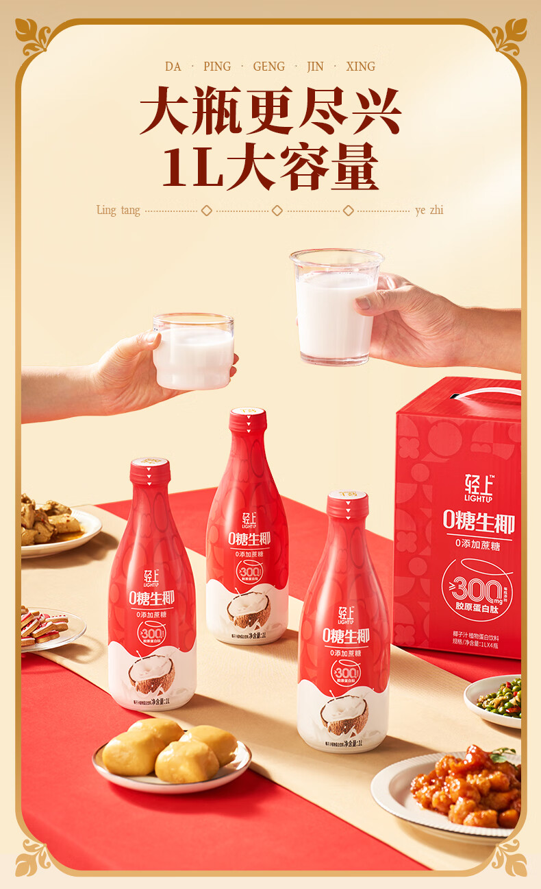 轻上椰汁0糖生椰1L大瓶东南亚进口椰子汁饮料整箱 铁皮石斛水400ml*6瓶