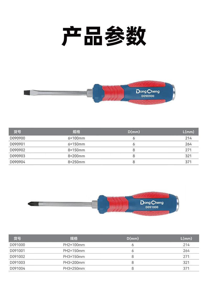 东成 双色塑柄十字/一字穿心螺丝批 PH3×200mm双色塑柄十字穿心螺丝批D091003