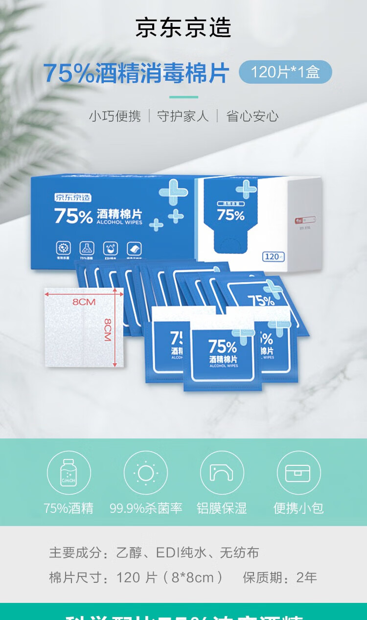 京东京造75%酒精棉片独立包装单片*120片 消毒湿巾纸杀菌卫生湿纸巾